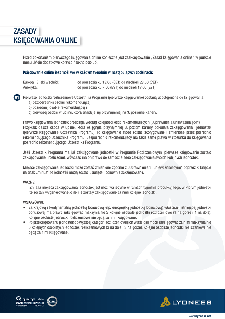 ZASADY KSIĘGOWANIA ONLINE Przed dokonaniem pierwszego księgowania online konieczne jest zaakceptowanie „Zasad księgowania online“ w punkcie menu „Moje dodatkowe korzyści“ (okno pop-up). Księgowanie online jest możliwe w każdym tygodniu w następujących godzinach: Europa i Bliski Wschód: Ameryka: od poniedziałku 13:00 (CET) do niedzieli 23:00 (CET) od poniedziałku 7:00 (EST) do niedzieli 17:00 (EST) 01 Pierwsze jednostki rozliczeniowe Uczestnika Programu (pierwsze księgowanie) zostaną udostępnione do księgowania: a) bezpośredniej osobie rekomendującej b) pośredniej osobie rekomendującej i c) pierwszej osobie w upline, która znajduje się przynajmniej na 3. poziomie kariery. Prawo księgowania jednostek przebiega według kolejności osób rekomendujących („Uprawnienia unieważniające“). Przykład: dalsza osoba w upline, która osiągnęła przynajmniej 3. poziom kariery dokonała zaksięgowania jednostek (pierwsze księgowanie Uczestnika Programu). To księgowanie może zostać skorygowane i zmienione przez pośrednio rekomendującego Uczestnika Programu. Bezpośrednio rekomendujący ma takie same prawa w stosunku do księgowania pośrednio rekomendującego Uczestnika Programu. Jeśli Uczestnik Programu ma już zaksięgowane jednostki w Programie Rozliczeniowym (pierwsze księgowanie zostało zaksięgowanie i rozliczone), wówczas ma on prawo do samodzielnego zaksięgowania swoich kolejnych jednostek. Miejsce zaksięgowania jednostki może zostać zmienione zgodnie z „Uprawnieniami unieważniającymi“ poprzez kliknięcie na znak „minus“ (-) jednostki mogą zostać usunięte i ponownie zaksięgowane. WAŻNE: Zmiana miejsca zaksięgowania jednostek jest możliwa jedynie w ramach tygodnia produkcyjnego, w którym jednostki te zostały wygenerowane, o ile nie zostały zaksięgowane za nimi kolejne jednostki. WSKAZÓWKI: • Za krajową i kontynentalną jednostką bonusową (np. europejską jednostką bonusową) właściciel istniejącej jednostki bonusowej ma prawo zaksięgować maksymalnie 2 kolejne osobiste jednostki rozliczeniowe (1 na górze i 1 na dole). Kolejne osobiste jednostki rozliczeniowe nie będą za nimi księgowane. • Po przeksięgowanu jednostek do wyższej kategorii rozliczeniowej ich właściciel może zaksięgować za nimi maksymalnie 6 kolejnych osobistych jednostek rozliczeniowych (3 na dole i 3 na górze). Kolejne osobiste jednostki rozliczeniowe nie będą za nimi księgowane. www.lyoness.net 02 Wszystkie udostępnione do zaksięgowania jednostki rozliczeniowe będą widoczne wg kolejności osób rekomendujących oraz linii rekomendacji. 03 Jednostki nowego Uczestnika Programu nie mogą zostać zaksięgowane, jeśli jednostki bezpośrednio rekomendującego znajdują się jeszcze w opcji wyboru. www.lyoness.net 04 Jednostki mogą zostać zaksięgowane w Księgowym Programie Rozliczeniowym tylko w miejscach oznaczonych znakiem „plus“ (+). 05 Pierwsze jednostki Uczestnika Programu (7 x KR I, 3 x KR II, 3 x KR III) mogą zostać zaksięgowane tylko binarnie. www.lyoness.net 06 Po kliknięciu na „Z powrotem“ można zmienić poziom przechodząc wyżej, natomiast klikając na „Do początku“ można powrócić do wybranej na początku jednostki. Dzięki temu nawigacja w Księgowym Programie Rozliczeniowym jest łatwiejsza. 07 W pierwszej kolejności należy wybrać jednostkę, aby następnie móc zaksięgować ją w wolnym miejscu. www.lyoness.net 08 Jeżeli jednostki nowego Uczestnika Programu (pierwsze księgowanie) nie zostaną zaksięgowane do piątku, do godziny 14:00 (CET), wówczas jednostki jego lifeline mogą zostać zaksięgowane przez kolejną osobę rekomendującą z upline, która ma zaksięgowane jednostki w Księgowym Programie Rozliczeniowym. Ta sama zasada dotyczy Ameryki: najpóźniej do piątku, do godziny 8:00. WSKAZÓWKA: Pierwsze księgowania muszą zostać zaksięgowane za osobistą jednostką (reszta korzyści / częściowo opłacone zamówienie bonów). Przy próbie pierwszego księgowania jednostek za jednostką z przeksięgowania lub za krajowymi/kontynentalnymi jednostkami bonusowymi, Uczestnik zostanie poinformowany o błędzie. 09 Jednostki muszą zostać zaksięgowane w kolejności rosnącej numerycznie (w kolejności numerów jednostek). 10 Księgowanie online jest możliwe do przeprowadzenia tylko w Osobistym Programie Rozliczeniowym. Krajowe i kontynentalne księgowania przeprowadzane są automatycznie przez program. 11 Księgowane mogą być tylko jednostki pochodzące z reszt korzyści i zamówień bonów opłaconych częściowo. 12 Uczestnicy Programu mogą zaksięgować jednostki w danej kategorii rozliczeniowej o ile posiadają w niej już zaksięgowaną jednostkę rozliczeniową. 13 Księgowanie może zostać skorygowane tylko gdy: a.) zalogowany Uczestnik Programu sam zaksięgował jednostki, b.) jednostki zostały zaksięgowane przez osobę rekomendującą i należą do Uczestnika z bezpośredniej lub pośredniej rekomendacji, c.) jednostki należą do zalogowanego Uczestnika Programu i zostały zaksięgowane przez osobę rekomendującą (nie dotyczy księgowania pierwszych jednostek). 14 Jeśli jednostki zostały zaksięgowane w Księgowym Programie Rozliczeniowym przez biuro Lyoness, mogą zostać zmienione przez Uczestnika Programu tylko poprzez Księgowanie online. 15 Jeśli jednostki nie zostały zaksięgowane ani online ani w oparciu o przesłane listy księgowania poprzez biuro Lyoness, zostaną one zaksięgowane w trakcie rozliczenia według zasady „Best Place“. W następstwie tego nie będzie możliwości dokonania zmiany. www.lyoness.net