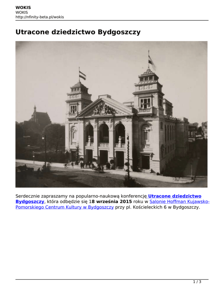 WOKIS WOKIS http://nfinity-beta.pl/wokis Utracone dziedzictwo Bydgoszczy Serdecznie zapraszamy na popularno-naukową konferencję Utracone dziedzictwo Bydgoszczy, która odbędzie się 18 września 2015 roku w Salonie Hoffman KujawskoPomorskiego Centrum Kultury w Bydgoszczy przy pl. Kościeleckich 6 w Bydgoszczy. 1/3 WOKIS WOKIS http://nfinity-beta.pl/wokis Działająca od 1992 roku Pracownia Dziedzictwa Kulturowego zgłębia tematykę związaną przede wszystkim z dziejami architektury i urbanistyki regionu kujawskopomorskiego. Historia pokazuje nam jak bardzo zmienia się oblicze wielu miejsc, stąd w zamyśle konferencji jest zobrazowanie na przykładzie Bydgoszczy przemian zachodzących w krajobrazie miejskim. W XX stuleciu bydgoskie dziedzictwo kulturowe uległo uszczupleniu oraz znacznym przekształceniom, referenci przybliżą wybrane aspekty tych zmian. Założeniem konferencji jest spopularyzowanie wiedzy i stworzenie wyobrażenia jak znikają i odchodzą w niepamięć, niekiedy na naszych oczach, elementy dziedzictwa składającego się na tak ważną lokalną tożsamość. 2/3 WOKIS WOKIS http://nfinity-beta.pl/wokis Plan konferencji: 1. 15.00 – 15.20 Otwarcie 2. 15.20 – 15.40 Lech Łbik – Gawęda o starym ratuszu bydgoskim 3. 15.40 – 16.00 Piotr Winter – Nieistniejące rzeźby i pomniki w przestrzeni miejskiej Bydgoszczy 4. 16.00 – 16.20 Agnieszka Wysocka – Gdzie te modne bydgoszczanki? 5. 16.20 – 16.40 przerwa 6. 16.40 – 17.00 Krzysztof Bartowski – Dzieje, rozwój i upadek bydgoskich stoczni 7. 17.00 – 17.20 Bogna Derkowska-Kostkowska – Gdzie rozbrzmiewał huk młotów i unosiły się dymy – zapomniane bydgoskie fabryki maszyn 8. 17.20 – 17.40 wykład zaproszonego gościa 9. 17.40 zakończenie konferencji i przerwa przed wernisażem wystawy: Nieistniejące dziedzictwo PRACOWNIA DZIEDZICTWA KULTUROWEGO Agnieszka Wysocka tel. 52 585 15 01 e-mail. [email protected] 2 piętro, pokój 208 Up. J. Waszak 23.07.2015 3/3 Powered by TCPDF (www.tcpdf.org)