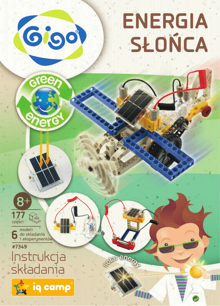 ENERGIA SŁOŃCA 177 części 6 modeli do składania i eksperymentów #7349 Instrukcja składania Spis treści To warto wiedzieć. Zalecenia ........................................................2 Lista części ................................................................................................3 Bateria słoneczna. Budowa ............................................................5 Bateria słoneczna. Zastosowanie ..............................................6 Tajemnice kół zębatych .....................................................................7 Tajemnice przekładni łańcuchowej ...........................................8 Sposoby i tajemnice przy składaniu .......................................9 Twoje przyszłe modele .......................................................................10 Model 1. Lokomotywa ...........................................................................11 Model 2. Buldożer ...................................................................................13 Model 3. Koparka ....................................................................................15 Model 4. Samolot ....................................................................................17 Model 5. Helikopter ...............................................................................19 Model 6. Helikopter dwuśrubowy ................................................21 1 To warto wiedzieć. Zalecenia Jeśli masz już 8 lat – ten zestaw klocków jest dla ciebie! W procesie składania modeli pomoże on rozwijać twoje zdolności – uwagę i logikę, wyobraźnię i fantazję. Buduj modele kolejno – od prostego do skomplikowanych: tak jest ciekawiej i bardziej poznawczo. Powodzenia ci, mistrzu! Uwaga rodzice • Klocki nie są przeznaczone dla dzieci do lat 3. W zestawie są drobne części – małe dziecko może je połknąć. Przechowujcie klocki w miejscu niedostępnym dla małych dzieci. W zestawie są drobne części – małe dziecko może je połknąć. Przechowujcie klocki w miejscu niedostępnym dla małych dzieci. • W zestawie jest żółta płytka, która nie jest wykorzystywana w modelach. To • jest klucz montażowy – on może łatwo rozebrać model, żeby zacząć robić nowy. ПPrzeczytaj wraz z dzieckiem nasze zalecenia i zasady wykorzystywania baterii i wyposażenia elektrycznego. Zalecenia, dotyczące bezpieczeństwa 1. Nie wkładać przewodów i wtyczek do gniazd elektrycznych 2. Bezsensownie i niebezpiecznie jest ponownie ładować zwykłe baterie, zamiast baterii można wykorzystywać akumulatory – można je wielokrotnie ponownie ładować, ale koniecznie pod nadzorem dorosłych 3. Zachowywać biegunowość baterii, wkładając je do uchwytu oraz biegunowość akumulatora, wkładając do ładowarki 4. Nie doprowadzać do zwarcia baterii i akumulatorów, nie rozbierać i nie rzucać je do ognia. 5. Wyjmować baterie i akumulatory z uchwytu, jeśli nie będziecie nimi bawić się przez dłuższy czas. Nieprawidłowe wykorzystywanie baterii i akumulatorów może doprowadzić do ich zniszczenia. Zużyte baterie i akumulatory utylizować jako odpady niebezpieczne. Zalecenia, dotyczące eksploatacji baterii słonecznej 1. Wykorzystywać baterię słoneczną w jasny dzień na dworzu 2. W pokoju jako źródło energii wykorzystywać uchwyt ze zwykłą baterią 1,5 V lub akumulatorem 1,2 V, standard AA (bateria i akumulator nie wchodzą w zestaw) 3. Przy oświetleniu baterii słonecznej lampą elektryczną nie narażać baterii na silne nagrzewanie – to zmniejsza skuteczność baterii i może doprowadzić do jej zniszczenia 4. Do podładowania od baterii słonecznej wykorzystywać tylko akumulator 2 Lista części Nr Nazwa części szt. Nr Nazwa części szt. 1 Ramka, 5 na 5 otw. 3 21 Belka, 11 otw. 3 2 Ramka, 5 na 10 otw. 2 22 Graniastosłup wklęsły, z kołkiem 6 3 Łyżka 1 23 Piasta do osi 2 4 Motoreduktor 1 24 Belka łukowa, 1 i 1 otw. 5 5 Oś długa, 15 cm 1 25 Zacisk do osi 2 6 Oś długa, 10 cm 2 26 Zatrzym 4 7 Oś krótka, 3 cm czarny 2 27 Element osiowy 5 8 Oś do reduktora biała 1 28 Kołek 20 9 Koło z oponą, 5 otw. 2 29 Przegub, 1 i 1 otw. 4 10 Kółko zębate Z60 4 30 Panel kołowy do osi, 2 otw. 3 11 Kółko zębate Z40 5 31 Ogniwo do łańcucha 53 12 Kółko zębate Z20 3 32 Złącze redukcyjne, 1 и 2 otw., proste 2 13 Koło łańcuchowe duże 2 33 Przemiennik 90о, R 8 90о, L 1 14 Koło łańcuchowe średnie 2 34 Przemiennik 15 Koło łańcuchowe małe 2 35 Przewód z wtyczkami czerwony 1 16 Belka, 3 otw. 8 36 Przewód z wtyczkami czarny 1 17 Belka, 5 otw. 6 37 Bateria słoneczna 1 18 Klucz montażowy 1 38 Uchwyt baterii żółty 1 19 Belka, 2 i 3 otw. 3 39 Uchwyt akumulatora czerwony 1 20 Belka, 7 i 7 otw. 3 Razem: 177 Rada Zaciski ustalane są na osi. Zaciski są potrzebne, żeby oś nie przemieszczała się w otworach ramek lub belek. Pomiędzy zaciskiem a ramką zostawiaj luz 1 mm, wtedy oś będzie się obracać łatwo i swobodnie! 3 Lista części 1 2 3 x3 4 x2 5 x1 x1 x1 6 7 x2 8 x2 12 9 x1 13 15 x2 18 x2 19 x1 30 x5 31 x3 36 26 x4 33 x2 x6 22 27 x8 x6 28 x5 34 37 x1 x8 x3 x2 32 x 53 x2 x3 25 x5 17 21 x3 x2 x4 16 20 24 11 x2 14 x3 23 10 x 20 x1 x1 39 x1 4 x4 35 38 x1 29 x1 Bateria słoneczna. Budowa Elektroda Powłoka antyblikowa Półprzewodnik typu n Półprzewodnik typu p Obciążenie Elektroda Prąd elektryczny Rys. 1 Trochę naukowo Fotokomórka – to jest specjalne urządzenie elektroniczne, przemieniające słoneczną energię świetlną w elektryczną. Fotokomórka zbudowana jest jak ciasto francuskie, każda warstwa ma swoją nazwę naukową i przeznaczenie techniczne, rys. 1. Zasada działania fotokomórki bazuje na zjawisku fotoelektrycznym – pod wpływem promieni słonecznych fotokomórka wytwarza na elektrodach fotokomórki napięcie, «plus» i «minus» (naukowo – różnica potencjałów). Jeśli do fotokomórki podłączyć obciążenie (odbiornik prądu), to przez ten odbiornik
