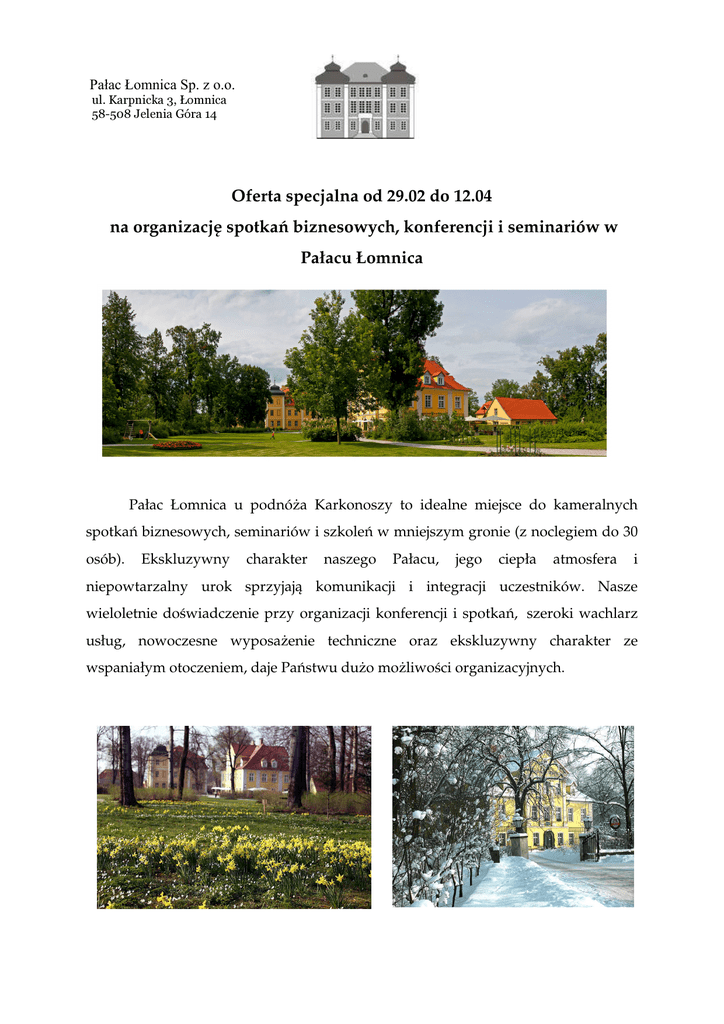 Pałac Łomnica Sp. z o.o. ul. Karpnicka 3, Łomnica 58-508 Jelenia Góra 14 Oferta specjalna od 29.02 do 12.04 na organizację spotkań biznesowych, konferencji i seminariów w Pałacu Łomnica Pałac Łomnica u podnóża Karkonoszy to idealne miejsce do kameralnych spotkań biznesowych, seminariów i szkoleń w mniejszym gronie (z noclegiem do 30 osób). Ekskluzywny charakter naszego Pałacu, jego ciepła atmosfera i niepowtarzalny urok sprzyjają komunikacji i integracji uczestników. Nasze wieloletnie doświadczenie przy organizacji konferencji i spotkań, szeroki wachlarz usług, nowoczesne wyposażenie techniczne oraz ekskluzywny charakter ze wspaniałym otoczeniem, daje Państwu dużo możliwości organizacyjnych. U nas przeniosą się Państwo do innego świata: profesjonalna obsługa, nasze indywidualne podejście do każdego Gościa, zapewnią, że Państwa spotkanie przyniesie zaskakująco pozytywne efekty… rozwój, innowacyjność i kreatywność wśród uczestników gwarantowane! Salon Różowy: Salon Różowy idealnie nadaje się do zorganizowania spotkania biznesowego w małym gronie, do 20 osób. Przyjazna, słoneczna atmosfera tego salonu, z jego wspaniałym widokiem na park, wspomaga przy tworzeniu kreatywnej, pozytywnej atmosfery każdego spotkania. W takim otoczeniu Nawet trudne problemy mogą być pozytywnie rozwiązane. Sala Niebieska: W sali z historycznymi freskami, eleganckim wyposażeniem i równie wspaniałym widokiem na park można zorganizować seminaria dla grup liczących do 40 osób. SALA Sala Różowa Sala Niebieska Bankietowe 24 32 Podkowa 20 35 Restauracja "Stara Stajnia" na Folwarku: Po wcześniejszym uzgodnieniu terminu proponujemy wynajęcie sali o długości ok. 30 metrów w byłej stajni. Nowoczesne wyposażenie konferencyjne zapewni idealną symbiozę pomiędzy historycznym położeniem a zgodną z wymaganiami czasu potrzebą. proponujemy miejsce dla 200 osób. Koszt wynajmu jednej z Sali : Wyposażenie: • • • • • • • Projektor multimedialny Telewizor DVD – TV – Video Rzutnik slajdów Rzutnik pisma Flipchart Mównica, mikrofon 500,00 zł - cały dzień 300,00 zł - pół dnia Zakwaterowanie Naszym gościom oferujemy 12 wygodnie urządzonych pokoi z łazienkami oraz 5 przytulnych dwupokojowych apartamentów dla 2-3 os. oraz 1 grupowe studio dla 4 - 5 os. Cena promocyjna wynosi: • Nocleg w pok. 1-osob. ze śniadaniem - 110,- zł /os. • Nocleg w pok. 2-osob. ze śniadaniem - 80,- zł /os. Pokoje różnią się charakterem i wielkością. Wszystkie wyposażone są w romantycznym, pałacowym stylu. Wyżywienie : Oferujemy Państwu wspaniałą , autentyczną dworską kuchnię polsko - śląską. Potrawy przygotowywane są zawsze ze świeżych produktów. Proponujemy do wyboru: Lunch już od 34,- zł/os. Obiad/Kolacja (2 dania) już od 45,- zł/os. Obiad/Kolacja (3 dania) już od 57,- zł/os. Kolacja tradycyjna już od 27,- zł/os. Przerwa na kawę i ciasto (pojedyncza) w cenie: 18,- zł/os. Przerwa na kawę, ciasto i owoce (ciągła) w cenie: 26,- zł/os. Na specjalne życzenie nasz szef kuchni przygotuje inne menu uwzględniając Państwa sugestie. Podajemy przykładową kalkulację: Przy 15 osobach: - całodzienna konferencja, kawa, ciasta i owoce, lunch 93,- zł/os. - całodzienna konferencja, kawa, ciasta i owoce, 3-daniowa kolacja, nocleg, śniadanie 196,- zł/os. Przy 20 osobach: - całodzienna konferencja, kawa, ciasta i owoce, lunch 85,- zł/os. - całodzienna konferencja, kawa, ciasta i owoce, 3-daniowa kolacja, nocleg, śniadanie 188,- zł/os. Pytania i rezerwacje: [email protected] tel. 75 71 30 460