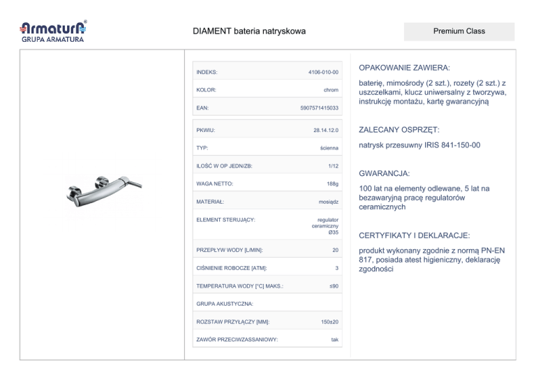 DIAMENT bateria natryskowa Premium Class INDEKS: 4106-010-00 KOLOR: chrom EAN: PKWIU: TYP: OPAKOWANIE ZAWIERA: baterię, mimośrody (2 szt.), rozety (2 szt.) z uszczelkami, klucz uniwersalny z tworzywa, instrukcję montażu, kartę gwarancyjną 5907571415033 28.14.12.0 ścienna ILOŚĆ W OP JEDN/ZB: 1/12 WAGA NETTO: 188g ZALECANY OSPRZĘT: natrysk przesuwny IRIS 841-150-00 GWARANCJA: MATERIAŁ: ELEMENT STERUJĄCY: PRZEPŁYW WODY [L/MIN]: CIŚNIENIE ROBOCZE [ATM]: TEMPERATURA WODY [°C] MAKS.: mosiądz regulator ceramiczny Ø35 20 3 ≤90 GRUPA AKUSTYCZNA: ROZSTAW PRZYŁĄCZY [MM]: ZAWÓR PRZECIWZASSANIOWY: 150±20 tak 100 lat na elementy odlewane, 5 lat na bezawaryjną pracę regulatorów ceramicznych CERTYFIKATY I DEKLARACJE: produkt wykonany zgodnie z normą PN-EN 817, posiada atest higieniczny, deklarację zgodności DIAMENT bateria natryskowa Premium Class DIAMENT bateria natryskowa Premium Class DIAMENT bateria natryskowa Premium Class DIAMENT bateria natryskowa Premium Class