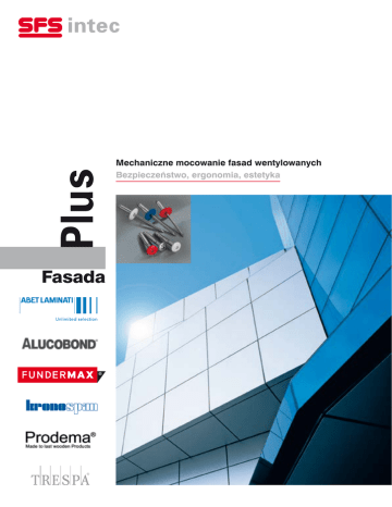 Mechaniczne mocowanie fasad wentylowanych Bezpieczeństwo, ergonomia, estetyka Fasada Spis treści 1 Mocowanie podkonstrukcji do ścian budynków Kotwy fasadowe stalowe Kotwy fasadowe tworzywowe m2 / m2-S4 MQL / MQLK Łączenie elementów podkonstrukcji Łączniki samowiercące ze stali nierdzewnej Nity Łączniki samowiercące ze stali węglowej SLA / SX / SDA / SN Mocowanie płyt elewacyjnych do podkonstrukcji aluminiowej i stalowej Łączniki samowiercące ze stali nierdzewnej Nity SX Mocowanie paneli kompozytowych do podkonstrukcji aluminiowej Łączniki samowiercące ze stali nierdzewnej SLA-D12 Mocowanie niemetalicznych płyt elewacyjnych do konstrukcji drewnianej Łączniki ze stali nierdzewnej do elementów drewnianych Uszczelnienie połączenia Łączniki samowiercące ze stali nierdzewnej TW-S / TW-S4 Niewidoczne mocowanie płyt typu HPL Łączniki ze stali nierdzewnej TU-S Specjalne mocowanie estetyczne płyt elewacyjnych Łączniki samogwintujące ze stali nierdzewnej GA-AS / GA-BS / GAZ Mocowanie fasad szklanych i płyt elewacyjnych Uchwyty fasadowe ALW-L / ALW-F / ALW-S Narzędzia i akcesoria Narzędzia i akcesoria Nitownice AccuBird® / PowerBird® Nitownice RM-25 / RM-20 Wkrętarka DI650 Końcówka / Tuleja FP-A Głowica DG 2 3 4 5 ASO SD-H15 / SD AP / ASO / SSO EPDM SCFW-S 02/2013 - PL Kotwy fasadowe Fasady wentylowane Mocowanie w betonie m2 m2 1 Informacje techniczne Zastosowanie Mocowanie wsporników i elementów podkonstrukcji fasad do betonu. Zalecane podłoże: Beton klasy C20/25 Materiał Łącznik m 2 Trzpień z galwanizowanej stali / tuleja rozprężna z austenitycznej stali nierdzewnej, gatunek AISI 304 (gatunek 1.4 301 według PN-EN) Podkładka o średnicy 15 mm z galwanizowanej stali / nakrętka (SW 13) z galwanizowanej stali Wzór zamówienia m2- 8,0x Zastosowanie Produkt Stal węglowa Typ d 80 L t m2- 8,0x 80 10 m2- 8,0x 95 25 Zakres stosowania Minimalna głębokość osadzania h1: 50 mm Zalecenia montażowe: Kotwę osadzać zawsze w górnym otworze wzdłużnym podstawy wspornika Odporność ogniowa Zalecane wiertło do betonu: Ø 8 mm: SDS4–Plus–8xL Akcesoria znajdują się w rozdziale FW 5 02/2013 - PL FW 1.1 Kotwy fasadowe Fasady wentylowane Mocowanie w betonie m2-S4 m2-S4 1 Informacje techniczne Zastosowanie Mocowanie wsporników i elementów podkonstrukcji fasad do betonu. Zalecane podłoże: Beton klasy C20/25 Materiał Łącznik m 2-S4 Trzpień i tuleja rozprężna z austenitycznej stali nierdzewnej, gatunek AI5I 316 (gatunek 1.4401 według PN-EN) Podkładka o średnicy 15 mm oraz nakrętka (SW13) z austenitycznej stali nierdzewnej, gatunek AI5I 316 (gatunek 1.4401 według PN-EN) Wzór zamówienia m2-S4- 8,0x 80 Zastosowanie Produkt Typ d L m2-S4- 8,0x 80 t Zakres stosowania Zastosowanie Produkt Stal nierdzewna Typ 8,0x d m2-S4- Zakres stosowania Stal nierdzewna L 80 t10 m2-S4- 8,0x 95 m2-S4- 8,0x 80 25 10 m2-S4- 8,0x 25 95 Minimalna głębokość osadzania h1: 50 mm Minimalna osadzania h1: 50 mm Zaleceniagłębokość montażowe: Kotwę osadzać zawsze w górnym otworze wzdłużnym Zalecenia montażowe: podstawy wspornika Kotwę osadzać zawsze w górnym otworze wzdłużnym podstawy wspornika Odporność ogniowa Odporność ogniowa Zalecane wiertło do betonu: Ø 8 mm: SDS4–Plus–8xL Zalecane wiertło do betonu: Ø 8 mm: SDS4–Plus–8xL Akcesoria znajdują się w rozdziale FW 5 FW 1.2 02/2013 - PL Fasady Ściany wentylowane wentylowane Kotwy fasadowe Kotwy fasadowe Mocowanie w betonie, dziurawce, pustaku Cegła cegle dziurawka, pustak, beton MQL MQL/ /MQLK MQLK MQL / MQLK 1 Informacje techniczne Zastosowanie Mocowanie drewnianych lub metalowych elementów podkonstrukcji fasad do: - cegły dziurawki - pustaków ceramicznych - bloczków lekkiego betonu - betonu komórkowego - betonu - pełnej cegły - kamieni naturalnych Materiał Łącznik ■ MQL / MQLK Element rozporowy: Wysokiej jakości poliamid Gniazdo, łeb: T40 = łeb stożkowy z gniazdem TORX® T40 HX = łeb sześciokątny, wymiar 13 mm H18 = łeb sześciokątny, wymiar 13 mm z kołnierzem i gniazdem TORX® T40 Wkręt: S4 = austenityczna stal nierdzewna, gatunek AISI 316 (gatunek 1.4401 według PN-EN) T = stal węglowa 5.8, galwanicznie cynkowana HD łeb / gniazdo ■ Łeb stożkowy z gniazdem T40 ■ Łeb sześciokątny 13 mm A/F ■ Łeb sześciokątny H18 13 mm A/F Narzędzia i akcesoria DI 650 DB 620 11 ■ Wiertarka udarowa do wiercenia wstępnego w betonie i pełnej cegle. ■ Wkrętarka elektryczna do montażu łączników samowiercących i samogwintujących. Akcesoria znajdują FW12 5 Akcesoria znajdująsię sięwwrozdziale rozdziale 02/2013 - PL 02/2012 - PL 11. 5 FW 1.3 Kotwy fasadowe Kotwy Mocowanie w betonie, cegle dziurawce, pustaku Cegła dziurawka, pustak, beton Ściany wentylowane Fasady wentylowane MQL//MQLK MQLK MQL Informacje do zamówienia 1 Łeb stożkowy Łeb Łeb z gniazdem T40 sześciokątny sześciokątny 13 mm A/F H18 13 mm A/F d KL L KL Grubość łączonych elementów | HD łeb / gniazdo | W - Materiał i średnica podkładki | d średnica gwintu | L długość całkowita | Wszystkie wymiary w mm Zastosowanie Wzór zamówienia MQLT40- 10,0x 80 Aprobata Type HD d L Produkt Stal węglowa Stal węglowa Stal węglowa z Stal nierdzewna A4 11 KL Zakres stosowania MQLMQLMQLMQLMQLMQLMQL- T40T40T40T40T40T40T40- 10,0x 10,0x 10,0x 10,0x 10,0x 10,0x 10,0x 80 100 120 140 160 180 200 10 30 50 70 90 110 130 Minimalna Minimalna głębokość głębokość osadzenia: osadzenia: 70 mm mm MQLMQLMQLMQLMQLMQLMQL- HXHXHXHXHXHXHX- 10,0x 10,0x 10,0x 10,0x 10,0x 10,0x 10,0x 80 100 120 140 160 180 200 10 30 50 70 90 110 130 Minimalna głębokość głębokość osadzenia: osadzenia: 70 mm mm Minimalna MQLKMQLKMQLK- H18- 10,0x 80 10 H18- 10,0x 100 30 H18- 10,0x 120 50 MQL-S4MQL-S4MQL-S4MQL-S4MQL-S4MQL-S4MQL-S4- T40T40T40T40T40T40T40- 10,0x 10,0x 10,0x 10,0x 10,0x 10,0x 10,0x 80 100 120 140 160 180 200 10 30 50 70 90 110 130 Obszar zastosowań - Cegła Cegła dziurawka dziurawka - Pus