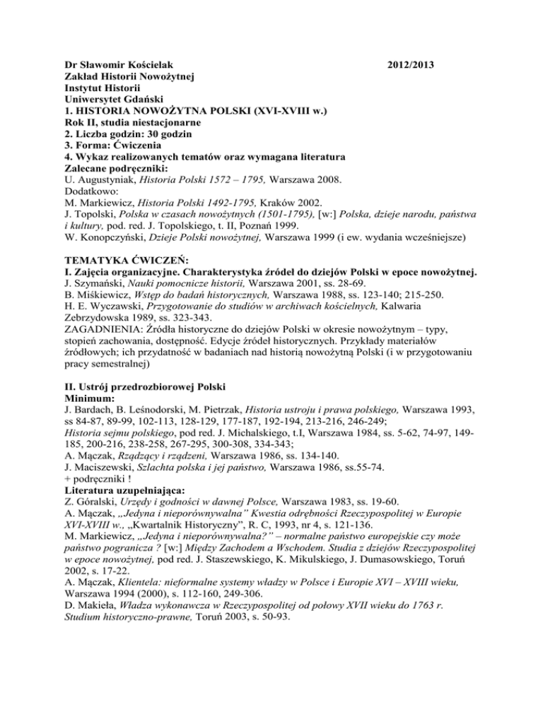 Dr Sławomir Kościelak 2012/2013 Zakład Historii Nowożytnej Instytut Historii Uniwersytet Gdański 1. HISTORIA NOWOŻYTNA POLSKI (XVI-XVIII w.) Rok II, studia niestacjonarne 2. Liczba godzin: 30 godzin 3. Forma: Ćwiczenia 4. Wykaz realizowanych tematów oraz wymagana literatura Zalecane podręczniki: U. Augustyniak, Historia Polski 1572 – 1795, Warszawa 2008. Dodatkowo: M. Markiewicz, Historia Polski 1492-1795, Kraków 2002. J. Topolski, Polska w czasach nowożytnych (1501-1795), [w:] Polska, dzieje narodu, państwa i kultury, pod. red. J. Topolskiego, t. II, Poznań 1999. W. Konopczyński, Dzieje Polski nowożytnej, Warszawa 1999 (i ew. wydania wcześniejsze) TEMATYKA ĆWICZEŃ: I. Zajęcia organizacyjne. Charakterystyka źródeł do dziejów Polski w epoce nowożytnej. J. Szymański, Nauki pomocnicze historii, Warszawa 2001, ss. 28-69. B. Miśkiewicz, Wstęp do badań historycznych, Warszawa 1988, ss. 123-140; 215-250. H. E. Wyczawski, Przygotowanie do studiów w archiwach kościelnych, Kalwaria Zebrzydowska 1989, ss. 323-343. ZAGADNIENIA: Źródła historyczne do dziejów Polski w okresie nowożytnym – typy, stopień zachowania, dostępność. Edycje źródeł historycznych. Przykłady materiałów źródłowych; ich przydatność w badaniach nad historią nowożytną Polski (i w przygotowaniu pracy semestralnej) II. Ustrój przedrozbiorowej Polski Minimum: J. Bardach, B. Leśnodorski, M. Pietrzak, Historia ustroju i prawa polskiego, Warszawa 1993, ss 84-87, 89-99, 102-113, 128-129, 177-187, 192-194, 213-216, 246-249; Historia sejmu polskiego, pod red. J. Michalskiego, t.I, Warszawa 1984, ss. 5-62, 74-97, 149185, 200-216, 238-258, 267-295, 300-308, 334-343; A. Mączak, Rządzący i rządzeni, Warszawa 1986, ss. 134-140. J. Maciszewski, Szlachta polska i jej państwo, Warszawa 1986, ss.55-74. + podręczniki ! Literatura uzupełniająca: Z. Góralski, Urzędy i godności w dawnej Polsce, Warszawa 1983, ss. 19-60. A. Mączak, „Jedyna i nieporównywalna” Kwestia odrębności Rzeczypospolitej w Europie XVI-XVIII w., „Kwartalnik Historyczny”, R. C, 1993, nr 4, s. 121-136. M. Markiewicz, „Jedyna i nieporównywalna?” – normalne państwo europejskie czy może państwo pogranicza ? [w:] Między Zachodem a Wschodem. Studia z dziejów Rzeczypospolitej w epoce nowożytnej, pod red. J. Staszewskiego, K. Mikulskiego, J. Dumasowskiego, Toruń 2002, s. 17-22. A. Mączak, Klientela: nieformalne systemy władzy w Polsce i Europie XVI – XVIII wieku, Warszawa 1994 (2000), s. 112-160, 249-306. D. Makieła, Władza wykonawcza w Rzeczypospolitej od połowy XVII wieku do 1763 r. Studium historyczno-prawne, Toruń 2003, s. 50-93. ZAGADNIENIA: System ustrojowy Rzplitej – monarchia mieszana, demokracja szlachecka czy oligarchia magnacka ? Podział administracyjny kraju; zasady funkcjonowania unii realnej, odpowiedzialność za państwo; struktury władzy państwowej, uprawnienia – monarchy, sejmu, senatu; urzędy i organy władzy centralnej, urzędy lokalne; zasady funkcjonowania sejmu i sejmików. III. Prawo. Litera i praktyka. Minimum: J. Bardach i in., Historia ustroju i prawa polskiego, Warszawa 1993, s. 187-198, 239-243, 251-281. T. Maciejewski, Historia prawa sądowego Polski. Zarys wykładu, Koszalin 1998, s. 12-122. W. Bednarek, Trybunał Koronny. Szlachecki sąd najwyższy w latach 1578 – 1794, Lublin 2008, s. 33 – 126, 199 – 228. Literatura uzupełniająca: M. Woźniakowa, Sąd asesorski koronny, Warszawa 1990, s. 22-26, 341-352. A. Karpiński, Kobieta w mieście polskim w II połowie XVI i w XVII w. ,Warszawa 1995, s.2247. Abramski, Sądy kapturowe ostatniego bezkrólewia W: Dawne sądy i prawo, pod red. A. Lityńskiego, Katowice 1984, s. 30-50. M. Mikołajczyk, Przestępstwo i kara w prawie miast Polski południowej XVI-XVIII wieku, Katowice 1998, s. 96-169. D. Makiłła, Z. Naworski, Historia prawa na ziemiach polskich. Zarys wykładu, T. 1, Toruń 1995. M. Borucki, Temida staropolska, Warszawa 2001, s. 23 – 109. Z. Zdrójkowski, „Praktyka kryminalna” Jakuba Czechowcza, jej źródła i system na tle rozwoju współczesnego prawa karnego zachodniej Europy”, Roczniki TNT, 53, 1948, z.2 , s.33-57, 71-89. W. Łoziński, Prawem i lewem, Kraków 1957, t.1, s.6-76. (również wydania późniejsze) J. Kitowicz, Opis obyczajów za panowania Augusta III, Warszawa 1985, s.108-155 (wydania inne też) ZAGADNIENIA: definicje i zakres prawa, prawo zwyczajowe, prawo pozytywne, prawo naturalne, struktura prawa, źródła prawa; stanowy charakter prawa, partykularyzm osobowy i terytorialny, kodyfikacje prawa w Rzplitej; System sądownictwa Rzplitej: sądy grodzkie, sądy ziemskie, sądy podkomorskie, trybunał koronny, sądownictwo miejskie, patrymonialne. Prawo procesowe, środki dowodowe, postępowanie inkwizycyjne, struktura przestępczości, katalog kar. IV. Gospodarka w Polsce okresu przedrozbiorowego Minimum J. Topolski, Gospodarka polska a europejska w XVI-XVIII w., Poznań 1977, ss. 71-127. (+ wznowienia) E. Cieślak, Powojenne załamanie gospodarcze – pierwsze przejawy ożywienia gospodarczego w połowie XVIII w., [w:] Historia Pomorza, pod red. G. Labudy, T. II, cz. 2, Poznań 1984, s. 51-122. A. Dunin-Wąsowicz, Pomiary gruntu w Koronie w XVI-XVIII w., Warszawa 1994, s. 61-73. K. Zamorski, Folwark i wieś. Gospodarka dworska i społeczność chłopska Tenczynka w latach 1705-1745, Wrocław 1989. Literatura uzupełniająca: J. Topolski, Gospodarstwo wiejskie w dobrach arcybiskupstwa gnieźnieńskiego od XVI do XVIII w., Poznań 1958. S. Cackowski, Gospodarstwo wiejskie w dobrach biskupstwa i kapituły chełmińskiej w XVIIXVIII wieku, Część 1 – Gospodarstwo chłopskie, „Roczniki TNT”, R. 64, 1959, z. 2, s. 65236. A. Mączak, Rozwój folwarku pańszczyźnianego [w:] Dzieje gospodarcze Polski do r. 1939, Warszawa 1980, ss. 135-225. ZAGADNIENIA: Dualizm ekonomiczny w rozwoju nowożytnej Europy; geneza gospodarki folwarcznej w Polsce, sposoby gospodarowania i