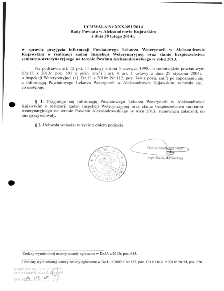UCHWAŁA Nr XXX/451/2014 Rady Powiatu w Aleksandrowie Kujawskim z dnia 28 lutego 2014r. w sprawie przyjęcia informacji Powiatowego Lekarza Weterynarii w Aleksandrowie Kujawskim o realizacji zadań Inspekcji Weterynaryjnej oraz stanic bezpieczeństwa sanitarno-weterynaryjnego na terenie Powiatu Aleksandrowskiego w roku 2013. Na podstawie art. 12 pkt. 11 ustawy z dnia 5 czerwca 1998r. o samorządzie powiatowym (Dz.U. z 2013r. póz. 595 z późn. zm. 1 ) i art. 4 ust. l ustawy z dnia 29 stycznia 2004r. o Inspekcji Weterynaryjnej (t.j. Dz.U. z 2010r. Nr 112, póz. 744 z późn. zm.2) po zapoznaniu się z informacją Powiatowego Lekarza Weterynarii w Aleksandrowie Kujawskim, uchwala się, co następuje: § 1. Przyjmuje się informację Powiatowego Lekarza Weterynarii w Aleksandrowie Kujawskim o realizacji zadań Inspekcji Weterynaryjnej oraz stanie bezpieczeństwa sanitarnoweterynaryjnego na terenie Powiatu Aleksandrowskiego w roku 2013, stanowiącą załącznik do niniejszej uchwały. § 2. Uchwała wchodzi w życie z dniem podjęcia. c^_"—~—^ 'Zmiany wymienionej ustawy zostały ogłoszone w Dz.U. z2013r. póz. 645. 2 Zmiany wymienionej ustawy zostały ogłoszone w Dz.U. z 2009 r. Nr 157, póz. 1241; Dz.U. z 2011 r. Nr 54, póz. 278. Sprawdź, pod.wzgi. iortmin.RADCA PRAWNY A««* 0. Załącznik do Uchwały Nr XXX/451/2014 Rady Powiatu w Aleksandrowie Kujawskim z dnia 28 lutego 2014r. Informacja Powiatowego Lekarza Weterynarii w Aleksandrowie Kujawskim o realizacji zadań Inspekcji Weterynaryjnej oraz stanie bezpieczeństwa sanitarno-weterynaryjnego na terenie powiatu aleksandrowskiego w roku 2013. Zgodnie z ustawą o Inspekcji Weterynaryjnej Powiatowy Lekarz Weterynarii przy pomocy Powiatowego Inspektoratu Weterynarii realizuje zadania z zakresu ochrony zdrowia zwierząt oraz bezpieczeństwa produktów pochodzenia zwierzęcego w celu zapewnienia ochrony zdrowia publicznego. I. Zwalczanie chorób zakaźnych zwierząt. l . W ramach kontroli występowania chorób zakaźnych zwierząt w 2013 roku przeprowadzono następujące badania kontrolne: Jednostka chorobowa Ilość wyników dodatnich Ilość sztuk Ilość stad zbadanych zbadanych Gruźlica bydła 4966 212 0 Enzootyczna białaczka bydła 1136 157 0 Bruceloza bydła 1392 165 0 2 1 0 Bruceloza owiec 16 3 0 Choroba pęcherzykowa świń 10 10 0 Wścieklizna lisów wolno żyjących 47 - 0 Wysoce zjadliwa grypa ptaków 75 5 0 Pryszczyca 10 10 0 6 - 0 15 15 0 3795 1013 0 Choroba niebieskiego języka 56 8 0 1 B R/1 P V, Gorączka Q 28 4 0 Bruceloza kóz Klasyczny pomór świń ( u dzików) Klasyczny pomór świń ( u świń ) Choroba Aujeszky'ego 2. W ramach zwalczania wścieklizny u zwierząt: "* - zaszczepiono przeciwko wściekliźnie 5639 psów u 4175 właścicieli i 33 koty u 33 właścicieli, - dwukrotnie przeprowadzono akcję doustnej immunizacji lisów wolno żyjących, - przeprowadzono 81 dochodzenia epizootycznych i 74 obserwacji zwierząt w związku z podejrzeniem wystąpienia wścieklizny u: • 73 psów, • Na terenie powiatu l kota, w roku 2013 nie stwierdzono przypadków ognisk wścieklizny. ^ Sytuację epizootyczną w zakresie wścieklizny należy ocenić jako dobrą. Poprawy nadal wymaga wywiązywanie się właścicieli psów z obowiązku poddawania ich szczepieniu oraz wzrost świadomości właścicieli kotów, w zakresie znaczenia dobrowolnego szczepienia, szczególnie w sąsiedztwie bytowania zwierząt dzikich. Do poważnych przeszkód w zwalczaniu wścieklizny na terenie pow. aleksandrowskiego należy zaliczyć: - brak na terenie powiatu schroniska dla zwierząt bezpańskich, - brak zawartych, przez niektóre samorządy, umów z lekarzami weterynarii, regulujących sprawy usług weterynaryjnych wykonywanych na zwierzętach ^ bezpańskich, w ramach ustawowych zadań gmin. 3. W ramach zwalczania enzootycznej białaczki bydła (ebb) w 2013 roku badaniami objęto 1/5 stad bydła w wieku powyżej 2 lat. Powyższe postępowanie wynikało z uznania decyzją Komisji 2008/234/WE z dnia 18 marca 2008 obszaru powiatu za urzędowo wolny od ebb. Uznanie to skutkuje znacznym ułatwieniem w obrocie bydłem dla jego właścicieli i jednocześnie pozwala na zmniejszenie częstotliwości badań oraz zmniejszenie wydatków z budżetu państwa. Należy podkreślić, że zmniejszenie występowania tej choroby bezwzględnego przestrzegania wymaga decyzji o wstrzymaniu obrotu zwierzętami w "* gospodarstwach zapowietrzonych i dokonywania zakupu zwierząt wyłącznie ze stad 1 urzędowo wolnych od chorób zakaźnych. 4. W ramach wykrywania i zwalczania BSE i TSE przeprowadzono badania laboratoryjne: - 96 sztuk bydła padłego, - 2 sztuk bydła poddanych ubojowi. 11 owiec i 3 kóz Wszystkie badania dały wynik ujemny. 5. W ramach wykrywania i zwalczania brucelozy przeprowadzono 1 dochodzenie epizootyczne w związku z podejrzeniem wystąpienia brucelozy świń - z wynikiem ujemnym. 6. W ramach wykrywania i zwalczania gruźlicy bydła nie stwierdzono przypadków podejrzeń występowania powyższej jednostki w ramach prowadzonych badań kontrolnych. 7. W ramach nadzorowania występowania pozostałych zoonoz lub czynników zoonotycznych: - przeprowadzono 3 dochodzenia epizootycznych w związku ze stwierdzeniem pałeczek Salmonella w stadach drobiu. 8. W ramach zabezpieczenia powiatu przed wystąpieniem infekcji grypy zwierząt gospodarskich (drób, świnie): - utrzymuje i aktualizuje się stan zapasów magazynowych sprzętów, materiałów i środków biobójczych, zgromadzonych na wypadek wystąpienia na terenie powiatu ogniska choroby, - na bieżąco omawiane są nowe okoliczności związane z wystąpieniem przypadków grypy zwierząt gospodarskich, w ramach spotkań szkoleniowych z lekarzami wolnej praktyki. 9. W roku 2013 Powiatowy Lekarz Weterynarii pełnił nadzór nad podmiotami prowadzącymi działalność w zakresie: - gromadzenie zwłok zwierzęcych i/lub zbieranie ubocznych produktów zwierzęcych - 2 podmioty, 2 kontrole, - hodowle zwierz