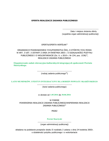OFERTA REALIZACJI ZADANIA PUBLICZNEGO ........................................................... Data i miejsce złożenia oferty (wypełnia organ administracji publicznej) OFERTA/OFERTA WSPÓLNA1) ORGANIZACJI POZARZĄDOWEJ(-YCH)/PODMIOTU(-ÓW), O KTÓRYM(-YCH) MOWA W ART. 3 UST. 3 USTAWY Z DNIA 24 KWIETNIA 2003 r. O DZIAŁALNOŚCI POŻYTKU PUBLICZNEGO I O WOLONTARIACIE (Dz. U. z 2010 r. Nr 234, poz. 1536)1), REALIZACJI ZADANIA PUBLICZNEGO Organizowanie zadań rekreacyjno-kulturalnych integrujących społeczność Powiatu Skarżyskiego. ......................................................... (rodzaj zadania publicznego2)) LATO MUMINKÓW. I FESTYN INTEGRACYJNY DLA RODZIN POWIATU SKARŻYSKIEGO ......................................................... (tytuł zadania publicznego) w okresie od 1.05.2016 do 30.06.2016 W FORMIE POWIERZENIA REALIZACJI ZADANIA PUBLICZNEGO/WSPIERANIA REALIZACJI ZADANIA PUBLICZNEGO1) PRZEZ Powiat Skarżyski ....................................................... (organ administracji publicznej) składana na podstawie przepisów działu II rozdziału 2 ustawy z dnia 24 kwietnia 2003r. o działalności pożytku publicznego i o wolontariacie I. Dane oferenta/oferentów1), 3) 1) nazwa: Stowarzyszenie Rodzin 2) forma prawna:4) ( ) stowarzyszenie ( ) fundacja ( ) kościelna osoba prawna ( ) kościelna jednostka organizacyjna ( ) spółdzielnia socjalna ( ) inna............................................. 3) numer w Krajowym Rejestrze Sądowym, w innym rejestrze lub ewidencji:5) 000444555. 4) data wpisu, rejestracji lub utworzenia:6) . 1.01.2012 5) nr NIP: 663 19 15 443 nr REGON: 12325654 6) adres: miejscowość: Skarżysko-Kamienna. ul.: Słoneczna dzielnica lub inna jednostka pomocnicza:7) gmina: Skarżysko-Kamienna powiat:8) Skarżyski województwo: Świętokrzyskie kod pocztowy: 26-110 poczta: Skarżysko-Kamienna 7) tel.: 500 500 500 faks: e-mail: [email protected] http:// 8) numer rachunku bankowego: 10 1020 2222 3333 4444 5555 666 nazwa banku: Nasz Bank 9) nazwiska i imiona osób upoważnionych do reprezentowania oferenta/oferentów1): a) Anna Kowalska - prezes zarządu. b) Jan Kowalski – wiceprezes zarządu c) ......................................................................................................................................... Nazwiska i imiona osób upoważnionych do reprezentowania oferenta muszą być zgodne z aktualnymi zapisami KRS. 10) nazwa, adres i telefon kontaktowy jednostki organizacyjnej bezpośrednio wykonującej zadanie, o którym mowa w ofercie:9) Stowarzyszenie Rodzin ul. Słoneczna 25 26-110 Skarżysko-Kamienna Tel. 500 500 500 11) osoba upoważniona do składania wyjaśnień dotyczących oferty (imię i nazwisko oraz nr telefonu kontaktowego) Anna Kowalska – tel 222 333 444 12) przedmiot działalności pożytku publicznego: a) działalność nieodpłatna pożytku publicznego Zapisy zawarte w statucie organizacji lub innym dokumencie wewnętrznym organizacji. Działalnością nieodpłatną pożytku publicznego jest działalność prowadzona przez organizacje pozarządowe i podmioty wymienione w art. 3 ust. 3 ustawy, w sferze zadań publicznych, o których mowa w art. 4, za które nie pobierają wynagrodzenia, czyli żadnych opłat, wpłat od adresatów zadania. Proszę wpisać np. organizacja koncertów, spotkań integracyjnych, prowadzenie zespołu ludowego. b) działalność odpłatna pożytku publicznego Zapisy zawarte w statucie organizacji lub innym dokumencie wewnętrznym organizacji. Działalnością odpłatną pożytku publicznego jest: działalność prowadzona przez organizacje pozarządowe i podmioty wymienione w art. 3 ust. 3, w sferze zadań publicznych, o których mowa w art. 4, za które pobierają one wynagrodzenie. Działalność odpłatną pożytku publicznego stanowią opłaty adresatów usługi, sprzedaż towarów lub usług wytworzonych lub świadczonych przez osoby bezpośrednio korzystające z działalności pożytku publicznego. Działalność odpłatna pożytku publicznego nie jest tożsama z działalnością gospodarczą, jaką prowadzi organizacja. Proszę wpisać np. organizacja koncertów, spotkań integracyjnych, prowadzenie zespołu ludowego. 13) jeżeli oferent/oferenci1) prowadzi/prowadzą1) działalność gospodarczą: a) numer wpisu do rejestru przedsiębiorców ....................................................................... b) przedmiot działalności gospodarczej Przedmiot działalności musi być zgodny z przedmiotem działalności określonym w statucie lub innym akcie wewnętrznym. Należy wypełnić również w przypadku, gdy działalność gospodarcza nie jest prowadzona, ale oferent jest wpisany do rejestru przedsiębiorców. Jeśli organizacja nie prowadzi działalności gospodarczej wpisujemy: „nie dotyczy” II. Informacja o sposobie reprezentacji oferentów wobec organu administracji publicznej wraz z przytoczeniem podstawy prawnej10) Dotyczy tylko oferty wspólnej, składanej przez więcej niż jeden uprawniony podmiot. Jeśli oferta nie jest ofertą wspólną należy wpisujemy” „nie dotyczy”. III. Szczegółowy zakres rzeczowy zadania publicznego proponowanego do realizacji 1. Krótka charakterystyka zadania publicznego Przykładowo: Lato Muminków to organizowany po raz pierwszy przez nasze stowarzyszenie integracyjny festyn dla rodzin z dziećmi z pięciu gmin leżących na terenie powiatu skarżyskiego. Inspiracją dla organizacji stał się wspólny, udany wyjazd kilku rodzin z dwóch gmin powiatu na wycieczkę. Tam poznaliśmy inne rodziny, które chcą wspólnie uprawiać turystykę pieszą i rowerową a jednocześnie poznawać atrakcyjne miejsce i zabytki Powiatu Skarżyskiego. Chcemy przybliżać naszą małą ojczyznę szerokiemu gronu odbiorców, szczególnie dzieciom i młodzieży. Organizacja festynu pozwoli nam na zapoznanie się z innymi beneficjentami projektu, który będziemy kontynuować w kolejnych latach, a który obejmie właśnie wspó