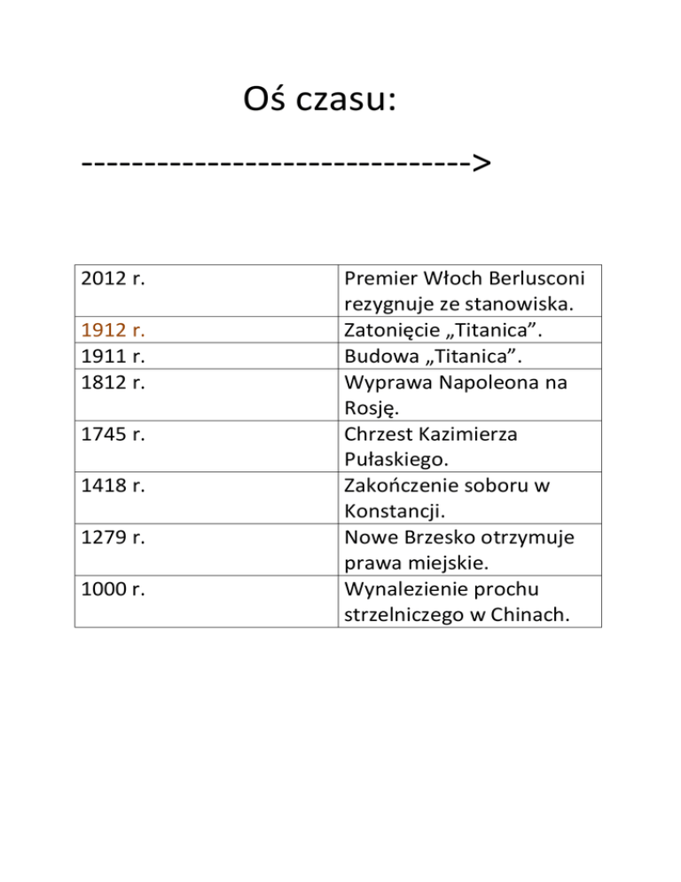 Oś czasu: -------------------------------> 2012 r. 1912 r. 1911 r. 1812 r. 1745 r. 1418 r. 1279 r. 1000 r. Premier Włoch Berlusconi rezygnuje ze stanowiska. Zatonięcie „Titanica”. Budowa „Titanica”. Wyprawa Napoleona na Rosję. Chrzest Kazimierza Pułaskiego. Zakończenie soboru w Konstancji. Nowe Brzesko otrzymuje prawa miejskie. Wynalezienie prochu strzelniczego w Chinach.