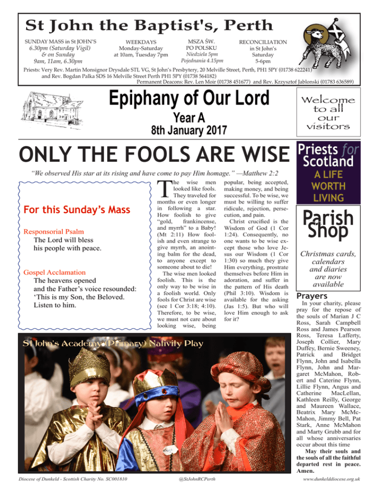 St John the Baptist's, Perth SUNDAY MASS in St JOHN’S 6.30pm (Saturday Vigil) & on Sunday 9am, 11am, 6.30pm MSZA ŚW. PO POLSKU Niedziela 5pm Pojednania 4.15pm WEEKDAYS Monday-Saturday at 10am, Tuesday 7pm RECONCILIATION in St John’s Saturday 5-6pm Priests: Very Rev. Martin Monsignor Drysdale STL VG, St John’s Presbytery, 20 Melville Street, Perth, PH1 5PY (01738 622241) and Rev. Bogdan Palka SDS 16 Melville Street Perth PH1 5PY (01738 564182) Permanent Deacons: Rev. Len Moir (01738 451677) and Rev. Krzysztof Jablonski (01783 636589) Epiphany of Our Lord Year A 8th January 2017 ONLY THE FOOLS ARE WISE “We observed His star at its rising and have come to pay Him homage.” —Matthew 2:2 For this Sunday’s Mass Responsorial Psalm The Lord will bless his people with peace. Gospel Acclamation The heavens opened and the Father’s voice resounded: ‘This is my Son, the Beloved. Listen to him. T he wise men looked like fools. They traveled for months or even longer in following a star. How foolish to give “gold, frankincense, and myrrh” to a Baby! (Mt 2:11) How foolish and even strange to give myrrh, an anointing balm for the dead, to anyone except to someone about to die! The wise men looked foolish. This is the only way to be wise in a foolish world. Only fools for Christ are wise (see 1 Cor 3:18; 4:10). Therefore, to be wise, we must not care about looking wise, being popular, being accepted, making money, and being successful. To be wise, we must be willing to suffer ridicule, rejection, persecution, and pain. Christ crucified is the Wisdom of God (1 Cor 1:24). Consequently, no one wants to be wise except those who love Jesus our Wisdom (1 Cor 1:30) so much they give Him everything, prostrate themselves before Him in adoration, and suffer in the pattern of His death (Phil 3:10). Wisdom is available for the asking (Jas 1:5). But who will love Him enough to ask for it? St John’s Academy (Primary) Nativity Play Diocese of Dunkeld - Scottish Charity No. SC001810 @StJohnRCPerth Welcome to all our visitors Priests for Scotland A LIFE WORTH LIVING Parish Shop Christmas cards, calendars and diaries are now available Prayers In your charity, please pray for the repose of the souls of Marian J C Ross, Sarah Campbell Ross and James Pearson Ross, Teresa Lafferty, Joseph Collier, Mary Duffey, Bernie Sweeney, Patrick and Bridget Flynn, John and Isabella Flynn, John and Margaret McMahon, Robert and Caterine Flynn, Lillie Flynn, Angus and Catherine MacLellan, Kathleen Reilly, George and Maureen Wallace, Beatrix Mary McMcMahon, Jimmy Bell, Pat Stark, Anne McMahon and Marty Grubb and for all whose anniversaries occur about this time May their souls and the souls of all the faithful departed rest in peace. Amen. www.dunkelddiocese.org.uk NIEDZIELNA REFLEKSJA NAD SŁOWEM BOŻYM ... Święta: Objawienia Pańskiego i Chrztu Pańskiego Z darami do Pana W Uroczystość Objawienia Pańskiego przybywamy wraz z Mędrcami ze Wschodu do Betlejem, aby „złożyć pokłon Panu”. Chcemy zobaczyć i uczcić Syna Bożego, narodzonego w największej pokorze, który staje się darem dla wszystkich: Maryi, Józefa, pasterzy, a przez tajemniczych gości z innych krain – nas wszystkich. A co nas zaprowadziło do Chrystusa? Co było dla nas gwiazdą przewodnią, prowadzącą do Betlejem? Dla wielu rodzice, dobrzy ludzie, przyjaciele, dla innych nauczyciele w szkole, a może cierpienie? Są również i dzisiaj ludzie, dla których Bóg jest nadal zakryty, zasłonięty kurtyną niewiary, lenistwa, obojętności, znieczulicy, zawiści lub po prostu grzechu. Blask światła nie potrafi się przebić przez tę zasłonę! Choć przez chwile zastanowię się, co nam, co mnie dzisiaj zasłania Boga? Chwała Pana rozbłysła nad ziemią. W ten sposób nie tylko przyszedł na świat Chrystus – światło w ciemności, ale także ukazał się wszystkim narodom. Noc dziejów została opromieniona niezwykłym blaskiem. Tę prawdę ukazał doskonale szwedzki karmelita Wilfrid Stinissen w książce „Noc jest mi światłem”. Przedstawił on spojrzenie świętego Jana od Krzyża na trudne stany ducha, które dotykają człowieka w jego ziemskiej wędrówce. Autor rozważa różne aspekty głębokiego i oczyszczającego działania Boga, czyli tzw. „nocy ciemnej”. Książka stanowi nie tylko interpretację doktryny św. Jana od Krzyża, lecz także zaproszenie do poddania się Bożemu prowadzeniu, zachętę do odczytywania sensu każdego przeżywanego cierpienia, niepokoju czy lęku oraz nieustępliwego pytania w trudnych chwilach: „Co Bóg pragnie mi przez to odsłonić?” Skłania do tego, by w naszej konkretnej codzienności podjąć wezwanie: „Miej odwagę stać się tym kim jesteś w Chrystusie”. Gwiazda, która zaprowadziła trzech Mędrców do Betlejem, stanowi wskazówkę także dla nas, ludzi XXI wieku. Skłania do tego, byśmy rozwiązania naszych życiowych problemów szukali nie w katastroficznych filmach, zapowiadających nieuchronny koniec świata i wzbudzających lęk czy w astrologii. Gwiazda kieruje nasz wzrok na Chrystusa – Światłość świata. Św. Grzegorz z Nazjanzu przypomina, że „w chwili, w której trzej Królowie, prowadzeni przez gwiazdę, adorowali nowego Chrystusa Króla, nastąpił koniec astrologii, gdyż od tej pory gwiazdy poruszają się po orbitach wyznaczonych przez Chrystusa. (…) To nie żywioły świata, prawa materii rządzą ostatecznie światem i człowiekiem, ale osobowy Bóg rządzi gwiazdami, czyli wszechświatem; (…) A jeśli znamy tę Osobę, a Ona zna nas, (…) wówczas nie jesteśmy niewolnikami wszechświata i jego praw – jesteśmy wolni” (Spe salvi 5). W darze złota, kadzidła i mirry złożonym Dzieciątku widzimy symbol miłości, modlitwy i cierpienia. Mędrcy są naszymi przed- stawicielami u żłóbka Chrystusa, bo pierwsi dzięki światłu gwiazdy rozpoznali w Nim Boga. Wiemy też, że Magowie ostrzeżeni przed Herodem, inną drogą wracaj