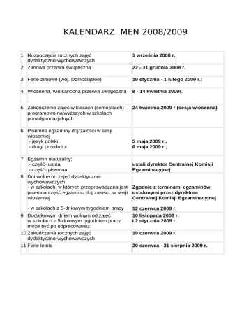 KALENDARZ MEN 2008/2009 1 Rozpoczęcie rocznych zajęć dydaktyczno-wychowawczych 2 Zimowa przerwa świąteczna 1 września 2008 r. 3 Ferie zimowe (woj. Dolnośląskie) 19 stycznia - 1 lutego 2009 r.: 4 Wiosenna, wielkanocna przerwa świąteczna 9 - 14 kwietnia 2009r. 5 Zakończenie zajęć w klasach (semestrach) programowo najwyższych w szkołach ponadgimnazjalnych 24 kwietnia 2009 r (sesja wiosenna) 6 Pisemne egzaminy dojrzałości w sesji wiosennej - język polski - drugi przedmiot 7 Egzamin maturalny: - część- ustna - część- pisemna 8 Dni wolne od zajęć dydaktycznowychowawczych - w szkołach, w których przeprowadzana jest pisemna część egzaminu dojrzałości w sesji wiosennej - w szkołach z 5-dniowym tygodniem pracy 9 Dodatkowym dniem wolnym od zajęć w szkołach z 5-dniowym tygodniem pracy może być po odpracowaniu: 10 Zakończenie rocznych zajęć dydaktyczno-wychowawczych 11 Ferie letnie 22 - 31 grudnia 2008 r. 5 maja 2009 r., 6 maja 2009 r., ustali dyrektor Centralnej Komisji Egzaminacyjnej Zgodnie z terminami egzaminów ustalonymi przez dyrektora Centralnej Komisji Egzaminacyjnej 12 czerwca 2009 r. 10 listopada 2008 r. i 2 stycznia 2009 r. 19 czerwca 2009 r. 20 czerwca - 31 sierpnia 2009 r.