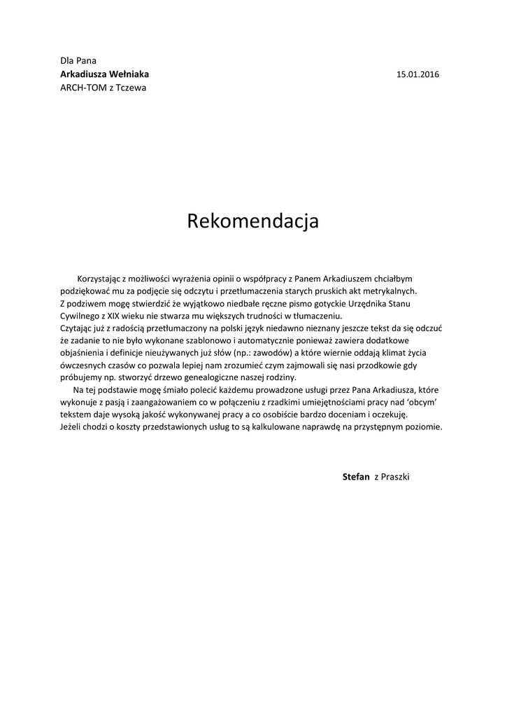 Dla Pana Arkadiusza Wełniaka ARCH-TOM z Tczewa 15.01.2016 Rekomendacja Korzystając z możliwości wyrażenia opinii o współpracy z Panem Arkadiuszem chciałbym podziękować mu za podjęcie się odczytu i przetłumaczenia starych pruskich akt metrykalnych. Z podziwem mogę stwierdzić że wyjątkowo niedbałe ręczne pismo gotyckie Urzędnika Stanu Cywilnego z XIX wieku nie stwarza mu większych trudności w tłumaczeniu. Czytając już z radością przetłumaczony na polski język niedawno nieznany jeszcze tekst da się odczuć że zadanie to nie było wykonane szablonowo i automatycznie ponieważ zawiera dodatkowe objaśnienia i definicje nieużywanych już słów (np.: zawodów) a które wiernie oddają klimat życia ówczesnych czasów co pozwala lepiej nam zrozumieć czym zajmowali się nasi przodkowie gdy próbujemy np. stworzyć drzewo genealogiczne naszej rodziny. Na tej podstawie mogę śmiało polecić każdemu prowadzone usługi przez Pana Arkadiusza, które wykonuje z pasją i zaangażowaniem co w połączeniu z rzadkimi umiejętnościami pracy nad ‘obcym’ tekstem daje wysoką jakość wykonywanej pracy a co osobiście bardzo doceniam i oczekuję. Jeżeli chodzi o koszty przedstawionych usług to są kalkulowane naprawdę na przystępnym poziomie. Stefan z Praszki