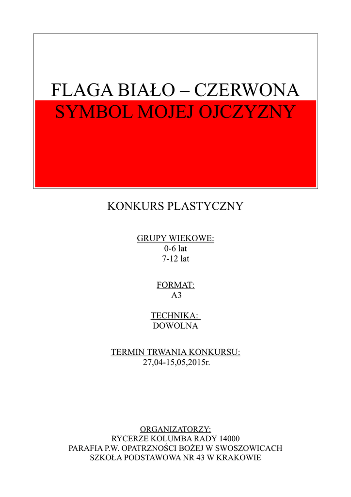 FLAGA BIAŁO – CZERWONA SYMBOL MOJEJ OJCZYZNY KONKURS PLASTYCZNY GRUPY WIEKOWE: 0-6 lat 7-12 lat FORMAT: A3 TECHNIKA: DOWOLNA TERMIN TRWANIA KONKURSU: 27,04-15,05,2015r. ORGANIZATORZY: RYCERZE KOLUMBA RADY 14000 PARAFIA P.W. OPATRZNOŚCI BOŻEJ W SWOSZOWICACH SZKOŁA PODSTAWOWA NR 43 W KRAKOWIE Regulamin konkursu plastycznego „Flaga biało-czerwona – symbol mojej ojczyzny”: 1. Organizatorzy: 1.1. Parafia p.w. Opatrzności Bożej Kraków -Swoszowice 1.2. Szkoła Podstawowa nr 43 w Krakowie ul. Myślenicka 112 1.3. Rycerze Kolumba Rady 14000 w Krakowie im. Jana Pawła II 2. Konkurs organizowany jest w dniach 27,04 do 15,05,2015r. włącznie. 3. Konkurs plastyczny, format A3, technika dowolna. 4. Prace konkursowe należy na odwrocie podpisać: 4.1. imieniem i nazwiskiem 4.2. wiek dziecka 4.3. nr przedszkola lub szkoły podstawowej 4.4. nr grupy (w przypadku przedszkoli) lub klasy (dot. szkoły podstawowej) 4.5. dane kontaktowe (nr telefonu lub adres e-mail). 5. Prace przyjmowane są w dniach od 27,04 do 15,05,2015r włącznie : 5.1. w zakrystii parafii p.w. Opatrzności Bożej przed lub po Mszach świętych 5.2. w sekretariacie Szkoły Podstawowej nr 43 w Krakowie – w godzinach pracy 6. Wyniki konkursu zostaną ogłoszone na Parafiadzie w sobotę 13,06,2015r. na stadionie Krakusa przy ul. Piłkarskiej 9 w Krakowie. 7. Autorzy nagrodzonych prac otrzymają dyplomy i słodkie upominki podczas Parafiady 2015r. w dniu 13,06,2015r na scenie głównej. 8. Nagrodzone prace zostaną przedstawione podczas Parafiady 2015r w dniach 1314,05,2015r. 9. Dodatkowo zdjęcia nagrodzonych prac zostaną zaprezentowane na stronie internetowej Parafii Swoszowice. 10. Autorzy prac konkursowych akceptują powyższy regulamin.