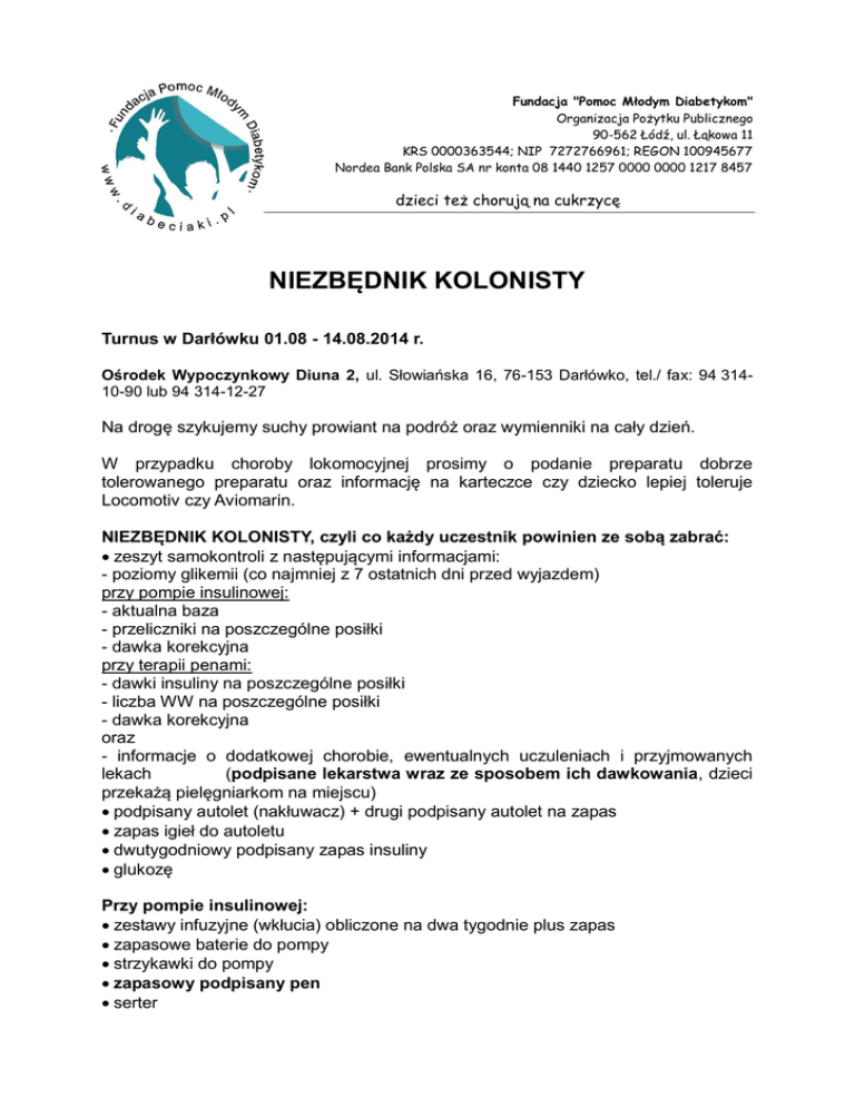 Fundacja "Pomoc Młodym Diabetykom" Organizacja Pożytku Publicznego 90-562 Łódź, ul. Łąkowa 11 KRS 0000363544; NIP 7272766961; REGON 100945677 Nordea Bank Polska SA nr konta 08 1440 1257 0000 0000 1217 8457 dzieci też chorują na cukrzycę NIEZBĘDNIK KOLONISTY Turnus w Darłówku 01.08 - 14.08.2014 r. Ośrodek Wypoczynkowy Diuna 2, ul. Słowiańska 16, 76-153 Darłówko, tel./ fax: 94 31410-90 lub 94 314-12-27 Na drogę szykujemy suchy prowiant na podróż oraz wymienniki na cały dzień. W przypadku choroby lokomocyjnej prosimy o podanie preparatu dobrze tolerowanego preparatu oraz informację na karteczce czy dziecko lepiej toleruje Locomotiv czy Aviomarin. NIEZBĘDNIK KOLONISTY, czyli co każdy uczestnik powinien ze sobą zabrać: zeszyt samokontroli z następującymi informacjami: - poziomy glikemii (co najmniej z 7 ostatnich dni przed wyjazdem) przy pompie insulinowej: - aktualna baza - przeliczniki na poszczególne posiłki - dawka korekcyjna przy terapii penami: - dawki insuliny na poszczególne posiłki - liczba WW na poszczególne posiłki - dawka korekcyjna oraz - informacje o dodatkowej chorobie, ewentualnych uczuleniach i przyjmowanych lekach (podpisane lekarstwa wraz ze sposobem ich dawkowania, dzieci przekażą pielęgniarkom na miejscu) podpisany autolet (nakłuwacz) + drugi podpisany autolet na zapas zapas igieł do autoletu dwutygodniowy podpisany zapas insuliny glukozę Przy pompie insulinowej: zestawy infuzyjne (wkłucia) obliczone na dwa tygodnie plus zapas zapasowe baterie do pompy strzykawki do pompy zapasowy podpisany pen serter Przy penach: podpisane peny zapas igieł Ponadto należy zapisać: - ostatnia HbA1c (hemoglobina glikowana) - jeśli rodzice pamiętają - data i wartość) - jeśli w ostatnich 3 miesiącach zdarzyła się ciężka hipoglikemia (konieczne było podanie glukagonu lub wezwanie pogotowia) - data, pora, przyczyna. Cały osobisty sprzęt i leki dziecka muszą być podpisane - np. na plastrze lub niezmywalnym markerem (peny, pompa, autolet, opakowania z zestawami infuzyjnymi, opakowania ze zbiorniczkami do pompy, serter do zestawów infuzyjnych, opakowania z insuliną). Wszelkie dodatkowe informacje dotyczące szczególnych (zdrowotnych) potrzeb dziecka proszę przekazać na piśmie wychowawcy/pielęgniarce grupy w dniu wyjazdu (np. dodatkowe leki, ograniczenia dietetyczne - celiakia, alergia pokarmowa lub inna). Koniecznie ubrania z uwzględnieniem różnej pogody (obowiązkowo czapka chroniąca przed słońcem i kurtka przeciwdeszczowa), zapas bielizny i skarpet, piżama, kostium kąpielowy/kąpielówki, klapki, czepek, ręcznik plażowy, przybory toaletowe, krem przeciwsłoneczny, ręczniki, mały plecak. Uwaga! Pieniądze na drobne wydatki dziecka można przekazać w podpisanej kopercie (imię i nazwisko dziecka) wychowawcy na zbiórce; prosimy o banknoty o niskim nominale. Obowiązkowo zabieramy DOBRY HUMOR :-) 2