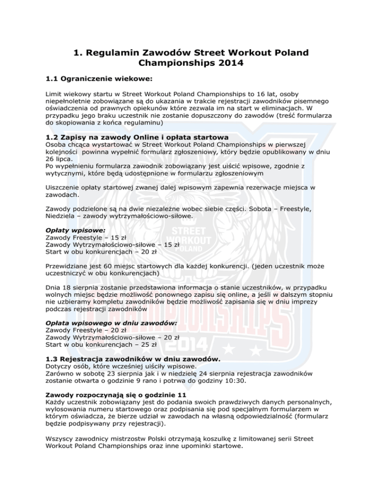 1. Regulamin Zawodów Street Workout Poland Championships 2014 1.1 Ograniczenie wiekowe: Limit wiekowy startu w Street Workout Poland Championships to 16 lat, osoby niepełnoletnie zobowiązane są do ukazania w trakcie rejestracji zawodników pisemnego oświadczenia od prawnych opiekunów które zezwala im na start w eliminacjach. W przypadku jego braku uczestnik nie zostanie dopuszczony do zawodów (treść formularza do skopiowania z końca regulaminu) 1.2 Zapisy na zawody Online i opłata startowa Osoba chcąca wystartować w Street Workout Poland Championships w pierwszej kolejności powinna wypełnić formularz zgłoszeniowy, który będzie opublikowany w dniu 26 lipca. Po wypełnieniu formularza zawodnik zobowiązany jest uiścić wpisowe, zgodnie z wytycznymi, które będą udostępnione w formularzu zgłoszeniowym Uiszczenie opłaty startowej zwanej dalej wpisowym zapewnia rezerwacje miejsca w zawodach. Zawody podzielone są na dwie niezależne wobec siebie części. Sobota – Freestyle, Niedziela – zawody wytrzymałościowo-siłowe. Opłaty wpisowe: Zawody Freestyle – 15 zł Zawody Wytrzymałościowo-siłowe – 15 zł Start w obu konkurencjach – 20 zł Przewidziane jest 60 miejsc startowych dla każdej konkurencji. (jeden uczestnik może uczestniczyć w obu konkurencjach) Dnia 18 sierpnia zostanie przedstawiona informacja o stanie uczestników, w przypadku wolnych miejsc będzie możliwość ponownego zapisu się online, a jeśli w dalszym stopniu nie uzbieramy kompletu zawodników będzie możliwość zapisania się w dniu imprezy podczas rejestracji zawodników Opłata wpisowego w dniu zawodów: Zawody Freestyle – 20 zł Zawody Wytrzymałościowo-siłowe – 20 zł Start w obu konkurencjach – 25 zł 1.3 Rejestracja zawodników w dniu zawodów. Dotyczy osób, które wcześniej uiściły wpisowe. Zarówno w sobotę 23 sierpnia jak i w niedzielę 24 sierpnia rejestracja zawodników zostanie otwarta o godzinie 9 rano i potrwa do godziny 10:30. Zawody rozpoczynają się o godzinie 11 Każdy uczestnik zobowiązany jest do podania swoich prawdziwych danych personalnych, wylosowania numeru startowego oraz podpisania się pod specjalnym formularzem w którym oświadcza, że bierze udział w zawodach na własną odpowiedzialność (formularz będzie podpisywany przy rejestracji). Wszyscy zawodnicy mistrzostw Polski otrzymają koszulkę z limitowanej serii Street Workout Poland Championships oraz inne upominki startowe. 2. REGULAMIN ZAWODÓW FREESTYLE – SOBOTA 23.08.2014 2.1 Zawody Freestyle zostaną przeprowadzone w trzech etapach ETAP 1: ELIMINACJE Uczestnik prezentuje wcześniej ułożony przez siebie układ/choreografię bazującą na swoich freestylowych umiejętnościach. Długość występu to 2 minuty. Dozwolone są figury dwójkowe (pod warunkiem, że zawodnik jest w trudniejszej pozycji). Czas jest liczony od momentu gdy zawodnik potwierdzi swoją gotowość i da znać obsłudze technicznej że może odliczać czas, oraz puszczać muzykę (warunek własnej muzyki – czyt. Punkt 2.2) jeśli ów czas dopłynie końca w trakcie wykonywania jakiegoś elementu uczestnikowi pozwala się na jego dokończenie. Każdy uczestnik jest punktowany indywidualnie. Po zobaczeniu wszystkich występów eliminacyjnych nastąpi krótka przerwa techniczna po której sędziowie wyczytają 8 numerów osób, które otrzymały najlepsze punktacje w eliminacjach i przechodzą do PÓŁFINAŁU. Oceny sędziów w etapie eliminacyjnym: Zawodnik oceniany jest przez trzech sędziów w czterech kategoriach: Siła, Dynamika, Kreatywność, Game plan w skali od 1 do 10. Suma oceny całkowitej zawodnika wyliczana jest na bazie średniej ważonej wyliczonej z ocen wystawionych na kartach sędziowskich. Każda kategoria w której zawodnik jest oceniany posiada inną wagę. Siła – wszystkie elementy statyczne i siłowe (waga o wartości 1) Dynamika – przeskoki, obroty (waga o wartości 0,7) Kreatywność – różnorodność występu, kombinacje kilku trików (waga o wartości 0,8) Game plan – Zagospodarowanie czasem występu, jego płynność (waga o wartości 0,6) Przykładowy sposób punktowania i wyliczania średniej ważonej na przykładzie jednej z trzech kart sędziowskich: Zawodnik A: Sędzia 1 punktacja: Siła – 8 (waga 1) Dynamika – 6 (waga 0,7) Kreatywność – 7 (waga 0,8) Game plan – 3 (waga 0,6) wzór: (8*1)+(6*0,7)+(7*0,8)+(3*0,6)/(1+0,7+0,8+0,6) = 6,32 Przykładowe oceny całkowite z trzech kart sędziowskich: Sędzia 1: 6,32 Sędzia 2: 7,11 Sędzia 3: 7,31 wzór: 6,32+7,11+7,31 / 3= 6,91 Ocena całkowita zawodnika 6,91 ETAP 2: PÓŁFINAŁY Ten etap przeprowadzany jest na takich samych zasadach jak etap eliminacyjny. Uczestnicy ponownie staną przed próbą prezentacji swoich umiejętności w 2-minutowym freestyle. Najważniejszą rzeczą w tym etapie jest to by zaprezentować się inaczej niż w eliminacjach, będzie to podstawowy aspekt oceny sędziowskiej tyle, że w tym etapie zmienia się system oceniania zawodników. Ocena półfinałów: Każdy sędzia ocenia zawodników indywidualnie określając na swojej karcie miejsca od 1 do 4. Punktacja na karcie sędziowskiej: 1 miejsce: 10 punktów 2 miejsce: 8 punktów 3 miejsce: 6 punktów 4 miejsce: 4 punktów Z ocen z kart sędziowskich wyciągana jest średnia. Do FINAŁU przechodzi 4 zawodników z najwyższą średnią. Przykład: Zawodnik A Sędzia 1 wskazał 1 miejsce Sędzia 2 wskazał 3 miejsce Sędzia 3 wskazał 4 miejsce Ocena: (10+6+4)/3 = 6,67 W przypadku remisu na wyższe miejsce wskakuje zawodnik z większą oceną z eliminacji! ETAP 3: WIELKI FINAŁ W finale wielkie znaczenie ma punktacja z półfinałów. Zawodnicy, którzy zajęli 4 i 3 miejsce w półfinale zawalczą o 3 miejsce. Zawodnicy z miejscami 2 i 1 z półfinałów zawalczą o tytuł Mistrza i Wicemistrza Polski Street Workout 2014 w kategorii Freestyle. Etap finałowy polega na freestylowym pojedynku 1vs1. Zawodnicy prezentują swoje umiejętn