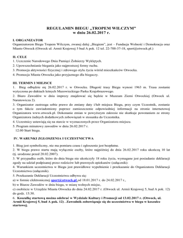 REGULAMIN BIEGU „TROPEM WILCZYM” w dniu 26.02.2017 r. I. ORGANIZATOR Organizatorem Biegu Tropem Wilczym, zwanej dalej „Biegiem”, jest – Fundacja Wolność i Demokracja oraz Miasto Otwock (Otwock ul. Armii Krajowej 5 bud A pok. 12 tel. 22-788-37-18, [email protected].) II. CELE 1. Uczczenie Narodowego Dnia Pamięci Żołnierzy Wyklętych. 2. Upowszechnianie biegania jako najprostszej formy ruchu. 3. Promocja aktywności fizycznej i zdrowego stylu życia wśród mieszkańców Otwocka. 4. Promocja Miasta Otwocka jako przyjaznego dla biegaczy. III. TERMIN I MIEJSCE 1. Bieg odbędzie się 26.02.2017 r. w Otwocku. Długość trasy Biegu wynosi 1963 m. Trasa zostanie wytyczona po duktach leśnych Mazowieckiego Parku Krajobrazowego. 2. Biuro Zawodów w dniu imprezy znajdować się będzie w Muzeum Ziemi Otwockiej (Otwock ul. Narutowicza 2). 3. Organizator zastrzega sobie prawo do zmiany daty i/lub miejsca Biegu, przy czym Uczestnik, zostanie o tym fakcie zawiadomiony poprzez zamieszczenie odpowiedniej informacji na stronie internetowej Organizatora www.otwock.pl. Dokonanie zmian w powyższym zakresie nie skutkuje powstaniem ze strony Organizatora żadnych dodatkowych zobowiązań w stosunku do Uczestnika. 4. Uczestnicy ustawiają się na starcie w wyznaczonych przez Organizatora miejscu. 5. Program minutowy zawodów w dniu 26.02.2017 r. 12.00 Start biegu. IV. WARUNKI ZGŁOSZENIA I UCZESTNICTWA 1. Bieg jest symboliczny, nie ma pomiaru czasu i zgłoszenie jest bezpłatne. 2. W biegu prawo startu mają wyłącznie osoby, które najpóźniej do dnia 26.02.2017 roku ukończą 10 lat (tj. urodzone przed 28.02.2007). 3. W przypadku osób, które do dnia biegu nie ukończyły 18 roku życia, wymagane jest posiadanie deklaracji zgody na udział podpisanej przez rodziców lub prawnych opiekunów (załącznik): 4. Warunkiem uczestnictwa w Biegu jest prawidłowe wypełnienie i przekazanie do Organizatora Deklaracji Uczestnictwa (załącznik). 5. Przekazanie Deklaracji Uczestnictwa odbywa się: a) w formie elektronicznej [email protected] od 18.01.2017 r. do 24.02.2017 r., b) w Biurze Zawodów w dniu biegu, w miarę wolnych miejsc, c) osobiście w Urzędzie Miasta Otwocka do dnia 24.02.2017 r. (Otwock ul. Armii Krajowej 5, bud A pok. 12) do godz. 15:30. 6. Koszulkę startową można odebrać w Wydziale Kultury i Promocji od 13.02.2017 r. (Otwock, ul. Armii Krajowej 5, bud A pok. 12) . Zawodnik zobowiązuje się do uczestnictwa w biegu w koszulce startowej. 7. Limit Uczestników Biegu wynosi 500 osób. W przypadku wyczerpania limitu Organizator zastrzega sobie prawo do wcześniejszego zakończenie rejestracji. Organizator zastrzega sobie prawo do zmienienia limitów Uczestników i zapisów regulaminu. 8. Uczestnik wyraża zgodę umieszczenia na stronie www.otwock.pl listy zgłoszeniowej zawodników, przestrzegania Regulaminu, w tym wyrazić zgodę na przetwarzanie danych osobowych zgodnie z ustawą z dnia 29 sierpnia 1997 r. o ochronie danych osobowych (tekst jednolity: Dz. U. 2002 r. Nr 101 poz. 926, ze zm.) oraz Regulaminem. Organizator zastrzega sobie, a także podmiotom z nim powiązanym, prawo do robienia zdjęć i/lub filmowania, na cele promocyjne Miasta Otwocka, a także możliwość ich wykorzystania w Internecie. 9. Organizator jest ubezpieczony od odpowiedzialności cywilnej wobec Uczestników Biegu. Organizator nie zapewnia Uczestnikowi jakiegokolwiek ubezpieczenia na życie, zdrowotnego, odpowiedzialności cywilnej z tytułu choroby, wypadku, odniesienia obrażeń, śmierci lub szkód, jakie mogą wystąpić w związku z obecnością lub uczestnictwem Uczestnika w imprezie oraz nie ponosi z tego tytułu odpowiedzialności.