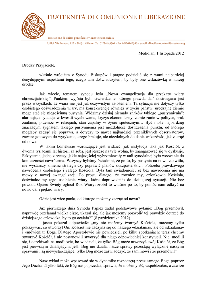 FRATERNITÀ DI COMUNIONE E LIBERAZIONE associazione di diritto pontificio civilmente riconosciuta Uffici: Via Porpora, 127 - 20131 Milano - Tel. 02/26149301 - Fax 02/26149340 - e-mail: [email protected] Mediolan, 1 listopada 2012 Drodzy Przyjaciele, w!a"nie wróci!em z Synodu Biskupów i pragn# podzieli$ si# z wami najbardziej decyduj%cymi aspektami tego, czego tam do"wiadczy!em, by by!y one wskazówk% w naszej drodze. Jak wiecie, tematem synodu by!a „Nowa ewangelizacja dla przekazu wiary chrze"cija&skiej”. Punktem wyj"cia by!o stwierdzenie, którego prawda dzi" dostrzegana jest przez wszystkich: 'e wiara nie jest ju' oczywistym za!o'eniem. Ta sytuacja nie dotyczy tylko osobistego do"wiadczenia wiary, ma konsekwencje równie' w 'yciu pa&stw: urodzajne ziemie mog% sta$ si# niego"cinn% pustyni%. Widzimy dzisiaj niema!o znaków takiego „pustynnienia”: alarmuj%ca sytuacja w kwestii wychowania, kryzys ekonomiczny, zamieszanie w polityce, brak zaufania, przemoc w relacjach, stan zapalny w 'yciu spo!ecznym… By$ mo'e najbardziej znacz%cym sygna!em takiego pustynnienia jest niezdolno"$ dostrze'enia punktu, od którego mog!aby zacz%$ si# poprawa, a dotyczy to nawet najbardziej przenikliwych obserwatorów, zawsze gotowych do wytykania, czego brakuje, ale niezdolnych do dania wskazówki, jak zacz%$ od nowa. W takim kontek"cie wzruszaj%ce jest widzie$, jak instytucja taka jak Ko"ció!, z dwoma tysi%cami lat historii za sob%, jest jeszcze na tyle wolna, by zaanga'owa$ si# w dyskusj#. Faktycznie, jedn% z rzeczy, jakie najcz#"ciej wybrzmiewa!y w auli synodalnej by!o wezwanie do konieczno"ci nawrócenia. Wszyscy byli"my "wiadomi, 'e po to, by pustynia na nowo zakwit!a, nie wystarczy zmieni$ strategii czy poprawi$ planów duszpasterskich. Potrzeba prawdziwego nawrócenia osobistego i ca!ego Ko"cio!a. By!a tam "wiadomo"$, 'e bez nawrócenia nie ma mowy o nowej ewangelizacji. Po prostu dlatego, 'e równie' my, cz!onkowie Ko"cio!a, do"wiadczamy tego os!abienia wiary, które doprowadzi!o do dzisiejszej sytuacji. Nie bez powodu Ojciec (wi#ty og!osi! Rok Wiary: zrobi! to w!a"nie po to, by pomóc nam odkry$ na nowo dar i pi#kno wiary. Gdzie jest wi#c punkt, od którego mo'emy zacz%$ od nowa? Ju' pierwszego dnia Synodu Papie' zada! podstawowe pytanie: „Bóg przemówi!, naprawd# prze!ama! wielk% cisz#, ukaza! si#, ale jak mo'emy pozwoli$ tej prawdzie dotrze$ do dzisiejszego cz!owieka, by to go ocala!o?” (8 pa)dziernika 2012). I jasno pokaza! odpowied): „my nie mo'emy tworzy$ Ko"cio!a, mo'emy tylko pokazywa$, co utworzy! On. Ko"ció! nie zaczyna si# od naszego «dzia!ania», ale od «dzia!ania» i «mówienia» Boga. Dlatego Aposto!owie nie powiedzieli po kilku spotkaniach: teraz chcemy stworzy$ Ko"ció!, i nie postanowili stworzy$ dla niego odpowiedniej konstytucji. Nie, modlili si#, i oczekiwali na modlitwie, bo wiedzieli, 'e tylko Bóg mo'e utworzy$ swój Ko"ció!, 'e Bóg jest pierwszym dzia!aj%cym: je"li Bóg nie dzia!a, nasze sprawy pozostaj% wy!%cznie naszymi sprawami i s% niewystarczaj%ce; tylko Bóg mo'e za"wiadczy$, 'e sam mówi i 'e przemówi!”. Nasz wk!ad mo'e wpasowa$ si# w dynamik# rozpocz#t% przez samego Boga poprzez Jego Ducha. „Tylko fakt, 'e Bóg nas poprzedza, sprawia, 'e mo'emy i"$, wspó!dzia!a$, a zawsze jest to wspó!dzia!aniem, a nie tylko i wy!%cznie nasz% decyzj%. Dlatego wa'ne jest, by wiedzie$ zawsze, 'e pierwsze s!owo, prawdziwa inicjatywa, prawdziwe dzia!anie, przychodzi od Boga, i tylko w!%czaj%c si# w t# Bosk% inicjatyw#, tylko b!agaj%c o t# Bosk% inicjatyw#, mo'emy i my sta$ si# – z Nim i w Nim – ewangelizatorami. Bóg jest pocz%tkiem zawsze” (Benedykt XVI, 8 pa)dziernika 2012). Tylko ten, kto pozwoli si# pochwyci$ Bogu, który sta! si# nam bliski w Chrystusie, b#dzie móg! podj%$ wyzwanie nowej ewangelizacji. „Prawdziwymi bohaterami nowej ewangelizacji s% "wi#ci” (Benedykt XVI, 28 pa)dziernika 2012). S!ysz%c wezwanie do nawrócenia, które wybrzmiewa!o w auli synodalnej, nie mog!em nie przywo!a$ w pami#ci wezwania, z którym zwróci! si# do nas wiele lat temu w Viterbo ksi%dz Giussani, prosz%c nas, by"my „odkryli na nowo prawd# naszego powo!ania i naszego zaanga'owania”. Poniewa' my tak'e, mówi!, jeste"my w niebezpiecze&stwie „sprowadzania naszego zaanga'owania do teorii metody socjopedagogicznej, do aktywizmu wynikaj%cego z politycznej obrony tej metody, zamiast na nowo potwierdza$ i proponowa$ cz!owiekowi, naszemu bratu, fakt 'ycia”. Ksi%dz Giussani pyta!: „A na czym si# opiera fakt 'ycia? Gdzie jest 'ycie? *yciem jeste" Ty”. A jednak nam tak cz#sto taka postawa wydaje si# za ma!o konkretna, nie wp!ywaj%ca na histori#, wydaje si# jakim" „wyborem religijnym”. Faktycznie, mówi! dalej ksi%dz Giussani, „dla wielu z nas to, 'e zbawieniem jest Jezus Chrystus, i 'e wyzwolenie ludzkiego 'ycia, tutaj i na tamtym "wiecie, wi%'e si# wci%' ze spotkaniem z Nim, sta!o si# wezwaniem «duchowym». A konkret jest gdzie indziej: w zaanga'owaniu w zwi%zki zawodowe, w promowaniu pewnych praw, w organizowaniu, wi#c te' w zebraniach, tyle 'e takich, które nie wyra'aj% potrzeby 'ycia, s% u"mierceniem 'ycia, ci#'arem i danin% p!acon% za przynale'no"$, której wci%' nie rozumiemy”. I konkludowa!: „Odzyskanie prawdy naszej metody, by na nowo zacz#!o si# w nas 'ycie, pomi#dzy nami, tam, gdzie jeste"my, musi si# zaczyna$ od punktu pocz%tkowego. Musimy wróci$ do "wiadomo"ci pocz%tku ca!ego tego dynamizmu”. A jaki by! pocz%tek? „Ruch narodzi! si# z dostrze'enia imponuj%cej obecno"ci, która wnosi!a w 'ycie prowokacj# obietnicy, za któr% mo'na by!o i"$. Ale potem powierzyli"my trwanie tego pocz%tku przemówieniom i inicjatywom, zebraniom i rzeczom do zrobienia. Nie powierzyli"my go naszemu 'yciu, i dlatego pocz%tek bardzo wcze"nie przesta! by$ prawd% dawan% nam osobi"cie i sta! si# pretekstem dla stowarzyszenia, dla czego", na co mo'na by!o zrzuci$ odpowiedzialno"$ za w!asn% prac# i od czego mo'na by!o '%da$ rozwi%zywania problemów. To, co mia!o by$