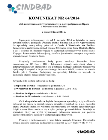 KOMUNIKAT NR 64/2014 dot. rozszerzenia oferty przewozowej o nowe połączenia z Opola i Wrocławia do Berlina z dnia 31 lipca 2014 r. Uprzejmie informujemy, że od 1 sierpnia 2014 r. (piątek) na mocy zawartej umowy pomiędzy Deutsche Bahn i Sindbad Sp. z o.o. wprowadzamy do sprzedaży nową ofertę połączeń z Opola i Wrocławia do Berlina. Połączenie to realizowane jest od wiosny 2013 roku przez firmę Deutsche Bahn, a od 1 sierpnia br. dostępne będzie w systemach sprzedażowych EuroTicket i Voyager. Jednocześnie informujemy, że oferta jest również dostępna w systemie sprzedażowym Deutsche Bahn. Przejazdy realizowane będą przez autokary Deutsche Bahn oznakowanymi IC Bus - DB - luksusowe pojazdy najwyższej klasy o czterogwiazdkowym standardzie. Na pokładzie każdego autokaru pasażerowie będą mogli korzystać z bezprzewodowego internetu Wi-Fi, zarówno na terenie Polski, jak i Niemiec. Zachęcamy do sprzedaży biletów ze względu na doskonałą ofertę i bardzo atrakcyjne ceny. Wyjazdy z/do Berlina odbywać się będą: - z Opola do Berlina - codziennie o godzinie 5.30 - z Wrocławia do Berlina - codziennie o godzinie 7.00 i 15.00 - z Berlina do Opola – codziennie o 16.44 - z Berlina do Wrocławia – codziennie o 8.44 i 16.44 Od 1 sierpnia br. oferta będzie dostępna w sprzedaży, a jej rozliczenie odbywać się będzie w ramach umowy zawartej z Sindbad Sp. z o.o. Sprzedaż oferty Deutsche Bahn jest wliczana automatycznie do raportu sprzedażowego, dzięki czemu biuro rozlicza się z tylko jednym przewoźnikiem. Prowizja za sprzedane bilety na wyżej wymienione połączenia ustalona jest poprzez odpowiedni zapis w kontach w systemach sprzedażowych. Prosimy o informowanie o w/w fakcie naszych Klientów. Ewentualne pytania prosimy kierować pod numer Infolinii 801 22 33 44 lub 77 443 44 44. SINDBAD