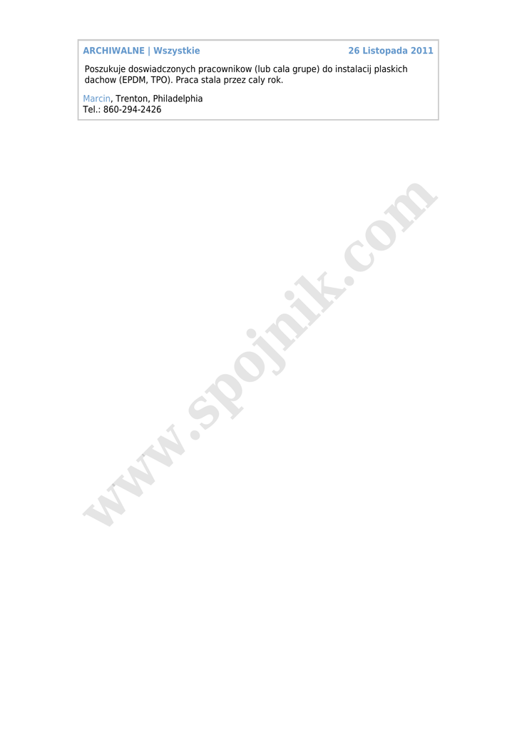ARCHIWALNE | Wszystkie 26 Listopada 2011 Poszukuje doswiadczonych pracownikow (lub cala grupe) do instalacij plaskich dachow (EPDM, TPO). Praca stala przez caly rok. w w w .s po jn ik .c o m Marcin, Trenton, Philadelphia Tel.: 860-294-2426