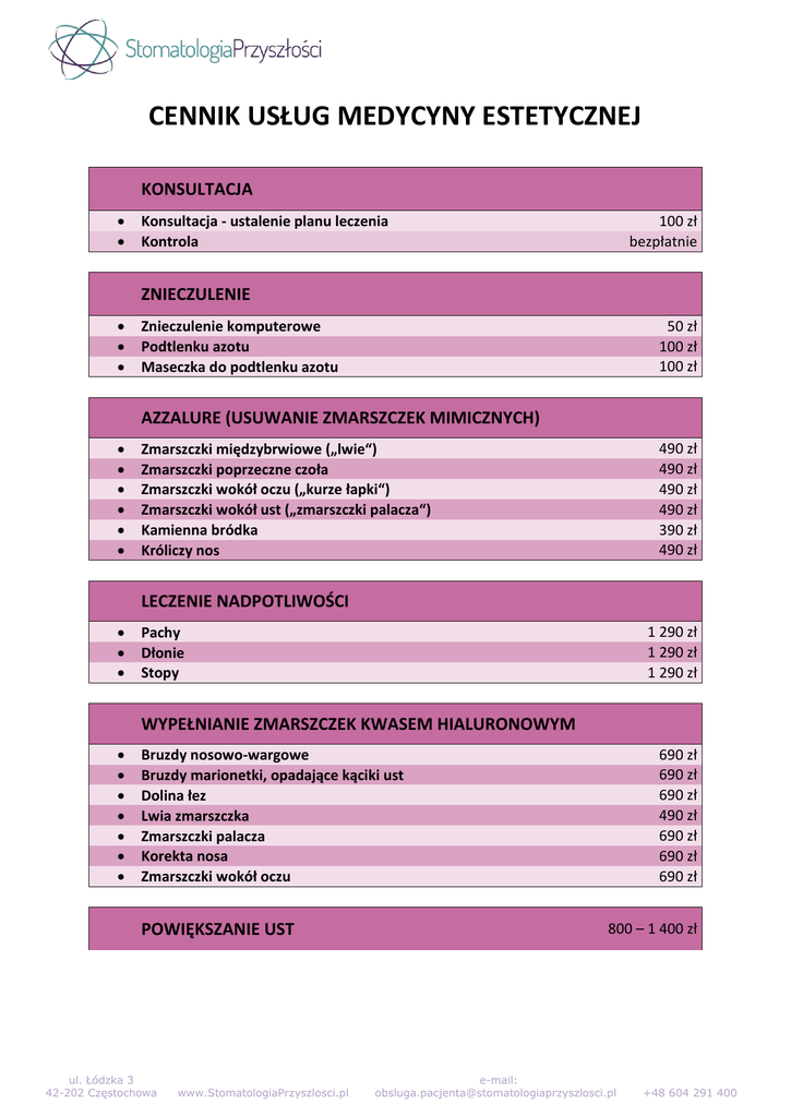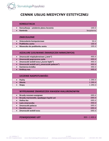 CENNIK USŁUG MEDYCYNY ESTETYCZNEJ
