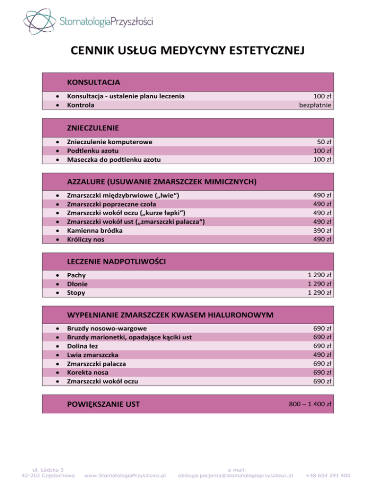 CENNIK USŁUG MEDYCYNY ESTETYCZNEJ KONSULTACJA 100 zł bezpłatnie Konsultacja - ustalenie planu leczenia Kontrola ZNIECZULENIE 50 zł 100 zł 100 zł Znieczulenie komputerowe Podtlenku azotu Maseczka do podtlenku azotu AZZALURE (USUWANIE ZMARSZCZEK MIMICZNYCH) 490 zł 490 zł 490 zł 490 zł 390 zł 490 zł Zmarszczki międzybrwiowe („lwie“) Zmarszczki poprzeczne czoła Zmarszczki wokół oczu („kurze łapki“) Zmarszczki wokół ust („zmarszczki palacza“) Kamienna bródka Króliczy nos LECZENIE NADPOTLIWOŚCI 1 290 zł 1 290 zł 1 290 zł Pachy Dłonie Stopy WYPEŁNIANIE ZMARSZCZEK KWASEM HIALURONOWYM 690 zł 690 zł 690 zł 490 zł 690 zł 690 zł 690 zł Bruzdy nosowo-wargowe Bruzdy marionetki, opadające kąciki ust Dolina łez Lwia zmarszczka Zmarszczki palacza Korekta nosa Zmarszczki wokół oczu POWIĘKSZANIE UST ul. Łódzka 3 42-202 Częstochowa www.StomatologiaPrzyszlosci.pl 800 – 1 400 zł e-mail: [email protected] +48 604 291 400 MEZOTERAPIA 590 zł 590 zł 590 zł 1290 zł 590 zł 290 zł 400 zł Twarz Szyja Dekolt Całość (twarz + szyja + dekolt) Dłonie Usuwanie rozstępów (mezoterapia) Terapia łysienia (mezoterapia) LIPOLIZA INIEKCYJNA Podbródek Brzuch - 3 do 6 ampułek Biodra - 2 do 4 ampułki Uda, bryczesy - 2 do 4 ampułki 390 zł 690 zł 590 zł 590 zł PEELINGI 460 zł 260 zł 260 zł 260 zł 260 zł Yellow peel Whitening peel Peeling pirogronowy Peeling glikolowy Peeling migdałowy Dermamelan (zabieg + zestaw preparatów do kuracji domowej) 1 490 zł REGENERIS (MEZOTERAPIA OSOCZEM BOGATOPŁYTKOWYM) od 1 000 zł Twarz + dekolt HIALURONIDAZA - „Rozpuszczanie” kwasu hialuronowego Cennik obowiązuje od grudnia 2016 r. do odwołania. ul. Łódzka 3 42-202 Częstochowa www.StomatologiaPrzyszlosci.pl e-mail: [email protected] +48 604 291 400