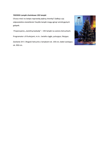 7025935 Lampki choinkowe 192 lampki Chcesz mieć na święta naprawdę piękną choinkę? Zadbaj o jej odpowiednie oświetlenie! Zwykłe lampki mogą zginąć wśród gęstych gałązek. Proponujemy „świetlną kaskadę” – 192 lampki na sześciu łańcuchach. Programator z 8 funkcjami, m.in.: światło ciągłe, pulsujące, falujące. Zasilanie 24 V. Długość łańcucha z lampkami ok. 150 cm, kabel zasilający ok. 950 cm.