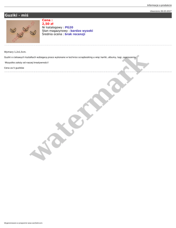 Informacje o produkcie Utworzono 06-03-2017 Guziki - miś Cena : 2,50 zł Nr katalogowy : PG20 Stan magazynowy : bardzo wysoki Średnia ocena : brak recenzji Wymiary 1,2x1,5cm. Guziki o ciekawych kształtach wzbogacą prace wykonane w technice scrapbooking a więc kartki, albumy, tagi, zaproszenia. er m ar k Wszystko zależy od naszej kreatywności! w at Cena za 5 guzików Wygenerowano w programie www.oscGold.com