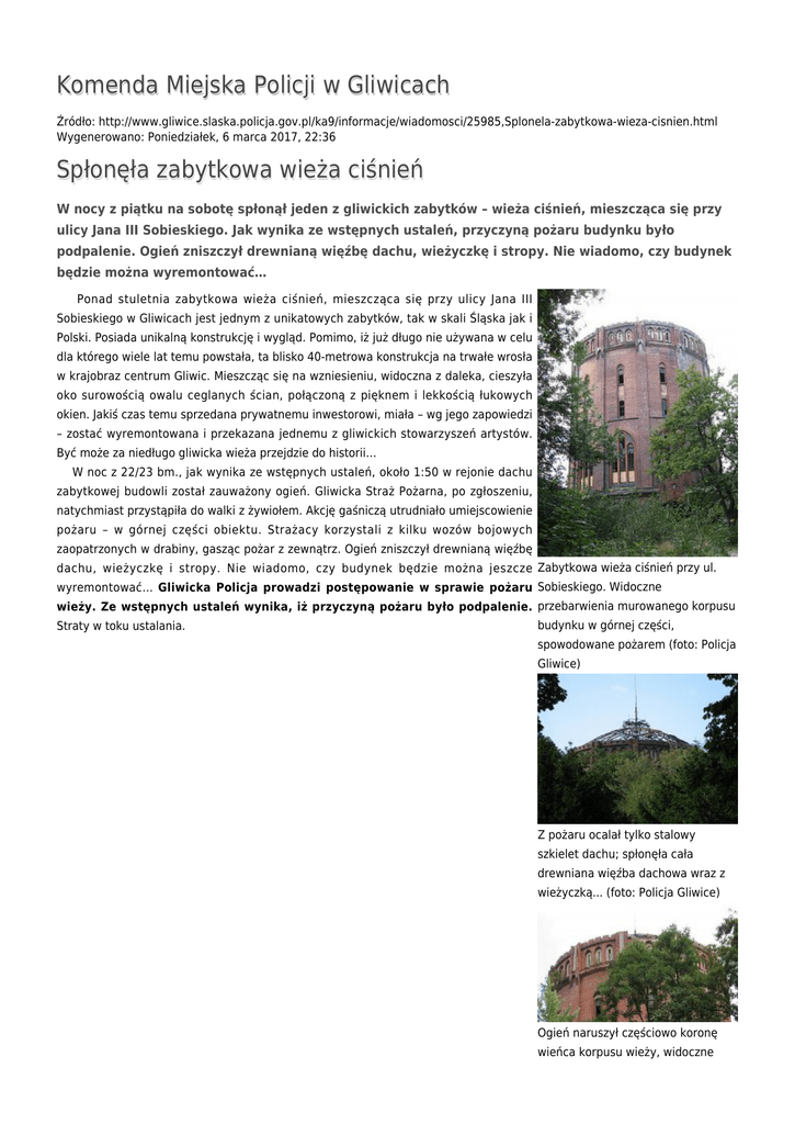 Komenda Miejska Policji w Gliwicach Źródło: http://www.gliwice.slaska.policja.gov.pl/ka9/informacje/wiadomosci/25985,Splonela-zabytkowa-wieza-cisnien.html Wygenerowano: Poniedziałek, 6 marca 2017, 22:36 Spłonęła zabytkowa wieża ciśnień W nocy z piątku na sobotę spłonął jeden z gliwickich zabytków – wieża ciśnień, mieszcząca się przy ulicy Jana III Sobieskiego. Jak wynika ze wstępnych ustaleń, przyczyną pożaru budynku było podpalenie. Ogień zniszczył drewnianą więźbę dachu, wieżyczkę i stropy. Nie wiadomo, czy budynek będzie można wyremontować… Ponad stuletnia zabytkowa wieża ciśnień, mieszcząca się przy ulicy Jana III Sobieskiego w Gliwicach jest jednym z unikatowych zabytków, tak w skali Śląska jak i Polski. Posiada unikalną konstrukcję i wygląd. Pomimo, iż już długo nie używana w celu dla którego wiele lat temu powstała, ta blisko 40-metrowa konstrukcja na trwałe wrosła w krajobraz centrum Gliwic. Mieszcząc się na wzniesieniu, widoczna z daleka, cieszyła oko surowością owalu ceglanych ścian, połączoną z pięknem i lekkością łukowych okien. Jakiś czas temu sprzedana prywatnemu inwestorowi, miała – wg jego zapowiedzi – zostać wyremontowana i przekazana jednemu z gliwickich stowarzyszeń artystów. Być może za niedługo gliwicka wieża przejdzie do historii… W noc z 22/23 bm., jak wynika ze wstępnych ustaleń, około 1:50 w rejonie dachu zabytkowej budowli został zauważony ogień. Gliwicka Straż Pożarna, po zgłoszeniu, natychmiast przystąpiła do walki z żywiołem. Akcję gaśniczą utrudniało umiejscowienie pożaru – w górnej części obiektu. Strażacy korzystali z kilku wozów bojowych zaopatrzonych w drabiny, gasząc pożar z zewnątrz. Ogień zniszczył drewnianą więźbę dachu, wieżyczkę i stropy. Nie wiadomo, czy budynek będzie można jeszcze Zabytkowa wieża ciśnień przy ul. wyremontować… Gliwicka Policja prowadzi postępowanie w sprawie pożaru Sobieskiego. Widoczne wieży. Ze wstępnych ustaleń wynika, iż przyczyną pożaru było podpalenie. przebarwienia murowanego korpusu Straty w toku ustalania. budynku w górnej części, spowodowane pożarem (foto: Policja Gliwice) Z pożaru ocalał tylko stalowy szkielet dachu; spłonęła cała drewniana więźba dachowa wraz z wieżyczką... (foto: Policja Gliwice) Ogień naruszył częściowo koronę wieńca korpusu wieży, widoczne miejsca skąd runęły gzymsy (foto: Policja Gliwice) Rejon nieczynnej już od lat wieży jest często patrolowany przez policjantów KP I Gliwice. Jednakże pozbawiona właściwej ochrony i opieki ze strony kolejnych właścicieli przed lokalnymi menelami, powoli wieża ulegała dewastacji... (foto: Policja Gliwice) Ocena: 0/5 (0) Tweetnij
