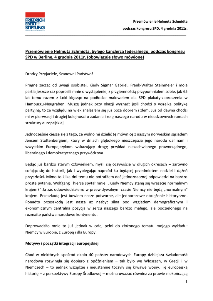 Przemówienie Helmuta Schmidta podczas kongresu SPD, 4 grudnia 2011r. ___________________________________________________________________________ Przemówienie Helmuta Schmidta, byłego kanclerza federalnego, podczas kongresu SPD w Berline, 4 grudnia 2011r. (obowiązuje słowo mówione) Drodzy Przyjaciele, Szanowni Państwo! Pragnę zacząć od uwagi osobistej. Kiedy Sigmar Gabriel, Frank-Walter Steinmeier i moja partia jeszcze raz poprosili mnie o wystąpienie, z przyjemnością przypomniałem sobie, jak 65 lat temu razem z Loki klęcząc na podłodze malowałem dla SPD plakaty-zaproszenia w Hamburgu-Neugraben. Muszę jednak przy okazji wyznać: jeśli chodzi o wszelką politykę partyjną, to ze względu na wiek znalazłem się już poza dobrem i złem. Już od dawna chodzi mi w pierwszej i drugiej kolejności o zadania i rolę naszego narodu w nieodzownych ramach struktury europejskiej. Jednocześnie cieszę się z tego, że wolno mi dzielić tę mównicę z naszym norweskim sąsiadem Jensem Stoltenbergiem, który w dniach głębokiego nieszczęścia jego narodu dał nam i wszystkim Europejczykom wskazujący drogę przykład niezachwianego praworządnego, liberalnego i demokratycznego przywództwa. Będąc już bardzo starym człowiekiem, myśli się oczywiście w długich okresach – zarówno cofając się do historii, jak i wybiegając naprzód ku będącej przedmiotem nadziei i dążeń przyszłości. Mimo to kilka dni temu nie potrafiłem dać jednoznacznej odpowiedzi na bardzo proste pytanie. Wolfgang Thierse spytał mnie: „Kiedy Niemcy staną się wreszcie normalnym krajem?“ Ja zaś odpowiedziałem: w przewidywalnym czasie Niemcy nie będą „normalnym“ krajem. Przeszkodą jest bowiem nasze potworne, ale jednorazowe obciążenie historyczne. Ponadto przeszkodą jest nasza aż nazbyt silna pod względem demograficznym i ekonomicznym centralna pozycja w sercu naszego bardzo małego, ale podzielonego na rozmaite państwa narodowe kontynentu. Doprowadziło mnie to już jednak w całej pełni do złożonego tematu mojego wykładu: Niemcy w Europie, z Europą i dla Europy. Motywy i początki integracji europejskiej Choć w niektórych spośród około 40 państw narodowych Europy dzisiejsza świadomość narodowa rozwinęła się dopiero z opóźnieniem – tak było we Włoszech, w Grecji i w Niemczech – to jednak wszędzie i nieustannie toczyły się krwawe wojny. Tę europejską historię – z perspektywy Europy Środkowej – można uważać również za prawie niekończącą 1 Przemówienie Helmuta Schmidta podczas kongresu SPD, 4 grudnia 2011r. ___________________________________________________________________________ się serię walk pomiędzy peryferiami i centrum oraz odwrotnie, pomiędzy centrum i peryferiami. Centrum nieustannie pozostawało przy tym decydującym polem bitwy. Kiedy władcy, państwa lub narody w centrum Europy byli słabi względnie były słabe, to ich sąsiedzi z peryferii wdzierali się do słabego centrum. Do największych zniszczeń i relatywnie największych strat w ludziach doszło podczas pierwszej wojny trzydziestoletniej w latach 1618–1648, która rozegrała się głównie na ziemi niemieckiej. Niemcy były wtedy jedynie pojęciem geograficznym, nieostro definiowanym jedynie przez niemiecki obszar językowy. Później przyszli Francuzi pod wodzą Ludwika XIV i ponownie pod wodzą Napoleona. Szwedzi nie przyszli po raz drugi; wielokrotnie przyszli jednak Anglicy i Rosjanie, ostatni raz pod wodzą Stalina. Kiedy jednak dynastie lub państwa w centrum Europy były silne – lub kiedy czuły się silne! – to z kolei one wdzierały się na peryferia. Dotyczyło to już wypraw krzyżowych, które były zarazem podbojami, nie tylko w kierunku Azji Mniejszej i Jerozolimy, lecz również w kierunku Prus Wschodnich i wszystkich trzech dzisiejszych państw bałtyckich. W okresie nowożytnym dotyczyło to wojny z Napoleonem oraz trzech wojen Bismarcka w latach 1864, 1866, 1870/71. To samo dotyczy przede wszystkim drugiej wojny trzydziestoletniej od 1914 do 1945 roku. Dotyczy zwłaszcza wojskowych pochodów Hitlera aż po Przylądek Północny, aż po Kaukaz, Kretę, po południową Francję, a nawet aż po Tobruk w pobliżu granicy libijsko-egipskiej. Sprowokowana przez Niemcy katastrofa Europy była również katastrofą europejskich Żydów i katastrofą niemieckiego państwa narodowego. Wcześniej jednak Polacy, Bałtowie, Czesi, Słowacy, Austriacy, Węgrzy, Słoweńcy i Chorwaci podzielili los Niemców, ponieważ oni wszyscy od wieków cierpieli z powodu ich centralnego pod względem geopolitycznym położenia na tym małym europejskim kontynencie. Albo innymi słowy: my, Niemcy, wielokrotnie sprawiliśmy, że inni cierpieli z powodu naszego centralnego, mocarstwowego położenia. Sprzeczne roszczenia terytorialne, konflikty językowe i graniczne, które jeszcze w pierwszej połowie XX wieku odgrywały bardzo dużą rolę w świadomości ludzi, obecnie de facto w znacznej mierze straciły znaczenie, przynajmniej dla nas Niemców. O ile w świadomości opinii publicznej i w opinii publikowanej wiedza i pamięć o średniowiecznych wojnach w znacznej mierze się zatarła, to pamięć o obu wojnach światowych XX wieku i o okupacji niemieckiej wciąż odgrywa jeszcze w ukryciu dominującą rolę. 2 Przemówienie Helmuta Schmidta podczas kongresu SPD, 4 grudnia 2011r. ___________________________________________________________________________ Dla nas Niemców decydujące wydaje mi się to, że prawie wszyscy sąsiedzi Niemiec – a poza tym prawie wszyscy Żydzi na całym świecie – pamiętają holocaust i haniebne czyny, które wydarzyły się w okresie niemieckiej okupacji w krajach położonych na peryferiach. My Niemcy nie jesteśmy jeszcze wystarczająco świadomi tego, że wśród prawie wszystkich naszych sąsiadów jeszcze przez wiele pokoleń będzie istniała ukryta nieufność do Niemców. Także urodzone później pokolenia Niem