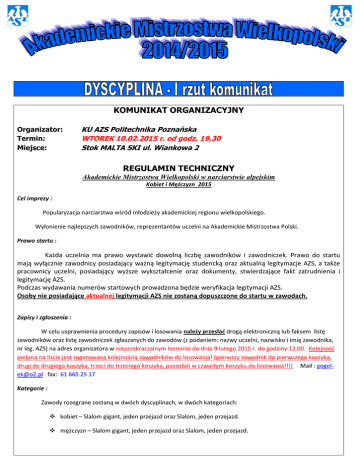 KOMUNIKAT ORGANIZACYJNY Organizator: Termin: Miejsce: KU AZS Politechnika Poznańska WTOREK 10.02.2015 r. od godz. 19,30 Stok MALTA SKI ul. Wiankowa 2 REGULAMIN TECHNICZNY Akademickie Mistrzostwa Wielkopolski w narciarstwie alpejskim Kobiet i Mężczyzn 2015 Cel imprezy : Popularyzacja narciarstwa wśród młodzieży akademickiej regionu wielkopolskiego. Wyłonienie najlepszych zawodników, reprezentantów uczelni na Akademickie Mistrzostwa Polski. Prawo startu : Każda uczelnia ma prawo wystawid dowolną liczbę zawodników i zawodniczek. Prawo do startu mają wyłącznie zawodnicy posiadający ważną legitymację studencką oraz aktualną legitymacje AZS, a także pracownicy uczelni, posiadający wyższe wykształcenie oraz dokumenty, stwierdzające fakt zatrudnienia i legitymację AZS. Podczas wydawania numerów startowych prowadzona będzie weryfikacja legitymacji AZS. Osoby nie posiadające aktualnej legitymacji AZS nie zostaną dopuszczone do startu w zawodach. Zapisy i zgłoszenia : W celu usprawnienia procedury zapisów i losowania należy przesład drogą elektroniczną lub faksem listę zawodników oraz listę zawodniczek zgłaszanych do zawodów (z podaniem: nazwy uczelni, nazwisko i imię zawodnika, nr leg. AZS) na adres organizatora w nieprzekraczalnym terminie do dnia 9 lutego 2015 r. do godziny 12.00. Kolejnośd podana na liście jest sugerowaną kolejnością zawodników do losowania! (pierwszy zawodnik do pierwszego koszyka, drugi do drugiego koszyka, trzeci do trzeciego koszyka, pozostali w czwartym koszyku do losowania!!!) Mail : [email protected] fax: 61 665 25 17 Kategorie : Zawody rozegrane zostaną w dwóch dyscyplinach, w dwóch kategoriach: kobiet – Slalom gigant, jeden przejazd oraz Slalom, jeden przejazd. mężczyzn – Slalom gigant, jeden przejazd oraz Slalom, jeden przejazd. Sposób rozgrywania zawodów : Zawody w pierwszej kolejności rozegrane zostaną na trasie slalomu giganta (1 przejazd) a potem slalomu (1 przejazd), według NRS, ze zmianami wynikającymi ze specyfiki stoku. O kolejności startu poszczególnych zawodników do slalomu giganta decyduje organizator (komisyjne losowanie zgłoszonych zawodników na podstawie list zgłoszeń, pozostali zawodnicy bezpośrednio przed zawodami zostają dopisani do listy, jednak nie więcej jak dwie osoby z każdej uczelni). Do drugiego przejazdu – slalom; pierwszych 30 zawodników oraz 20 zawodniczek z najlepszymi czasami ze slalomu giganta w odwrotnej kolejności wg uzyskanych czasów. Pozostali, kolejność według czasów z pierwszego przejazdu. Ze względu na możliwość wystąpienia trudnych warunków - brak pokrywy śnieżnej. Klub zgłaszając zawodnika ponosi całkowitą odpowiedzialność za poziom jego przygotowania do imprezy. Program zawodów : godz. 19.00 – 19.40 - weryfikacja legitymacji AZS oraz odbieranie numerów startowych, godz. 19.45 – 20.00 - trening , oglądanie trasy slalomu giganta godz. 20.01 - start zawodniczek i zawodników do slalomu giganta godz. 20.40 - oglądanie trasy slalomu godz. 20.55 - start zawodniczek i zawodników do slalomu godz. 21.40 - ogłoszenie wyników, wręczenie dyplomów i nagród UWAGA !!! Należy mied na uwadze że, podane czasy są bardzo orientacyjne i jest dalece prawdopodobne, że ulegną zmianie. Punktacja i klasyfikacja : Mistrzostwa będą punktowane w konkurencjach indywidualnych oraz drużynowo, oddzielnie dla kobiet i mężczyzn. 1. Indywidualnie klasyfikacja zawodników / zawodniczek wg czasów uzyskanych w przejazdach. Zwycięzcą indywidualnym zostaje zawodnik / zawodniczka, którzy zgodnie z regulaminem pokona dystans w najkrótszym czasie. Osobno w konkurencji slalomu giganta i osobno w konkurencji slalomu oraz indywidualnie w klasyfikacji generalnej za dwubój (suma czasów za slalom gigant + slalom) 2. Drużynowo generalnie oddzielnie dla kobiet i mężczyzn w dwuboju (suma czasów za slalom gigant + slalom). Każdy zawodnik w wyścigu otrzymuje punkty wg następującego klucza: 1 miejsce – 0 pkt., 2 miejsce – 2 pkt., 3 miejsce – 3 pkt. Itd. Do drużynowej klasyfikacji generalnej brani pod uwagę będą trzej najlepsi zawodnicy i trzy najlepsze zawodniczki z każdej drużyny, oddzielnie dla kobiet i mężczyzn. Na podstawie sumy czasów z dwóch przejazdów (slalom gigant + slalom) Zwycięzcą drużynowym zostaje zespół z najmniejszą liczbą punktów. Przy równej ilości punktów zdobytych przez dwa lub więcej zespołów, o kolejności decyduje wyższe miejsce najlepszego zawodnika. Nagrody : Za pierwsze trzy miejsca w kategoriach indywidualnych dyplomy i nagrody książkowe oraz w miarę możliwości nagrody rzeczowe ufundowane przez sponsorów. Nagrody rzeczowe losowane spośród wszystkich zawodników, którzy zostaną sklasyfikowani. Uwagi koocowe : O kwestiach spornych, interpretacji regulaminu i innych nie objętych regulaminem sprawach decyduje Sędzia Główny. Sędzia Główny może zastosowad wobec zawodników nie przestrzegających przepisów następujące kary: upomnienie ustne, wykluczenie z zawodów. Zgodnie z Narciarskim Regulaminem Sportowym zawodnik podczas zapoznawania się z trasą nie może jej przejechad próbnie. Organizator nie ponosi odpowiedzialności za następstwa wypadków zaistniałych na terenie zawodów i w trakcie zawodów, jak również za zniszczenie, uszkodzenie lub zagubienie rzeczy. Pierwsza piątka zawodników i trójka zawodniczek w konkurencjach slalom gigant i slalom, zdobywa AZS PUNKTY do klasyfikacji AMP zgodnie z regulaminem AMP. Ze sportowym pozdrowieniem Odpowiedzialny za organizację imprezy : kol. Bartosz Gogolewski KU AZS PP