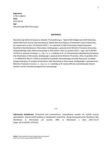 1 Sygnatura II FSK 1138/13 Data 2015.04.23 Sąd Naczelny Sąd Administracyjny SENTENCJA Naczelny Sąd Administracyjny w składzie: Przewodniczący - Sędzia NSA Małgorzata Wolf-Kalamala, Sędzia NSA Anna Dumas (sprawozdawca), Sędzia NSA Jerzy Rypina, Protokolant Justyna Nawrocka, po rozpoznaniu w dniu 23 kwietnia 2015 r. na rozprawie w Izbie Finansowej skargi kasacyjnej Dyrektora Izby Skarbowej w Warszawie, działającego z upoważnienia Ministra Finansów od wyroku Wojewódzkiego Sądu Administracyjnego w Warszawie z dnia 21 grudnia 2012 r. sygn. akt III SA/Wa 1373/12 w sprawie ze skargi L. [...] sp. z o. o. z siedzibą w W. na interpretację indywidualną Dyrektora Izby Skarbowej w Warszawie, działającego z upoważnienia Ministra Finansów z dnia 12 grudnia 2011 r. nr IPPB2/415-841/11-2/MG w przedmiocie podatku dochodowego od osób fizycznych 1) oddala skargę kasacyjną, 2) zasądza od Dyrektora Izby Skarbowej w Warszawie, działającego z upoważnienia Ministra Finansów na rzecz L. [...] sp. z o. o. z siedzibą w W. kwotę 180 (sto osiemdziesiąt) złotych tytułem zwrotu kosztów postępowania kasacyjnego. *** Informacja dodatkowa: Orzeczenie jest prawomocne. Uzasadnienie wyroku nie zostało jeszcze sporządzone. Wyrok został wydany w następstwie wniesienia skargi kasacyjnej przez Dyrektora Izby Skarbowej w Warszawie od wyroku WSA w Warszawie z dnia 2012-12-21 (sygn. akt III SA/Wa 1373/12). Źródło: Centralna Baza Orzeczeń Sądów Administracyjnych http://orzeczenia.nsa.gov.pl/doc/A2407F1419