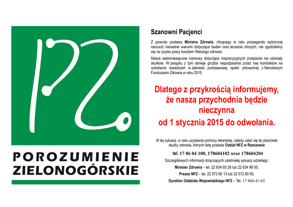 Szanowni Pacjenci Z powodu postawy Ministra Zdrowia, chcącego w celu propagandy wyborczej narzucić nierealne warunki dotyczące badań oraz leczenia chorych, nie zgodziliśmy się na ryzyko pracy kosztem Waszego zdrowia. Nasze wielomiesięczne rozmowy dotyczące nieprecyzyjnych przepisów nie odniosły skutków. W związku z tym istnieje groźba niepodpisania przez nas kontraktów na udzielanie świadczeń w zakresie podstawowej opieki zdrowotnej z Narodowym Funduszem Zdrowia w roku 2015. Dlatego z przykrością informujemy, że nasza przychodnia będzie nieczynna od 1 stycznia 2015 do odwołania. W tej sytuacji, w celu uzyskania pomocy lekarskiej, należy udać się do placówek służby zdrowia, których listę posiada Odział NFZ w Rzeszowie tel. 17 86 04 100, 178604102 oraz 178604204 Szczegółowych informacji dotyczących zaistniałej sytuacji udzielają: Minister Zdrowia – tel. 22 634 93 26 lub 22 634 96 00, Prezes NFZ – tel. 22 572 60 13 lub 22 572 60 00, Dyrektor Oddziału Wojewódzkiego NFZ – Tel. 17 860-41-02