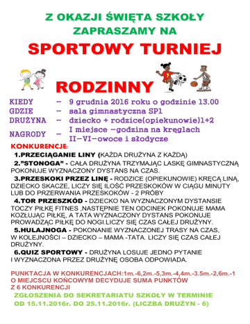 Z OKAZJI ŚWIĘTA SZKOŁY ZAPRASZAMY NA SPORTOWY TURNIEJ RODZINNY KIEDY GDZIE DRUŻYNA - 9 grudnia 2016 roku o godzinie 13.00 - sala gimnastyczna SP1 - dziecko + rodzice(opiekunowie)1+2 I miejsce -godzina na kręglach NAGRODY II-VI-owoce i słodycze KONKURENCJE: 1.PRZECIĄGANIE LINY (KAŻDA DRUŻYNA Z KAŻDĄ) 2.”STONOGA” - CAŁA DRUŻYNA TRZYMAJĄC LASKĘ GIMNASTYCZNĄ POKONUJE WYZNACZONY DYSTANS NA CZAS. 3.PRZESKOKI PRZEZ LINĘ - RODZICE (OPIEKUNOWIE) KRĘCĄ LINĄ, DZIECKO SKACZE, LICZY SIĘ ILOŚĆ PRZESKOKÓW W CIĄGU MINUTY LUB DO PRZERWANIA PRZESKOKÓW - 2 PRÓBY 4.TOR PRZESZKÓD - DZIECKO NA WYZNACZONYM DYSTANSIE TOCZY PIŁKĘ FITNES ,NASTĘPNIE TEN ODCINEK POKONUJE MAMA KOZŁUJĄC PIŁKĘ, A TATA WYZNACZONY DYSTANS POKONUJE PROWADZĄC PIŁKĘ DO NOGI.LICZY SIĘ CZAS CAŁEJ DRUŻYNY. 5.HULAJNOGA - POKONANIE WYZNACZONEJ TRASY NA CZAS, W KOLEJNOŚCI – DZIECKO – MAMA -TATA. LICZY SIĘ CZAS CAŁEJ DRUŻYNY. 6.QUIZ SPORTOWY - DRUŻYNA LOSUJE JEDNO PYTANIE I WYZNACZONA PRZEZ DRUŻYNĘ OSOBA ODPOWIADA. PUNKTACJA W KONKURENCJACH:1m.-6,2m.-5,3m.-4,4m.-3.5m.-2,6m.-1 O MIEJCSCU KOŃCOWYM DECYDUJE SUMA PUNKTÓW Z 6 KONKURENCJI ZGŁOSZENIA DO SEKRETARIATU SZKOŁY W TERMINIE OD 15.11.2016r. DO 25.11.2016r. (LICZBA DRUŻYN - 6)