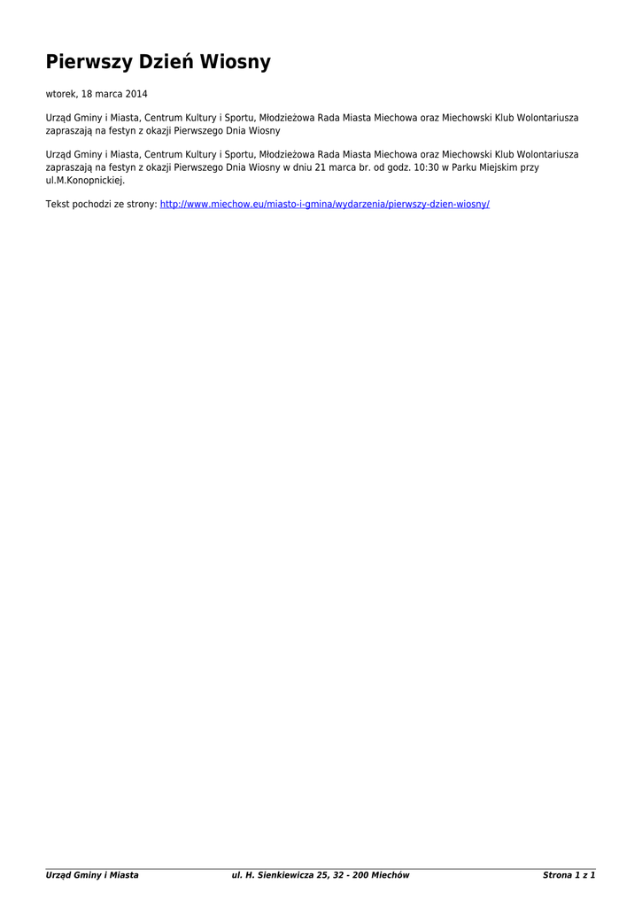 Pierwszy Dzień Wiosny wtorek, 18 marca 2014 Urząd Gminy i Miasta, Centrum Kultury i Sportu, Młodzieżowa Rada Miasta Miechowa oraz Miechowski Klub Wolontariusza zapraszają na festyn z okazji Pierwszego Dnia Wiosny Urząd Gminy i Miasta, Centrum Kultury i Sportu, Młodzieżowa Rada Miasta Miechowa oraz Miechowski Klub Wolontariusza zapraszają na festyn z okazji Pierwszego Dnia Wiosny w dniu 21 marca br. od godz. 10:30 w Parku Miejskim przy ul.M.Konopnickiej. Tekst pochodzi ze strony: http://www.miechow.eu/miasto-i-gmina/wydarzenia/pierwszy-dzien-wiosny/ Urząd Gminy i Miasta ul. H. Sienkiewicza 25, 32 - 200 Miechów Strona 1 z 1
