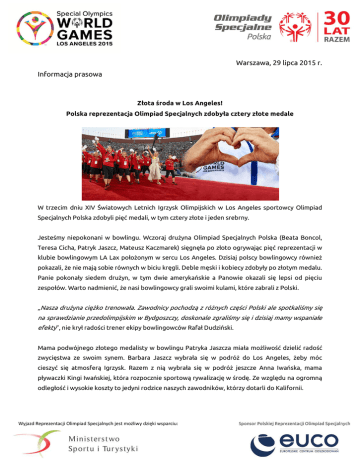 Warszawa, 29 lipca 2015 r. Informacja prasowa Złota środa w Los Angeles! Polska reprezentacja Olimpiad Specjalnych zdobyła cztery złote medale W trzecim dniu XIV Światowych Letnich Igrzysk Olimpijskich w Los Angeles sportowcy Olimpiad Specjalnych Polska zdobyli pięć medali, w tym cztery złote i jeden srebrny. Jesteśmy niepokonani w bowlingu. Wczoraj drużyna Olimpiad Specjalnych Polska (Beata Boncol, Teresa Cicha, Patryk Jaszcz, Mateusz Kaczmarek) sięgnęła po złoto ogrywając pięć reprezentacji w klubie bowlingowym LA Lax położonym w sercu Los Angeles. Dzisiaj polscy bowlingowcy również pokazali, że nie mają sobie równych w biciu kręgli. Deble męski i kobiecy zdobyły po złotym medalu. Panie pokonały siedem drużyn, w tym dwie amerykańskie a Panowie okazali się lepsi od pięciu zespołów. Warto nadmienić, że nasi bowlingowcy grali swoimi kulami, które zabrali z Polski. „Nasza drużyna ciężko trenowała. Zawodnicy pochodzą z różnych części Polski ale spotkaliśmy się na sprawdzianie przedolimpijskim w Bydgoszczy, doskonale zgraliśmy się i dzisiaj mamy wspaniałe efekty”, nie krył radości trener ekipy bowlingowców Rafał Dudziński. Mama podwójnego złotego medalisty w bowlingu Patryka Jaszcza miała możliwość dzielić radość zwycięstwa ze swoim synem. Barbara Jaszcz wybrała się w podróż do Los Angeles, żeby móc cieszyć się atmosferą Igrzysk. Razem z nią wybrała się w podróż jeszcze Anna Iwańska, mama pływaczki Kingi Iwańskiej, która rozpocznie sportową rywalizację w środę. Ze względu na ogromną odległość i wysokie koszty to jedyni rodzice naszych zawodników, którzy dotarli do Kalifornii. Wyjazd Reprezentacji Olimpiad Specjalnych jest możliwy dzięki wsparciu: „Jesteśmy reprezentantami wszystkich rodziców polskich zawodników Olimpiad Specjalnych. Kibicujemy wszystkim naszym sportowcom”, podkreślają Barbara Jaszcz i Anna Iwańska. Już drugie złoto (we wtorek i dzisiaj) wywalczyliśmy w mało znanej w Polsce dyscyplinie bocce. Podwójnym złotym medalistą został Rafał Bednarczyk. Rafał jest zawodnikiem klubu Halembianka z Rudy Śląskiej, a bocce trenuje od 2006 roku. Bocce to jedna z odmian gry w kule, podobna do bul prowansalskich. Gra ta rozwinęła się we Włoszech, a wywodzi się z gry z wykorzystaniem kul, popularnej jeszcze w czasach Imperium Rzymskiego. Nie zawodzą nasi pływacy. Po dwóch medalach, złotym i srebrnym, wywalczonych przez Sebastiana Wilmana i Andrzeja Motykę przyszedł czas na kolejne złoto. Bezkonkurencyjna na 50 metrach stylem dowolnym okazała się Elżbieta Kasprzyk. Nasza zawodniczka trenuje od 15 lat pod okiem Ewa Hałambiec, która jest również trenerem naszej reprezentacji pływackiej w Los Angeles. Pani Ewa jest nauczycielem wychowania fizycznego w Zespole Szkół Specjalnych w Kędzierzynie-Koźlu. Elżbieta jest jej wychowanką od piętnastu lat. Nasza trenerka nie kryła dzisiaj łez wzruszenia i podkreślała jak sport zmienił Elżbietę Kasprzyk. „Gdy Elżbieta miała siedem lat była skryta i zamknięta w sobie. Teraz potrafi stawiać czoła światu. Ale sukces nie przychodzi sam. Ela bardzo ciężko trenuje i dzisiaj możemy cieszyć się ze słota. Olimpiady Specjalne zmieniają ludzi”, podkreśla Ewa Hałambiec, trenerka i szefowa oddziału opolskiego Olimpiad Specjalnych. Mamy też srebrny medal we wrotkarstwie. Zaciętą walkę w wyścigu na 1000 metrów stoczył Emil Drozd. Uległ tylko reprezentantowi Meksyku. „Jestem dumny ze srebrnego medalu. Przez większość wyścigu prowadziłem, na końcu nieco opadłem z sił. Bardzo podoba mi się w Los Angeles a najbardziej mili, przyjaźni ludzie”, powiedział Emil Drozd. Rzeczywiście, to już trzeci dzień Igrzysk a kibiców nie ubywa. Wszystkie obiekty sportowe przez cały dzień są wypełnione widzami. „Publiczność wspaniale dopinguje publiczność. Kibice w Los Angeles są niesamowici, wspaniale doceniają wysiłek, jaki włożyli w walkę z własnymi przeciwnościami reprezentanci Olimpiad Specjalnych. Warto, żeby wszyscy na całym świecie wyciągnęli wnioski z amerykańskiej lekcji”, podkreśla Joanna Styczeń-Lasocka, Dyrektor Generalny Olimpiad Specjalnych Polska. Wyjazd Reprezentacji Olimpiad Specjalnych jest możliwy dzięki wsparciu: To nie wszystkie występy reprezentantów Olimpiad Specjalnych Polska. Nasi koszykarze przegrali z Izraelem a piłkarki nożne uległy Szwedkom. W lekkoatletyce odbywały się preeliminacje w skoku w dal i sztafecie 4x100 metrów. Kajakarze także mieli preeliminacje - w wyścigu na 500 metrów. Badmintoniści trenowali a drużyny tenisa stołowego i trójboju siłowego uczestniczyli w programie „Zdrowi Sportowcy”. XIV Światowe Letnie Igrzyska Olimpiad Specjalnych w Los Angeles to największe sportowe i humanitarne wydarzenie na świecie w 2015 roku. To także największa impreza sportowa, odbywająca się w Los Angeles od czasu Igrzysk Olimpijskich w 1984 roku. W Igrzyskach bierze udział blisko 7 tysięcy sportowców z niepełnosprawnością intelektualną ze 177 krajów świata. Towarzyszy im blisko 3 tysiące trenerów i członków sztabów medycznych. Uczestników i organizatorów wspiera ponad 30 tysięcy wolontariuszy, a zmagania na żywo obejrzy blisko pół miliona widzów. Zmagania sportowe trwają od 25 lipca do 2 sierpnia. Ceremonia zakończenia Igrzysk odbędzie się 2 sierpnia. Polska reprezentacja na Igrzyska to 60 zawodników, którzy rywalizują w 15 dyscyplinach sportowych: badmintonie, bocce, bowlingu, gimnastyce, jeździectwie, kajakarstwie, kolarstwie, koszykówce, lekkoatletyce, piłce nożnej, pływaniu, tenisie ziemnym, tenisie stołowym, trójboju siłowym i wrotkarstwie. Towarzyszy im 27 osób sztabu kadry, trenerów i personelu medycznego. Instytucją wspierającą wyjazd Polskiej Reprezentacji Olimpiad Specjalnych jest Ministerstwo sportu i Turystyki. Sponsorem Polskiej Reprezentacji Olimpiad Specjalnych 