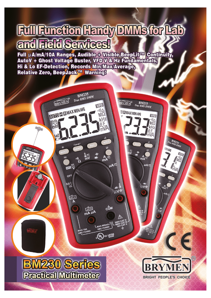 Nr kat. 102138 Nr kat. 102137 Nr kat. 102173 Duży i czytelny wyświetlacz LCD 3⁵⁄ cyfry Szybki pomiar: 5x/s z automatycznym wyborem zakresów Inteligenta funkcja Auto Power Off Pomiar TrueRMS AC Funkcja Data Hold Rejestracja odczytu MAX/MIN oraz AVG w tym samym czasie Funkcja VFD (V&Hz) przeznaczona do jednoczesnego pomiaru napięcia i częstotliwości większości falowników Podświetlany wyświetlacz LCD - białe podświetlenie typu „PAPER WHITE” Pomiar ciągłości BeepLit - sygnał dźwiękowy oraz sygnalizacja wizualna przy zwarciu Pomiar wartości względnej Bezkontaktowa detekcja napięcia elektrycznego (NCV) z wyborem czułości Hi/Lo Kontaktowa (jednobiegunowa) detekcja napięcia elektrycznego AutoV LoZ - automatyczny wybór pomiaru DCV lub ACV obniżona impedancja LoZ aby wyeliminować napięcie fantomowe Pomiar DCV/ACV od 600mV do 1000V Pomiar rezystancji od 600,0Ω do 60,00MΩ Pomiar pojemności Cx od 20,00nF do 10,00mF pomocny przy pomiarach rozruchu silników Pomiar częstotliwości od 99,99Hz do 50,00kHz Pomiar DCA/ACA w zakresie od 600μA do 10,00A (20A przez 30s z 5 minutową przerwą na chłodzenie Pomiar temperatury sondą typu K od -40°C do 400°C lub -40°F do 752°F BEEP-JACK™ akustyczna i wizualna sygnalizacja złego połączenia przewodów Test diody Obudowa z trudno palnego tworzywa Uniwersalna podstawka umożliwiająca postawienie lub zawieszenie przyrządu Opcjonalny uchwyt magnetyczny Baterie i bezpieczniki chronione klapką Wysoka ochrona przepięciowa aż do 6kV 1,2/50μs LVD: EN61010-1/-2-030/-2-033 CAT II 1kV, CAT III 600V i CAT IV 300V EMC: EN61326-1:2013 Podświetlany wyświetlacz “Paper White” łatwy odczyt danych w ciemności Zmiana zakresów ręczna lub automatyczna Pomiar TrueRMS dla przebiegów odkształconych ACA / ACV Duży wyświetlacz LCD 6000 wskazań szybkie próbkowanie 5x/s Zapis Max/Min avg Zapis wartości Max/Min i obliczanie wartości średniej Przycisk przełączający pomiędzy podwójnymi funkcjami miernika Tryb pomiarów względnych różnica wartości mierzonej i zapamiętanej Pomiar częstotliwości ze zmienna czułością VFD V & Hz pomiar częstotliwości ze zmienną czułością DATA HOLD “zamrożenie” pomiaru na LCD Pomiar napięcia z wysoką impedancją wejściową zapewniający ochronę badanego obwodu (EF) Bezkontaktowa detekcja pola elektrycznego (Hi/Lo) za pomocą jednej sondy Szeroki zakres pomiaru μA, mA, A, 6 zakresów prądowych chronionymi bezpiecznikami1000V AutoV LoZ automatyczny wybór pomiaru DCV lub ACV obniżona impedancja LoZ aby wyeliminować napięcia fantomowe BeepLit™ - pomiar ciągłości z alarmem dźwiękowym oraz migoczącym podświetleniem LCD - przydatne przy pomiarach w hałasie Ghost - voltage - buster funkcja usuwania napięć fantomowych BEEP-JACK™ akustyczny i wizualny alarm złego podłączenia Pomiar temperatura sondą K pomiar w °C i °F Inteligentne automatyczne wyłączanie dla oszczędności baterii Ochronny holster z uchwytami na sondy z opcją zawieszenia lub postawienia miernika Wysoka ochrona przepięciowa aż do 6kV 1.2/50μs EMC EN61326-1:2013 LVD - Zgodnie z wymaganiami EN61010-1/-2-030/-2-033 CAT II 1kV & CAT III 600V SPECYFIKACJA OGÓLNA Wyświetlacz: LCD 3-5/6 cyfry, max wskazań: 6000 Próbkowanie: 5 razy/s Temperatura pracy: -10°C - 45°C Wilgotność względna: Maksymalnie 80% do temp. 31°C spadająca liniowo do 50% dla temperatury 45°C Maksymalna wysokość pracy: 2000m n.p.m Temp. Przechowywania: -20°C - 60°C, RH < 80% (bez baterii) Wsp. Temperaturowy: 0,15 x (określona dokładność) / °C dla temp. -10°C - 18°C i 28°C - 45°C Tryb pomiaru: TrueRMS Klasa szczelności: IP40 Stopień zanieczyszczenia: 2 Bezpieczeństwo (kategorie pomiarowe): IEC/UL/EN61010-1 Ed. 3.0, IEC/UL/EN61010-2-030 Ed. 1.1 CAN/CSA-C22.2, kategorie pomiarowe CAT II 1000V AC/DC, CAT III 600V AC/DC, CAT IV 300V AC/DC Ochrona przeciwnapięciowa: 6,0kV (1,2/50µs SURGE) BeepJack dla gniazda A (tylko BM237R i BM 239R) Kompatybilność elektromagnetyczna: Zgodność z EN61326-1:2013 W polu RF (częstotliwość radiowa) 3V/m Funkcja pomiaru temperatury: nie została określona Funkcja Ω: Całkowita dokładność = określona dokładność Inne funkcje: Całkowita dokładność = Określona dokładność Dokładność pomiarów w polu powyżej 3V/m nie została określona. Zabezpieczenia wejść: A: 11A/1000V DC/AC rms, IR 20kA, bezpiecznik typu F lub lepszy V i AutoV i L3: 1100V DC/AC rms mV, Ohm i inne: 1000V DC/AC rms Sygnalizacja słabej baterii: Tak (dla zasilania poniżej ~2,5V) Zasilanie: 2x baterie typu AAA (1,5V) Pobór prądu (typowo): 3,2mA Pobór prądu w trybie APO (typowo): 10µA Automatyczne wyłącznie zasilania (APO): Po ~30 minutach bezczynności Wymiary / waga: (szer x gł wys): 80 x 50 x 161mm / 334 g (z pokrowcem) Wyposażenie: Przewody pomiarowe (para), baterie, instrukcja obsługi BKP 60 - sonda temperatury typu K z podwójnym wtykiem bananowym (BM239R) Wyposażanie opcjonalne: BKP32 lub TCK [602069] - adapter z podwójnym wtykiem bananowym i gniazdem sondy K (tylko Bm239R), uchwyt magnetyczny BMH-01, pokrowiec BMP-25x Funkcje specjalne: Funkcja AutoV(LoZ), test kierunku wirowania 3 daf. VFD, test ciągłości BeepLit™, autozakresy, rejestracja wartości MAX/MIN/AVG, podświetlenie LCD tryb pomiarów względnych, funkcja Hold, detekcja EF (NCV) Parametry elektryczne: Dokładność: ± (%wartości wskazania + liczba cyfr) określona dla temperatury 23°C ± 5°C Podana dokładność pomiaru prądu i napięcia przemiennego AC z pomiarem TrueRMS została określona dla obszaru 1% - 100% zakresu pomiarowego. Maksymalna wartość współczynnika szczytu CREST wynosi <2:1 w pełnej skali i <4:1 w połowie skali. Podane wartości współczynnika szczytu CREST odnoszą się do sygnałów niesinusoidalnych (zawierających harmoniczne , których częstotliwość zawiera się w podanym zakresie. Napięcie AC Zakres Pomiar temperatury (tylko BM235) Ohm Dokładnoś