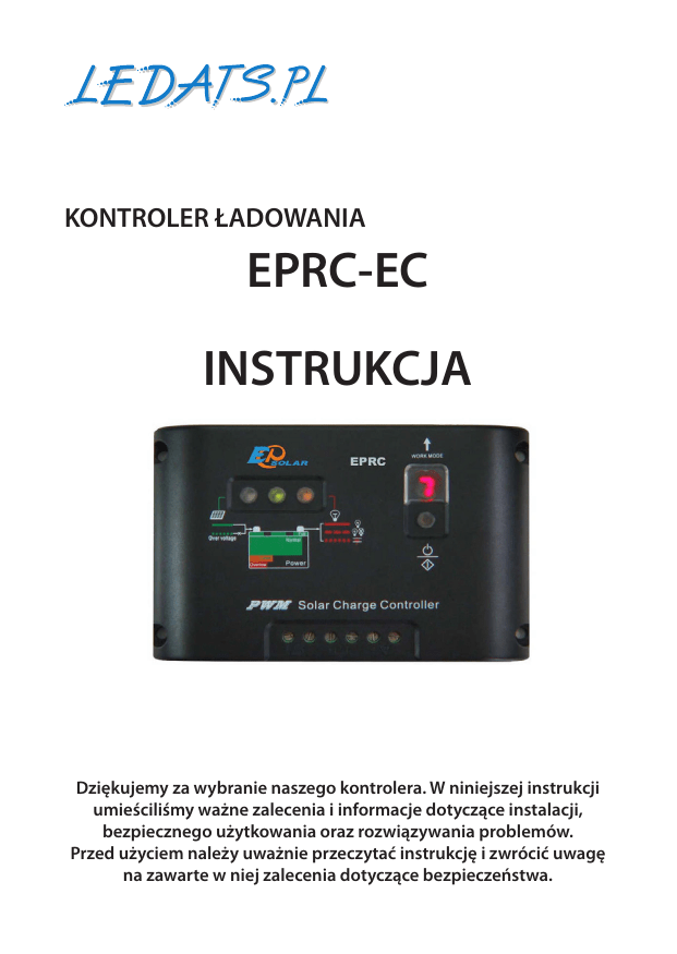 KONTROLER ŁADOWANIA EPRC-EC INSTRUKCJA Dziękujemy za wybranie naszego kontrolera. W niniejszej instrukcji umieściliśmy ważne zalecenia i informacje dotyczące instalacji, bezpiecznego użytkowania oraz rozwiązywania problemów. Przed użyciem należy uważnie przeczytać instrukcję i zwrócić uwagę na zawarte w niej zalecenia dotyczące bezpieczeństwa. KONTROLER ŁADOWANIA EPRC-EC Instrukcja obsługi i instalacji Napięcie nominalne Nominalny prąd ładowania EPRC-5-EC 5 A EPRC-10-EC 10 A - 12 V / 24 V* - 5A - 10 A * Kontroler podczas uruchomienia automatycznie rozpoznaje napięcie znamionowe układu. Jeśli napięcie akumulatora(ów) jest niższe niż 18 V, system zostaje rozpoznany jako 12 woltowy. Jeżeli napięcie akumulatora(ów) jest wyższe niż 18 V, system jest rozpoznawany jako 24 woltowy. EPRC-x-EC - 5 A, 10 A PARAMETRY TECHNICZNE parametr EPRC-5-EC 12V EPRC-10-EC 24V 12V 24V maksymalny prąd generowany przez panel solarny 5A 10 A maksymalny prąd pobierany przez odbiorniki 5A 10 A zwłoka w przypadku przeciążenia po stronie odbiorników o 25% 60 sekund 60 sekund napięcie ładowania wyrównującego (60 minut) 14,8 V 29,6 V 14,8 V 29,6 V napięcie ładowania pulsacyjnego (60 minut) 14,4 V 28,8 V 14,4 V 28,8 V napięcie ładowania stabilizującego 13,7 V 27,4 V 13,7 V 27,4 V próg napięcia inicjujący ładowanie akumulatora 13,2 V 26,4 V 13,2 V 26,4 V próg ostrzeżenia przed nadmiernym rozładowaniem akumulatora 12,0 V 24,0 V 12,0 V 24,0 V próg odcięcia odbiorników (ochrona przed nadmiernym rozładowaniem akumulatora) 11,1 V 22,2 V 11,1 V 22,2 V -30mV / °C -60mV / °C max spadek napięcia ładowania ≤ 0,26 V max spadek napięcia rozładowania ≤ 0,15 V pobór własny kompensacja temperaturowa ≤ 6 mA -30mV / °C gniazda przyłączeniowe -60mV / °C 2,5 mm2 klasa ochrony IP30 temperatura pracy od -35°C do +55°C waga netto 150 g. 3 EPRC-x-EC - 5 A, 10 A Uruchomienie systemu Kontroler jest przeznaczony do systemów autonomicznych, nie połączonych z siecią energetyczną. Swoim działaniem chroni akumulator przed przeładowaniem oraz nadmiernym rozładowaniem. Proces ładowania został zoptymalizowany pod kątem wydłużenia czasu żywotności akumulatora i zwiększenia wydajności całego systemu solarnego. Chociaż kontroler jest prosty w użyciu i obsłudze, prosimy o dokładne przeczytanie i stosowanie się do niniejszej instrukcji. Pomoże to w pełni wykorzystać wszystkie funkcje oferowane przez kontroler, zwiększyć efektywność instalacji solarnej oraz uniknąć utraty gwarancji. 1. Zainstaluj kontroler na pionowej powierzchni. Zapewnij wolną przestrzeń pod i nad kontrolerem celem odpowiedniego chłodzenia i swobodnego poprowadzenia przewodów. 2. Upewnij się, że moc panela solarnego i odbiornika(ów) nie przekraczają mocy maksymalnej kontrolera. 3. Zalecamy wykonanie połączeń w następującej kolejności: akumulator, panel solarny, odbiornik (patrz. rysunek poniżej) ekran ustawień sygnalizator LED przycisk ustawień 1÷6 - kolejność wykonania podłączeń 4 EPRC-x-EC - 5 A, 10 A 4. Podłącz AKUMULATOR. Zachowaj szczególną ostrożność, nie zwieraj przewodów podłączonych do akumulatora. 5. Podłącz PANEL SOLARNY. Jeżeli panel jest oświetlony promieniami słońca zaświeci się zielona dioda sygnalizacyjna. 6. Podłącz ODBIORNIK. Jeżeli zaświeci się czerwona dioda, akumulator jest rozładowany. Należy doładować akumulator aby zakończyć instalację systemu. 7. Wciśnij przycisk ustawień i wybierz ustawienie ręcznego sterowania (6•) lub tryb testowy (7•), aby upewnić się o prawidłowej konfiguracji systemu. Sygnalizator LED sygnalizator LED Zielona dioda ŚWIECI - panel solarny ładuje akumulator. Zielona dioda MIGA - przeładowanie po stronie panela. Zielona dioda ŚWIECI - akumulator sprawny. Zielona dioda WOLNO MIGA - w pełni naładowany. Żółta dioda ŚWIECI - akumulator rozładowany. Czerwona ŚWIECI - akumulator całkowice rozładowany, odbiorniki odłączone od zasilania. Czerwona ŚWIECI - odbiorniki włączone do zasilania. Czerwona WOLNO MIGA - przeciążenie (pobierany prąd przekracza 1,25 razy dopuszczalną wartość przez 60 ekund lub 1,5 raza przez 5 sekund) odłączenie odbiorników. Czerwona MIGA - zwarcie po stronie odbiorników. UWAGA: zasilanie odbiorników zostaje odcięte w przypadku zwarcia lub przeciążenia. W takim przypadku należy rozłączyć i ponownie połączyć wszystkie elementy systemu i nacisnąć przycisk ustawień. Kontroler powinien podjąć normalną pracę po upływie 10 sekund. 5 EPRC-x-EC - 5 A, 10 A Kontrola załączania odbiorników 1. Przytrzymaj wciśnięty przycisk ustawień przez 5 sek. Następnie naciskaj przycisk do momentu pojawienia się na wyświetlaczu LED symbolu wybranego ustawienia (Tab. poniżej). 2. Kontroler ma trwale wymuszone 10 minutowe opóźnienia włączenia odbiorników po zachodzie słońca i wyłączenia przed wschodem słońca. Takie ustawienia pozwalają uniknąć fałszywego zadziałania spowodowanego np. nadejściem ciemnych chmur burzowych lub wyładowaniami atmosferycznymi (światło błyskawic). od zmierzchu do świtu. Odbiorniki włączone przez całą noc wskazanie wyświetlacza LED 0 odbiorniki włączone na 1 godzinę po 10 min. od zapadnięcia nocy 1 odbiorniki włączone na 2 godziny po 10 min. od zapadnięcia nocy 2 odbiorniki włączone na 3 godziny po 10 min. od zapadnięcia nocy 3 odbiorniki włączone na 4 godziny po 10 min. od zapadnięcia nocy 4 odbiorniki włączone na 5 godzin po 10 min. od zapadnięcia nocy 5 odbiorniki włączone na 6 godzin po 10 min. od zapadnięcia nocy 6 czas zasilania odbiorników odbiorniki włączone na 7 godzin po 10 min. od zapadnięcia nocy 7 odbiorniki włączone na 8 godzin po 10 min. od zapadnięcia nocy 0• odbiorniki włączone na 9 godzin po 10 min. od zapadnięcia nocy 1• odbiorniki włączone na 10 godzin po 10 min. od zapadnięcia nocy 2• odbiorniki włączone na 11 godzin p
