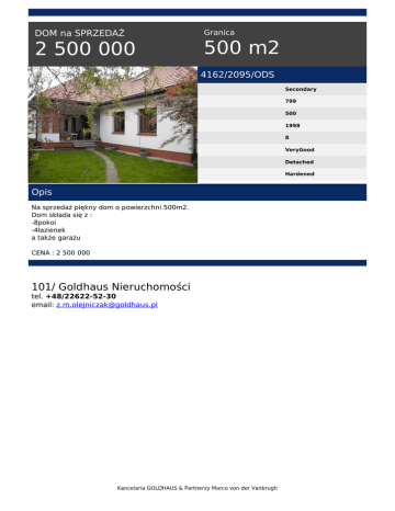 DOM na SPRZEDAŻ 2 500 000 Granica 500 m2 4162/2095/ODS Secondary 799 500 1998 8 VeryGood Detached Hardened Opis Na sprzedaż piękny dom o powierzchni 500m2. Dom składa się z : -8pokoi -4łazienek a także garażu CENA : 2 500 000 101/ Goldhaus Nieruchomości tel. +48/22622-52-30 email: [email protected] Kancelaria GOLDHAUS & Partnerzy Marco von der Vanbrugh Powered by TCPDF (www.tcpdf.org)