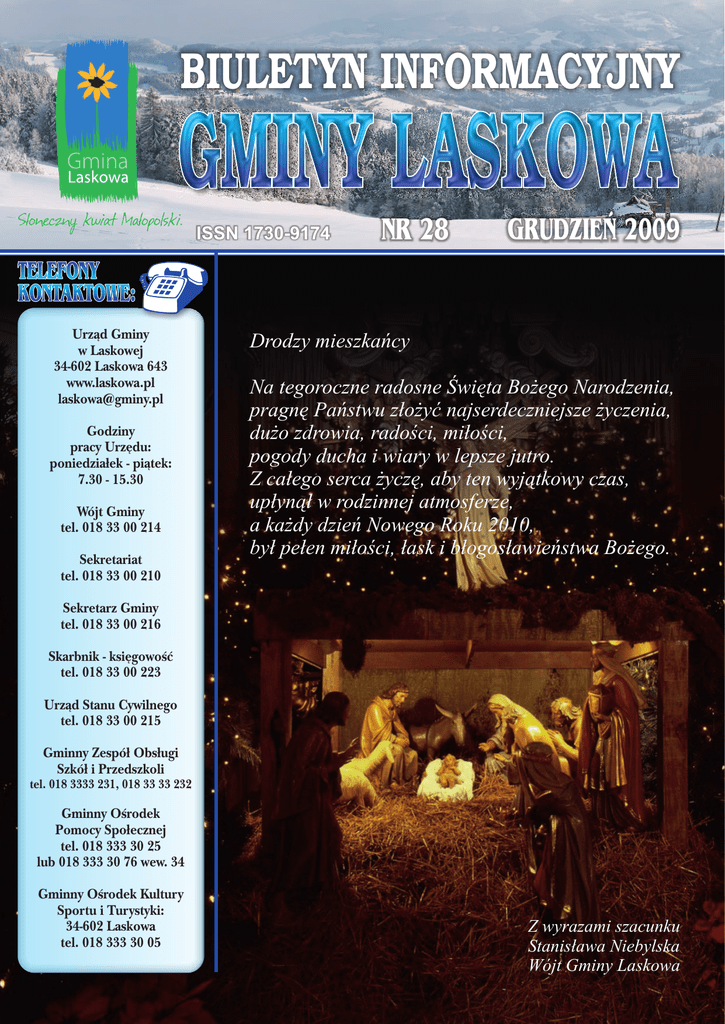 BIULETYN INFORMACYJNY ISSN 1730-9174 Urząd Gminy w Laskowej 34-602 Laskowa 643 www.laskowa.pl [email protected] Godziny pracy Urzędu: poniedziałek - piątek: 7.30 - 15.30 Wójt Gminy tel. 018 33 00 214 Sekretariat tel. 018 33 00 210 NR 28 GRUDZIEŃ 2009 Drodzy mieszkańcy Na tegoroczne radosne Święta Bożego Narodzenia, pragnę Państwu złożyć najserdeczniejsze życzenia, dużo zdrowia, radości, miłości, pogody ducha i wiary w lepsze jutro. Z całego serca życzę, aby ten wyjątkowy czas, upłynął w rodzinnej atmosferze, a każdy dzień Nowego Roku 2010, był pełen miłości, łask i błogosławieństwa Bożego. Sekretarz Gminy tel. 018 33 00 216 Skarbnik - księgowość tel. 018 33 00 223 Urząd Stanu Cywilnego tel. 018 33 00 215 Gminny Zespół Obsługi Szkół i Przedszkoli tel. 018 3333 231, 018 33 33 232 Gminny Ośrodek Pomocy Społecznej tel. 018 333 30 25 lub 018 333 30 76 wew. 34 Gminny Ośrodek Kultury Sportu i Turystyki: 34-602 Laskowa tel. 018 333 30 05 Z wyrazami szacunku Stanisława Niebylska Wójt Gminy Laskowa Z okazji Świąt Bożego Narodzenia i Nowego 2010 Roku Złote Gody w Gminie Laskowa chciałbym Państwu złożyć w imieniu Radnych Rady Gminy Laskowa najserdeczniejsze życzenia zdrowia, szczęścia, wszelkiej pomyślności w życiu osobistym oraz sukcesów w pracy zawodowej. Piotr Stach Przewodniczący Rady Gminy Laskowa CZAS NA AKTYWNOŚĆ W GMINIE LASKOWA Gminny Ośrodek Pomocy Społecznej w Laskowej informuje, iż od stycznia 2010 roku realizowany będzie kolejny projekt „Czas na aktywność w Gminie Laskowa” w ramach Programu Operacyjnego Kapitał Ludzki. Program ten realizowany jest ze środków Europejskiego Funduszu Społecznego w latach 2007 – 2013 r. Celem Projektu są działania pomocowe zmierzające do podniesienia kompetencji życiowych i umiejętności społeczno-zawodowych kobiet i mężczyzn oraz ich rodzin zagrożonych wykluczeniem społecznym. Projekt ten jest przeznaczony dla kobiet i mężczyzn: bezrobotnych, nieaktywnych zawodowo, zatrudnionych (w tym rolników) w wieku aktywności zawodowej, korzystających z pomocy tut. Ośrodka. Osoby zainteresowane mogą uzyskać szczegółowe informacje w tut. Ośrodku lub pod nr telefonu (018) 33 33 025. Halina Potoniec Kierownik GOPS Laskowa Zimowe utrzymanie dróg Drogi lokalne - gminne: -”Kamionka Mała – Rozdziele” - 4,3 km -”Laskowa – Rozdziele” (Lipniczka) - 2,2 km -”Jaworzna – Mordarka” - 4,0 km -”Krosna – Strzeszyce- Żmiąca – 6,4 km -”Laskowa – Rozpite”- 3,0 km Usługi w zakresie zimowego utrzymania dróg świadczone są w okresie od 1 listopada 2010 roku do 31 marca 2010 roku. Wykonawcą zadania jest Pan Józef Hołyst z Krosnej. Nr tel.: 0-18 33 34 561 Drogi powiatowe: Wykonawcą zimowego utrzymania dróg powiatowych na terenie Gminy Laskowa jest Pan Józef Kęska. Wszelkie uwagi i spostrzeżenia prosimy kierować na podane poniżej dyżurne numery telefonów: Powiatowy Zarząd Dróg ul. J. Marka 9 tel.018 33 378 33 --( 7:30 - 15:30) Dyżurny ZUD baza PZD ul.Żwirki i Wigury 018 33 72 381 całodobowo 0606 98 25 64 całodobowo Drogi o których mowa powyżej to: 1. 1555 K Ujanowice - Młynne 2. 1612 K Laskowa - Nagórze 3. 1451 K Sechna - Ujanowice Z chwilą nastania warunków zimowych dyżury pełnione będą całodobowo. 2 BIULETYN GMINY LASKOWA W dniu 21 października 2009 roku w budynku Gminnego Ośrodka Kultury Sportu i Turystyki w Laskowej, odbyła się uroczystość wręczenia medali małżonkom, którzy przeżyli wspólnie 50 lat. Medale „Za Długoletnie Pożycie Małżeńskie” w imieniu Prezydenta RP wręczyła Pani Stanisława Niebylska Wójt Gminy Laskowa. Gratulacje od Władz Samorządowych przekazali Przewodniczący Rady Gminy Laskowa Piotr Stach, Radna Rady Gminy Laskowa Ewa Pajor oraz z-ca Kierownika USC Henryk Tokarz. Podczas uroczystości koncertowała Kapela „Laskowioki” Jubilaci 2009 roku: 1. Augustyn Katarzyna i Czesław - Jaworzna 2. Augustyn Maria i Józef - Jaworzna 3. Bobowscy Kazimiera i Jan - Laskowa 4. Chełmeccy Genowefa i Jan - Laskowa 5. Dudek Maria i Stefan - Laskowa 6. Filipek Bronisława i Józef - Jaworzna 7. Filipek Zofia i Władysław - Kamionka Mała 8. Gołąb Maria i Jan - Żmiąca 9. Joniec Ludwika i Piotr - Sechna 10. Joniec Józefa i Stefan - Strzeszyce 11. Jonik Kazimiera i Józef - Sechna 12. Kasińscy Zofia i Augustyn - Laskowa 13. Olszewscy Zofia i Jan - Kamionka Mała 14. Opioła Anna i Józef - Laskowa 15. Orzeł Dominika i Józef - Krosna 16. Orzeł Kazimiera i Józef - Kamionka Mała 17. Pachowicz Joanna i Wojciech - Laskowa 18. Piórkowscy Maria i Michał - Laskowa 19. Pławeccy Irena i Józef - Laskowa 20. Pławeccy Janina i Józef - Laskowa 21. Rosiek Aniela i Julian - Laskowa 22. Sądel Stefania i Stanisław - Laskowa 23. Sławęta Maria i Michał - Laskowa 24. Smoter Stanisława i Władysław - Laskowa 25. Stanisławczyk Bronisława i Józef - Laskowa 26. Uryga Stanisława i Stanisław - Ujanowice 27. Wątroba Ludwika i Władysław - Laskowa 28. Wróbel Maria i Stefan - Laskowa 29. Zelek Małgorzata - Jaworzna 30. Zelek Maria i Bronisław - Sechna 31. Zelek Helena i Jan - Kamionka Mała Henryk Tokarz z-ca Kierownika USC Inwestycje drogowe zakończone w okresie wrzesień – grudzień 2009r. W dniu 10 listopada 2009 roku dokonano końcowego odbioru i przekazano do użytku zadanie pn.: „Odbudowa infrastruktury drogowej na terenie gminy Laskowa w ramach usuwania skutków klęsk żywiołowych”. Przedmiotem zadania była odbudowa następujących dróg: 1. "Bania" w m. Laskowa odcinek dł. 550 mb, Wartość robót: 127 970,68 zł - dotacja celowa z budżetu państwa: 90 000,00 zł - środki własne: 37 970,68 zł 2. "Rozpite - Dzioł" w m. Laskowa - odcinek dł. 530 mb Wartość robót: 159 211,83 zł - dotacja celowa z budżetu państwa: 110 000,00 zł - środki własne: 49 211,83 zł Ogółem poniesione nakłady: 428 658,34 zł brutto, w tym: - dotacja celowa z budżetu państwa: 300 