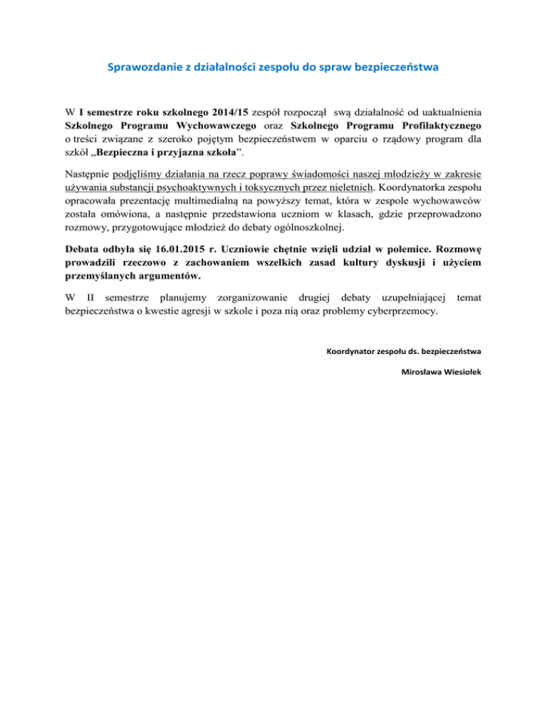 Sprawozdanie z działalności zespołu do spraw bezpieczeństwa W I semestrze roku szkolnego 2014/15 zespół rozpoczął swą działalność od uaktualnienia Szkolnego Programu Wychowawczego oraz Szkolnego Programu Profilaktycznego o treści związane z szeroko pojętym bezpieczeństwem w oparciu o rządowy program dla szkół „Bezpieczna i przyjazna szkoła”. Następnie podjęliśmy działania na rzecz poprawy świadomości naszej młodzieży w zakresie używania substancji psychoaktywnych i toksycznych przez nieletnich. Koordynatorka zespołu opracowała prezentację multimedialną na powyższy temat, która w zespole wychowawców została omówiona, a następnie przedstawiona uczniom w klasach, gdzie przeprowadzono rozmowy, przygotowujące młodzież do debaty ogólnoszkolnej. Debata odbyła się 16.01.2015 r. Uczniowie chętnie wzięli udział w polemice. Rozmowę prowadzili rzeczowo z zachowaniem wszelkich zasad kultury dyskusji i użyciem przemyślanych argumentów. W II semestrze planujemy zorganizowanie drugiej debaty uzupełniającej bezpieczeństwa o kwestie agresji w szkole i poza nią oraz problemy cyberprzemocy. temat Koordynator zespołu ds. bezpieczeństwa Mirosława Wiesiołek