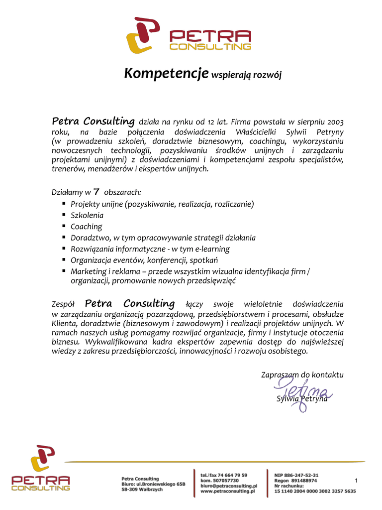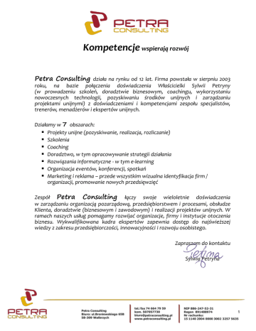 Kompetencje wspierają rozwój Petra Consulting działa na rynku od 12 lat. Firma powstała w sierpniu 2003 roku, na bazie połączenia doświadczenia Właścicielki Sylwii Petryny (w prowadzeniu szkoleń, doradztwie biznesowym, coachingu, wykorzystaniu nowoczesnych technologii, pozyskiwaniu środków unijnych i zarządzaniu projektami unijnymi) z doświadczeniami i kompetencjami zespołu specjalistów, trenerów, menadżerów i ekspertów unijnych. Działamy w 7 obszarach: Projekty unijne (pozyskiwanie, realizacja, rozliczanie) Szkolenia Coaching Doradztwo, w tym opracowywanie strategii działania Rozwiązania informatyczne - w tym e-learning Organizacja eventów, konferencji, spotkań Marketing i reklama – przede wszystkim wizualna identyfikacja firm / organizacji, promowanie nowych przedsięwzięć Zespół Petra Consulting łączy swoje wieloletnie doświadczenia w zarządzaniu organizacją pozarządową, przedsiębiorstwem i procesami, obsłudze Klienta, doradztwie (biznesowym i zawodowym) i realizacji projektów unijnych. W ramach naszych usług pomagamy rozwijać organizacje, firmy i instytucje otoczenia biznesu. Wykwalifikowana kadra ekspertów zapewnia dostęp do najświeższej wiedzy z zakresu przedsiębiorczości, innowacyjności i rozwoju osobistego. Zapraszam do kontaktu Sylwia Petryna 1 Kompetencje wspierają rozwój Usługa asysty rozwojowej organizacji pozarządowej jest usługą doradczą i/lub coachingową świadczoną w celu wsparcia procesu rozwoju. Co zyskuje organizacja? Korzyść I Analiza potrzeb i możliwości organizacji W ramach usługi każdorazowo analizujemy potrzeby i możliwości organizacji w obszarze rozwoju – wiedzieć co i jak to podstawa dalszego działania. Korzyść II Wysoki komfort pracy Angażując wyspecjalizowaną firmę, angażuje się zespół. Każdy członek zespołu wnosi nowe pomysły i rozwiązania. Każde działania silnie wiążemy z możliwością finansowania ich ze źródeł zewnętrznych. Wspieramy w rozwoju instytucjonalnym, jak i interpersonalnym. Korzyść III Bezpieczeństwo Nasze doświadczenie i kompetencje są potwierdzone wieloma referencjami. Łączenie różnych specjalizacji daje całościowy pogląd na organizację – w ten sposób optymalizujemy swoje działania. Korzyść IV Oszczędność Omijają cię dodatkowe koszty – urlopów, chorobowego, absencji w pracy. Dodatkowo przy korzystaniu z abonamentu masz stały dostęp do informacji i gotowy efekt, który zamówisz. W tym przypadku oszczędzasz czas… 2 Kompetencje wspierają rozwój Usługa asysty rozwojowej – abonament miesięczny Rodzaj abonamentu (netto) 400 zł / miesiąc Zakres wsparcia W ramach godzin doradczych w abonamencie oferujemy usługi: • Analiza potrzeb i możliwości organizacji • Stały monit w obszarze dostępnych funduszy unijnych • Wsparcie w obszarze przygotowania organizacji do realizacji projektów: przegląd / stworzenie procedur realizacji projektów, analiza zasobów, optymalizacja działań • Doradztwo biznesowe (np. w obszarze organizacyjnym, zarządzania, rozliczeń) • Doradztwo marketingowe m.in. w obszarze • pozyskiwania sponsorów / donatorów • wykorzystania internetu i mediów społecznościowych • dopasowywania kampanii marketingowej do potrzeb organizacji • Pomoc w opracowaniu koncepcji projektu (który będzie finansowany ze środków UE lub innych źródeł) • Kojarzenie partnerów projektowych • Możliwość transformacji usługi doradczej na coachingową Ilość godzin doradczych miesięcznie w ramach abonamentu do wykorzystania: 6 godzin (można kumulować godziny, do wykorzystania w następnych miesiącach, jednakże odpłatność jest stała każdego miesiąca). 850 zł / miesiąc W ramach godzin doradczych w abonamencie oferujemy usługi: • Zawiera wszystkie elementy pakietu pierwszego • Realizacji drobnych usług graficznych (np. opracowanie logo, ulotki, plakatu, bannera) • Pomoc w opracowaniu koncepcji projektu oraz napisanie wniosku (który będzie finansowany ze środków UE lub innych źródeł) – max. liczba wniosków w ciągu roku: 4 Ilość godzin doradczych miesięcznie w ramach abonamentu do wykorzystania: 11 godzin (można kumulować godziny, do wykorzystania w następnych miesiącach, jednakże odpłatność jest stała każdego miesiąca). UWAGA: minimalny czas trwania umowy 7 miesięcy. 3 Kompetencje wspierają rozwój Usługa asysty rozwojowej – abonament miesięczny Rodzaj abonamentu 1450 zł / miesiąc Zakres wsparcia W ramach godzin doradczych w abonamencie oferujemy usługi: • Zawiera wszystkie elementy pakietu pierwszego • Realizacji drobnych usług graficznych (np. opracowanie logo, ulotki, plakatu, bannera) oraz pomoc w prowadzeniu FANPAGE organizacji (strona na facebooku promująca organizację) • Pomoc w opracowaniu koncepcji projektu oraz napisanie wniosku (który będzie finansowany ze środków UE lub innych źródeł) – max. liczba wniosków w ciągu roku: 7 • Doradztwo w obszarze prowadzenia i rozliczania projektu, w tym obszar monitoringu, ewaluacji, sprawozdawczości – do wyczerpania limitu godzin doradczych Ilość godzin doradczych miesięcznie w ramach abonamentu do wykorzystania: 20 godzin (można kumulować godziny, do wykorzystania w następnych miesiącach, jednakże odpłatność jest stała każdego miesiąca). UWAGA: minimalny czas trwania umowy 12 miesięcy. 4 Kompetencje wspierają rozwój DLACZEGO WARTO Z NAMI WSPÓŁPRACOWAĆ? DZIAŁAMY KOMPLEKSOWO • Analizujemy możliwość otrzymania dotacji i piszemy wnioski o dofinansowanie na programy rozwojowe dla pracowników i projekty inwestycyjne Diagnozujemy Państwa potrzeby i realizujemy projekty na poziomach: • Realizujemy projekty kompleksowo, co pozwala nam na połączenie indywidualnego podejścia do kwestii finansowych z usługami wysokiej jakości • Poza tym, robimy to, co lubimy. Bo naszą pasją jest odkrywanie potencjału i wspieranie w rozwoju… Doradztwo, Coac