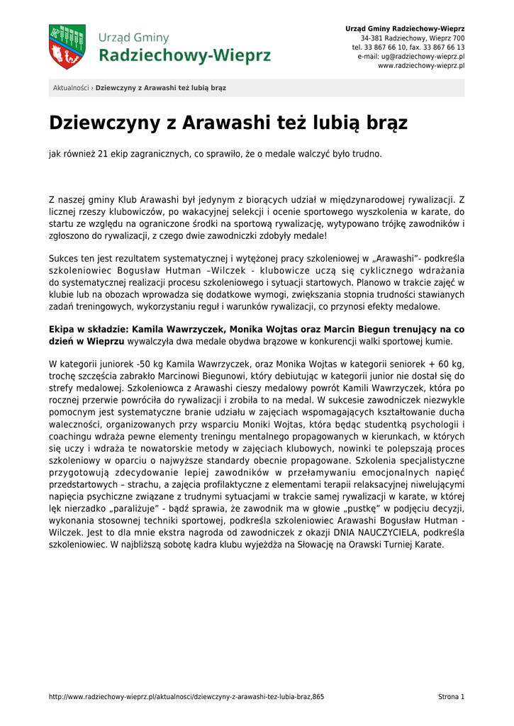 Urząd Gminy Radziechowy-Wieprz 34-381 Radziechowy, Wieprz 700 tel. 33 867 66 10, fax. 33 867 66 13 e-mail: [email protected] www.radziechowy-wieprz.pl Aktualności › Dziewczyny z Arawashi też lubią brąz Dziewczyny z Arawashi też lubią brąz jak również 21 ekip zagranicznych, co sprawiło, że o medale walczyć było trudno. Z naszej gminy Klub Arawashi był jedynym z biorących udział w międzynarodowej rywalizacji. Z licznej rzeszy klubowiczów, po wakacyjnej selekcji i ocenie sportowego wyszkolenia w karate, do startu ze względu na ograniczone środki na sportową rywalizację, wytypowano trójkę zawodników i zgłoszono do rywalizacji, z czego dwie zawodniczki zdobyły medale! Sukces ten jest rezultatem systematycznej i wytężonej pracy szkoleniowej w „Arawashi”- podkreśla szkoleniowiec Bogusław Hutman –Wilczek - klubowicze uczą się cyklicznego wdrażania do systematycznej realizacji procesu szkoleniowego i sytuacji startowych. Planowo w trakcie zajęć w klubie lub na obozach wprowadza się dodatkowe wymogi, zwiększania stopnia trudności stawianych zadań treningowych, wykorzystaniu reguł i warunków rywalizacji, co przynosi efekty medalowe. Ekipa w składzie: Kamila Wawrzyczek, Monika Wojtas oraz Marcin Biegun trenujący na co dzień w Wieprzu wywalczyła dwa medale obydwa brązowe w konkurencji walki sportowej kumie. W kategorii juniorek -50 kg Kamila Wawrzyczek, oraz Monika Wojtas w kategorii seniorek + 60 kg, trochę szczęścia zabrakło Marcinowi Biegunowi, który debiutując w kategorii junior nie dostał się do strefy medalowej. Szkoleniowca z Arawashi cieszy medalowy powrót Kamili Wawrzyczek, która po rocznej przerwie powróciła do rywalizacji i zrobiła to na medal. W sukcesie zawodniczek niezwykle pomocnym jest systematyczne branie udziału w zajęciach wspomagających kształtowanie ducha waleczności, organizowanych przy wsparciu Moniki Wojtas, która będąc studentką psychologii i coachingu wdraża pewne elementy treningu mentalnego propagowanych w kierunkach, w których się uczy i wdraża te nowatorskie metody w zajęciach klubowych, nowinki te polepszają proces szkoleniowy w oparciu o najwyższe standardy obecnie propagowane. Szkolenia specjalistyczne przygotowują zdecydowanie lepiej zawodników w przełamywaniu emocjonalnych napięć przedstartowych – strachu, a zajęcia profilaktyczne z elementami terapii relaksacyjnej niwelującymi napięcia psychiczne związane z trudnymi sytuacjami w trakcie samej rywalizacji w karate, w której lęk nierzadko „paraliżuje” - bądź sprawia, że zawodnik ma w głowie „pustkę” w podjęciu decyzji, wykonania stosownej techniki sportowej, podkreśla szkoleniowiec Arawashi Bogusław Hutman Wilczek. Jest to dla mnie ekstra nagroda od zawodniczek z okazji DNIA NAUCZYCIELA, podkreśla szkoleniowiec. W najbliższą sobotę kadra klubu wyjeżdża na Słowację na Orawski Turniej Karate. http://www.radziechowy-wieprz.pl/aktualnosci/dziewczyny-z-arawashi-tez-lubia-braz,865 Strona 1
