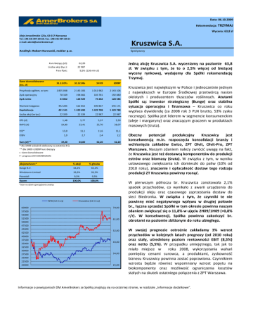 Data: 06.10.2009 Rekomendacja: TRZYMAJ Wycena: 63,8 zł Aleje Jerozolimskie 123a, 02-017 Warszawa Tel.: (48-22) 397-60-60, Fax.: (48-22) 397-60-61 e-mail: [email protected] Kruszwica S.A. Analityk: Robert Kurowski, makler p.w. Kurs bieżący (zł): Liczba akcji (tys.): Free float: Spożywczy Jedną akcję Kruszwica S.A. wyceniamy na poziomie 63,8 zł. W związku z tym, że to o 2,5% więcej od bieżącej wyceny rynkowej, wydajemy dla Spółki rekomendację Trzymaj. 62,20 22 987 9,5% (136 mln zł) Dane skonsolidowane (tys. zł) 31.12.07s 31.12.08s 1H 09 2009P Przychody ogółem, w tym: 1 855 048 2 143 106 1 011 982 2 143 106 Zysk operacyjny 78 169 198 666 103 781 192 880 Zysk netto 33 062 128 929 74 282 128 586 Wartość księgowa 442 205 522 852 590 867 645 171 Kapitalizacja 431 141 1 429 690 1 429 788 1 429 788 22 339 22 339 22 987 22 987 Liczba akcji (w tys.) EPS (zł) 1,48 5,77 5,37 5,59 19,80 23,41 25,70 28,07 P/E* 13,0 11,1 11,6 11,1 P/BV 1,0 2,7 2,4 2,2 19,30 64,00 62,20 62,20 BVPS (zł) Kurs (zł)** * dla 1H09 wskaźnik obliczony za ostatnie 4 Q ** dla 1H09 i 2009P kurs bieżący s - dane skonsolidowane P - prognoza DM AMERBROKERS Akcjonariusze:* % akcji Bunge B.V. 64,2% 64,2% Windstorm Limited 26,2% 26,2% Pozostali Razem % głosów 9,5% 9,5% 100,0% 100,0% *Stan na dzień sporządzenia analizy WIG (12 m-cy) 60000 57500 55000 52500 50000 47500 45000 42500 40000 37500 35000 32500 30000 27500 25000 22500 20000 Kruszwica (12 m-cy) 70,00 61,00 52,00 43,00 34,00 25,00 Kruszwica jest największym w Polsce i jednocześnie jednym z największych w Europie Środkowej przetwórcą nasion oleistych i producentem tłuszczów roślinnych. Atutami Spółki są: inwestor strategiczny (Bunge) oraz stabilna sytuacja operacyjna i finansowa – Kruszwica co roku wypłaca dywidendę (za 2008 rok 3 PLN brutto, 53% zysku rocznego). Spółka jest liderem w segmencie konsumenckim (oleje i margaryny) oraz znaczącym graczem w produktach masowych (śruta). Obecny potencjał produkcyjny Kruszwicy jest konsekwencją m.in. rozpoczęcia konsolidacji branży i wchłonięcia zakładów Ewico, ZPT Olvit, Olvit-Pro, ZPT Warszawa. Naszym zdaniem należy zwrócić uwagę na fakt, że Kruszwica jest też dostawcą komponentów do produkcji estrów oraz biomasy (śruta). W związku z tym, w wyniku ustawowego zwiększania ich domieszki do paliw (10% od 2010 roku), znaczenie i opłacalność dostaw tego rodzaju produkcji ZT Kruszwica powinny rosnąć. W pierwszym półroczu br. Kruszwica zanotowała 2,1% spadek przychodów, co wynikało z awarii urządzenia do produkcji oleju oraz czasowego zaprzestania dostaw do sieci Biedronka. W związku z tym, że czynniki te nie powinny mieć negatywnego wpływu w drugiej połowie br., łączna sprzedaż Spółki w tym okresie powinna naszym zdaniem zwiększyć się o 11,8% w ujęciu 2H09/1H09 (+0,8% r/r). W konsekwencji, Spółka powinna zakończyć br. obrotami na poziomie zbliżonym do roku ubiegłego. W swojej prognozie ostrożnie zakładamy 3% wzrost przychodów w kolejnych latach prognozy (od 2010 roku) oraz stały, uśredniony poziom rentowności EBIT (8,5%) oraz netto (5,5%). W przypadku umiejętnego, tak jak to miało miejsce w roku 2008, wykorzystania wahań pomiędzy cenami surowca, a produktami, zyskowność biznesu Kruszwicy powinna zostać poprawiona. Czynnikiem wzrostu będzie również wspomniany wzrost popytu na biokomponenty oraz możliwość ograniczenia kosztów stałych na skutek ostatniego połączenia z ZPT Warszawa. Informacje o powiązaniach DM AmerBrokers ze Spółką znajdują się na ostatniej stronie, w rozdziale „Informacje dodatkowe”. Branża Ocenę sytuacji w branży opieramy na danych dotyczących zmian wielkości produkcji oraz popytu na główny surowiec używany przez Spółkę, tj. rzepak. Analizowanym obszarem jest także rynek tłuszczów roślinnych, które obok śruty rzepakowej są najważniejszymi co do znaczenia produktami w ofercie Zakładów Tłuszczowych Kruszwica. Rzepak – produkcja W ostatnich latach rzepak stał się najważniejszą rośliną w grupie roślin o zastosowaniu przemysłowym i ma na świecie ponad 3/4 udział w strukturze produkcji z nasion. W ciągu ostatnich 50 lat produkcja rzepaku na świecie wzrosła ponad 14-krotnie (z 3,6 mln ton na początku lat 60-ych do ponad 56 mln ton w sezonie 2008/2009). W Polsce, mimo zmniejszenia powierzchni zasiewów w latach poprzednich (areał obniżył się o 3% r/r) oraz przy niesprzyjającej pogodzie, sezon 2008/2009 był korzystny dla producentów. Według szacunków Krajowego Zrzeszenia Producentów Rzepaku, zbiory przekroczyły 2,2 mln ton (+2% r/r), co w dużej mierze wynikało ze wzrostu plonów rzepaku (wydajność z ha wzrosła o 5%). Według danych Instytutu Ekonomiki Rolnictwa i Gospodarki Żywnościowej (IERiGŻ), Polska ma dodatni bilans śruty rzepakowej, co oznacza, że krajowa produkcja z nadwyżką pokrywa zapotrzebowanie odbiorców – rynku. Rzepak – ceny Podstawowym czynnikiem mającym wpływ na kondycję podmiotów (producenci, odbiorcy - zakłady tłuszczowe) funkcjonujących w branży uznać należy relacje cen surowców, tj. głównie nasion rzepaku, w stosunku do cen produktów. Od 2006 roku nastąpił wyraźny wzrost cen rzepaku, zarówno w ujęciu globalnym jak i w kraju. Sytuacja ta spowodowana była rosnącym popytem, jak i prognozami zużycia tego surowca, także ze względu na rozwój produkcji estrów do biodesla. Tendencja wzrostu cen surowca utrzymała się w roku 2007 i 2008. Zwyżka cen surowca do produkcji, jakim jest rzepak była podobna w charakterze do przebiegu notowań innych surowców rolnych, gdzie z czasem doszło do spekulacji. Na koniec ubr. cena skupu rzepaku w Polsce wzrosła o +20%, tj. do 1268 zł/tonę. W pierwszym półroczu br., podobnie jak w przypadku innych surowców, nastąpił spadek cen (-20% od stycznia do lipca br.), natomiast cena rzepaku w portach europejskich była o ponad 40% niższa niż przed rokiem. IERiGŻ p