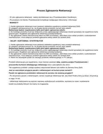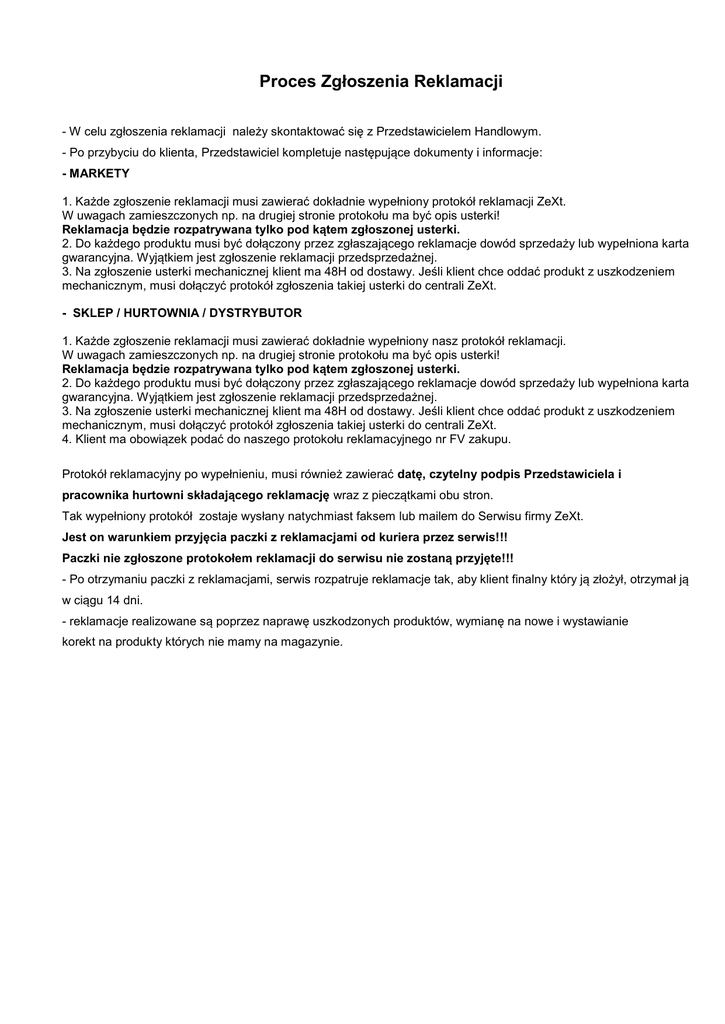 Proces Zgłoszenia Reklamacji - W celu zgłoszenia reklamacji należy skontaktować się z Przedstawicielem Handlowym. - Po przybyciu do klienta, Przedstawiciel kompletuje następujące dokumenty i informacje: - MARKETY 1. Każde zgłoszenie reklamacji musi zawierać dokładnie wypełniony protokół reklamacji ZeXt. W uwagach zamieszczonych np. na drugiej stronie protokołu ma być opis usterki! Reklamacja będzie rozpatrywana tylko pod kątem zgłoszonej usterki. 2. Do każdego produktu musi być dołączony przez zgłaszającego reklamacje dowód sprzedaży lub wypełniona karta gwarancyjna. Wyjątkiem jest zgłoszenie reklamacji przedsprzedażnej. 3. Na zgłoszenie usterki mechanicznej klient ma 48H od dostawy. Jeśli klient chce oddać produkt z uszkodzeniem mechanicznym, musi dołączyć protokół zgłoszenia takiej usterki do centrali ZeXt. - SKLEP / HURTOWNIA / DYSTRYBUTOR 1. Każde zgłoszenie reklamacji musi zawierać dokładnie wypełniony nasz protokół reklamacji. W uwagach zamieszczonych np. na drugiej stronie protokołu ma być opis usterki! Reklamacja będzie rozpatrywana tylko pod kątem zgłoszonej usterki. 2. Do każdego produktu musi być dołączony przez zgłaszającego reklamacje dowód sprzedaży lub wypełniona karta gwarancyjna. Wyjątkiem jest zgłoszenie reklamacji przedsprzedażnej. 3. Na zgłoszenie usterki mechanicznej klient ma 48H od dostawy. Jeśli klient chce oddać produkt z uszkodzeniem mechanicznym, musi dołączyć protokół zgłoszenia takiej usterki do centrali ZeXt. 4. Klient ma obowiązek podać do naszego protokołu reklamacyjnego nr FV zakupu. Protokół reklamacyjny po wypełnieniu, musi również zawierać datę, czytelny podpis Przedstawiciela i pracownika hurtowni składającego reklamację wraz z pieczątkami obu stron. Tak wypełniony protokół zostaje wysłany natychmiast faksem lub mailem do Serwisu firmy ZeXt. Jest on warunkiem przyjęcia paczki z reklamacjami od kuriera przez serwis!!! Paczki nie zgłoszone protokołem reklamacji do serwisu nie zostaną przyjęte!!! - Po otrzymaniu paczki z reklamacjami, serwis rozpatruje reklamacje tak, aby klient finalny który ją złożył, otrzymał ją w ciągu 14 dni. - reklamacje realizowane są poprzez naprawę uszkodzonych produktów, wymianę na nowe i wystawianie korekt na produkty których nie mamy na magazynie.
