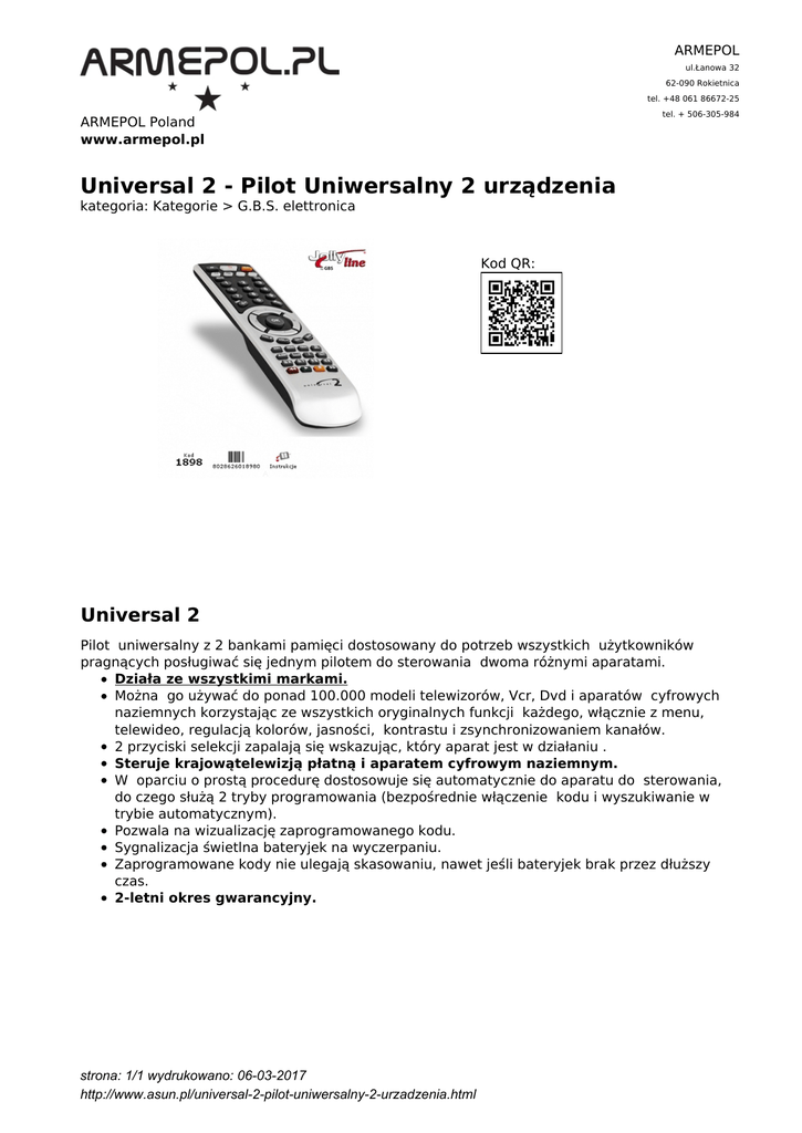 ARMEPOL ul.Łanowa 32 62-090 Rokietnica tel. +48 061 86672-25 tel. + 506-305-984 ARMEPOL Poland www.armepol.pl Universal 2 - Pilot Uniwersalny 2 urządzenia kategoria: Kategorie > G.B.S. elettronica Kod QR: Universal 2 Pilot uniwersalny z 2 bankami pamięci dostosowany do potrzeb wszystkich użytkowników pragnących posługiwać się jednym pilotem do sterowania dwoma różnymi aparatami. Działa ze wszystkimi markami. Można go używać do ponad 100.000 modeli telewizorów, Vcr, Dvd i aparatów cyfrowych naziemnych korzystając ze wszystkich oryginalnych funkcji każdego, włącznie z menu, telewideo, regulacją kolorów, jasności, kontrastu i zsynchronizowaniem kanałów. 2 przyciski selekcji zapalają się wskazując, który aparat jest w działaniu . Steruje krajowątelewizją płatną i aparatem cyfrowym naziemnym. W oparciu o prostą procedurę dostosowuje się automatycznie do aparatu do sterowania, do czego służą 2 tryby programowania (bezpośrednie włączenie kodu i wyszukiwanie w trybie automatycznym). Pozwala na wizualizację zaprogramowanego kodu. Sygnalizacja świetlna bateryjek na wyczerpaniu. Zaprogramowane kody nie ulegają skasowaniu, nawet jeśli bateryjek brak przez dłuższy czas. 2-letni okres gwarancyjny. strona: 1/1 wydrukowano: 06-03-2017 http://www.asun.pl/universal-2-pilot-uniwersalny-2-urzadzenia.html