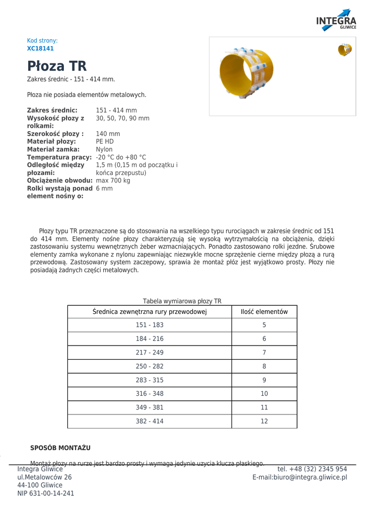 Kod strony: XC18141 Płoza TR Zakres średnic - 151 - 414 mm. Płoza nie posiada elementów metalowych. Zakres średnic: Wysokość płozy z rolkami: Szerokość płozy : Materiał płozy: Materiał zamka: Temperatura pracy: Odległość między płozami: Obciążenie obwodu: Rolki wystają ponad element nośny o: 151 - 414 mm 30, 50, 70, 90 mm 140 mm PE HD Nylon -20 °C do +80 °C 1,5 m (0,15 m od początku i końca przepustu) max 700 kg 6 mm Płozy typu TR przeznaczone są do stosowania na wszelkiego typu rurociągach w zakresie średnic od 151 do 414 mm. Elementy nośne płozy charakteryzują się wysoką wytrzymałością na obciążenia, dzięki zastosowaniu systemu wewnętrznych żeber wzmacniających. Ponadto zastosowano rolki jezdne. Śrubowe elementy zamka wykonane z nylonu zapewniając niezwykle mocne sprzężenie cierne między płozą a rurą przewodową. Zastosowany system zaczepowy, sprawia że montaż płóz jest wyjątkowo prosty. Płozy nie posiadają żadnych części metalowych. Tabela wymiarowa płozy TR Średnica zewnętrzna rury przewodowej Ilość elementów 151 - 183 5 184 - 216 6 217 - 249 7 250 - 282 8 283 - 315 9 316 - 348 10 349 - 381 11 382 - 414 12 SPOSÓB MONTAŻU Montaż płozy na rurze jest bardzo prosty i wymaga jedynie uzycia klucza płaskiego. Integra Gliwice tel. +48 (32) 2345 954 ul.Metalowców 26 E-mail:[email protected] 44-100 Gliwice NIP 631-00-14-241 Po dobraniu odpowiedniej ilości i wysokości płóz http://www.integra.gliwice.pl/plozy.html lub Kalkulator doboru płozy dostępny w lewym menu rozwijalnym należy: ● ● ● ● ● ● połączyć odpowiednią ilość elementów ze sobą za pomocą zatrzasków, nałożyć obwód na rurę przewodową, przełożyć przez otwory skrajnych płóz śruby nylonowe, oraz założyć podkładki i nakrętki, przesunąć obwód na wymagane miejsce, równomierne dokręcić nakrętki powodując zacisnięcie płozy na rurze, po założeniu wymaganej ilości obwodów należy rurę przewodową wsunąć od rury osłonowej. Poprawnie założona płoza gwarantuję długą i bezproblemową pracę. JAK ZAMAWIAĆ Aby poprawnie zamowić płozy wymagane są następujące informacje: Średnica rury przewodowej i osłonowej oraz długość przepustu lub Średnica rury przewodowej i osłonowej oraz ilość obwodów lub Średnica rury przewodowej wysokość elementu oraz ilość obwodów Płozy sprzedawane są w elementach do samodzielnego montażu. Skład produktu (1 obwód) Materiał Rodzaj [szt] Płoza PE HD * Śruba Nylon 2 Nakrętka Nylon 4 Podkładka Nylon 4 * w zależności od średnicy rury przewodowej DOKUMENTY Do produktu dostępne są następujące dokumenty dopuszczające do obrotu ● ● Aprobata techniczna ITB AT 15-6012/2012, Deklaracja zgodności. Produkty uzupełniające MANSZETA TYP "N" Integra Gliwice ul.Metalowców 26 44-100 Gliwice NIP 631-00-14-241 tel. +48 (32) 2345 954 E-mail:[email protected] Bezciśnieniowe zamknięcie przepustu rur przewodowych / osłonowych Integra Gliwice ul.Metalowców 26 44-100 Gliwice NIP 631-00-14-241 tel. +48 (32) 2345 954 E-mail:[email protected]