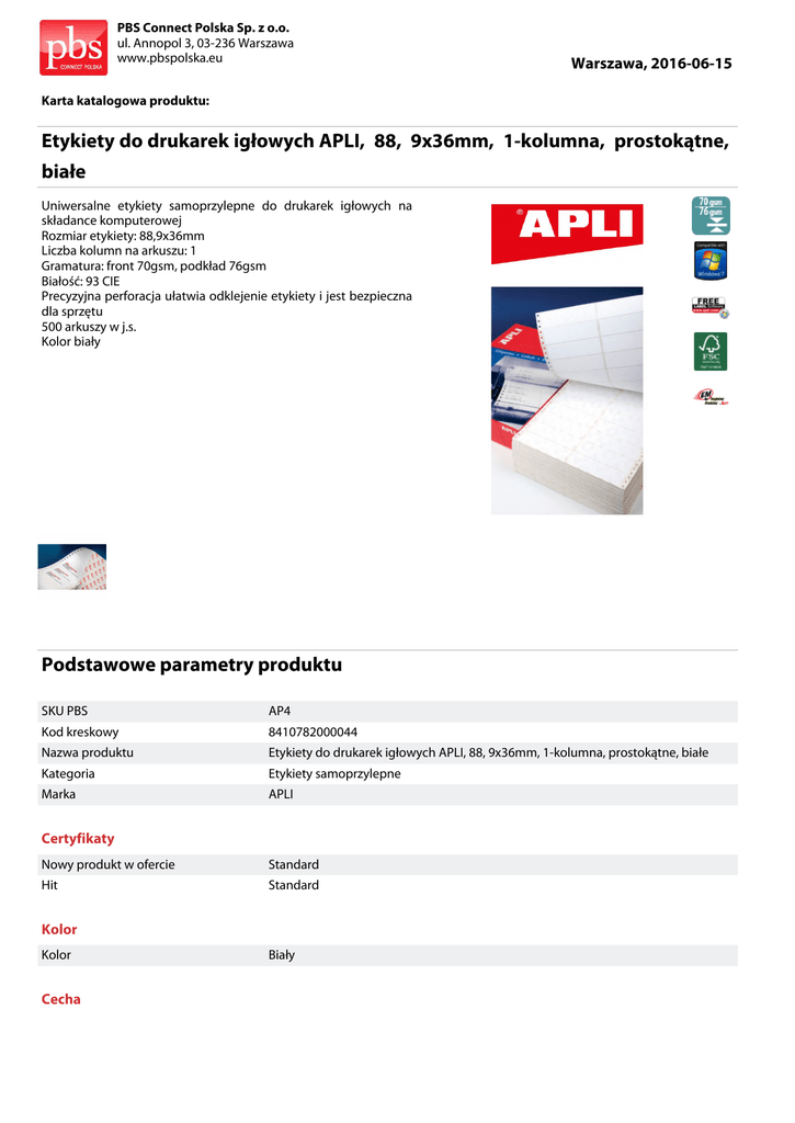 PBS Connect Polska Sp. z o.o. ul. Annopol 3, 03-236 Warszawa www.pbspolska.eu Warszawa, 2016-06-15 Karta katalogowa produktu: Etykiety do drukarek igłowych APLI, 88, 9x36mm, 1-kolumna, prostokątne, białe Uniwersalne etykiety samoprzylepne do drukarek igłowych na składance komputerowej Rozmiar etykiety: 88,9x36mm Liczba kolumn na arkuszu: 1 Gramatura: front 70gsm, podkład 76gsm Białość: 93 CIE Precyzyjna perforacja ułatwia odklejenie etykiety i jest bezpieczna dla sprzętu 500 arkuszy w j.s. Kolor biały Podstawowe parametry produktu SKU PBS AP4 Kod kreskowy 8410782000044 Nazwa produktu Etykiety do drukarek igłowych APLI, 88, 9x36mm, 1-kolumna, prostokątne, białe Kategoria Etykiety samoprzylepne Marka APLI Certyfikaty Nowy produkt w ofercie Standard Hit Standard Kolor Kolor Cecha Biały PBS Connect Polska Sp. z o.o. ul. Annopol 3, 03-236 Warszawa www.pbspolska.eu Warszawa, 2016-06-15 Karta katalogowa produktu cd. Etykiety do drukarek igłowych APLI, 88, 9x36mm, 1-kolumna, prostokątne, białe Podstawowe parametry produktu Ekologiczność B.d. Produkt Etykiety na składance komp. Typ Drukarka igłowa Kształt Prostokątne Materiał Papier W ofercie od 2013-01 Wymiary Gramatura (g/m2) 70/76 Wymiary (mm) 88,9x36 Ilość Ilość arkuszy 500 Ilość etykiet na arkuszu B.d. Wspólny słownik zamówień CPV 30192800-9 Etykiety samoprzylepne Jednostki logistyczne Opakowanie 1 2 op