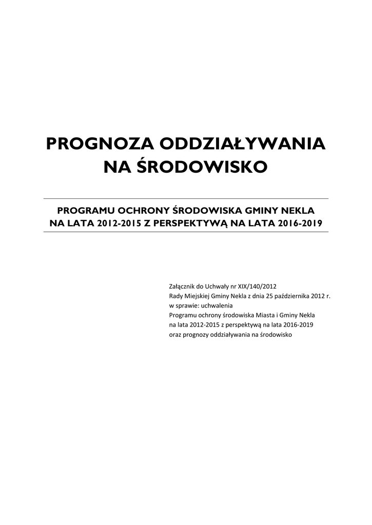 PROGNOZA ODDZIAŁYWANIA NA ŚRODOWISKO PROGRAMU OCHRONY ŚRODOWISKA GMINY NEKLA NA LATA 2012-2015 Z PERSPEKTYWĄ NA LATA 2016-2019 Załącznik do Uchwały nr XIX/140/2012 Rady Miejskiej Gminy Nekla z dnia 25 października 2012 r. w sprawie: uchwalenia Programu ochrony środowiska Miasta i Gminy Nekla na lata 2012-2015 z perspektywą na lata 2016-2019 oraz prognozy oddziaływania na środowisko ł ul. Westerplatte 19/6 62-030 Luboń NIP: 775-234-57-51 REGON: 301484864 Kierownik projektu: Arnold Bernaciak [email protected] Autorzy: Arnold Bernaciak Anna Bernaciak Monika Hejna Współpraca: Elżbieta Narożna-Chromińska, Urząd Miasta i Gminy Nekla Grażyna Sodkiewicz, Urząd Miasta i Gminy Nekla Projekt okładki: Anna Bernaciak Zdjęcie na okładce Anna Bernaciak Nekla, wrzesień 2012 SPIS TREŚCI Wprowadzenie 1. STRONA 5 Cel i zakres prognozy 5 Metody zastosowane przy sporządzaniu prognozy 6 Program ochrony środowiska Gminy Nekla na lata 2012-2015 z perspektywą na lata 2016-2019 – charakterystyka dokumentu 10 1.1. Zawartość i główne cele projektowanego dokumentu 10 1.2. Powiązania programu ochrony środowiska Gminy Nekla na lata 20122015 z perspektywą na lata 2016-2019 z innymi dokumentami 16 1.3. Cele ochrony środowiska ustanowione na szczeblu międzynarodowym, wspólnotowym i krajowym oraz ich wpływ na program ochrony środowiska Gminy Nekla 29 Środowisko Przyrodnicze Gminy Nekla oraz jego potencjalne zmiany w przypadku braku realizacji Programu ochrony środowiska na lata na lata 2012-2015 z perspektywą na lata 2016-2019 41 2.1. Gmina Nekla – położenie, klimat, krajobraz 41 2.2. Geologia i zasoby geologiczne 43 2.3. Gleby i powierzchnia ziemi 44 2.4. Zasoby wodne 45 2.5. Powietrze atmosferyczne 48 2.6. Klimat akustyczny 50 2.7. Żywe zasoby przyrody 52 3. Istniejące problemy ochrony środowiska 56 4. Przewidywane znaczące oddziaływania na cele, przedmiot i integralność obszarów Natura 2000 oraz na pozostałe obszary i obiekty chronione 62 5. Przewidywane znaczące oddziaływania na środowisko 78 5.1. Przewidywane oddziaływania na bioróżnorodność 78 5.2. Wpływ podejmowanych działań na ludzi 79 5.3. Oddziaływanie na zwierzęta 81 5.4. Oddziaływanie na rośliny 82 5.5. Wpływ realizacji programu na wody 83 5.6. Wpływ realizacji programu na powietrze 84 5.7. Spodziewane oddziaływanie na powierzchnię ziemi 85 5.8. Oddziaływanie programu na krajobraz 86 5.9. Oddziaływanie programu na klimat, zasoby naturalne, zabytki i dobra materialne 87 2. 6. Oddziaływania transgraniczne 97 7. Rozwiązania mające na celu zapobieganie, ograniczanie lub kompensację przyrodniczą negatywnych oddziaływań na środowisko 97 8. Rozwiązania alternatywne do rozwiązań zawartych w projektowanym dokumencie 99 9. Metody analizy przewidywanych skutków realizacji programu 99 10. Streszczenie w języku niespecjalistycznym 101 11. Spisy rzeczy 105 Materiały źródłowe 105 Spis tabel 107 Spis rycin 107 PROGNOZA ODDZIAŁYWANIA NA ŚRODOWISKO PROGRAMU OCHRONY ŚRODOWISKA GMINY NEKLA NA LATA 2012-2015 Z PERSPEKTYWĄ NA LATA 2016-2019 WPROWADZENIE CEL I ZAKRES PROGNOZY Przedmiotem prognozy oddziaływania na środowisko jest Program ochrony środowiska Gminy Nekla na lata 2012-2015 z perspektywą na lata 2016-2019, który opracowany został zgodnie z wymaganiami ustawy Prawo ochrony środowiska z dnia 27 kwietnia 2001 r. (tj. Dz. U. z 2008 r. nr 25, poz. 150, ze zm.). Nadrzędnym celem opracowania jest identyfikacja potencjalnych oddziaływań na środowisko będących wynikiem realizacji celów i zadań zawartych w Programie. Cele szczegółowe sprowadzają się do oceny natężenia powyższych oddziaływań, ich rozłożenia w czasie a także określenia czy w dokumencie w odpowiedni sposób zostały uwzględnione interesy środowiska przyrodniczego i kulturowego oraz zasady zrównoważonego rozwoju. Wnioski z powyższych analiz mogą okazać się przydatnym narzędziem w procesie decyzyjnym a także podczas weryfikacji koncepcji dalszego rozwoju Gminy. Zgodnie z zapisami ustawy Prawo ochrony środowisko w Programie ochrony środowiska Gminy Nekla na lata 2012-2015 z perspektywą na lata 2016-2019 określone zostały: priorytety ekologiczne, cele i zadania środowiskowe, harmonogramy realizacji zadań oraz środki niezbędne do osiągnięcia celów. Ponadto dokument zawiera zdefiniowaną politykę środowiskową Gminy Nekla oraz opis stanu docelowego, jaki zamierza się osiągnąć poprzez realizację Programu (wizja). Przedstawiono również system monitoringu i oceny realizacji Programu. Program ochrony środowiska Gminy Nekla na lata 2012-2015 z perspektywą na lata 2016-2019 opracowany został na podstawie diagnozy aktualnego stanu środowiska. Zawarta jest ona przede wszystkim w dokumencie pt. Opracowanie ekofizjograficzne podstawowe na potrzeby zmiany studium uwarunkowań i kierunków zagospodarowania przestrzennego, które przygotowane zostało w Gminie w roku 2010. Dokument ten, opracowany w oparciu o w oparciu o zapisy Rozporządzenia Ministra Środowiska z dnia 9 września 2002 roku w sprawie opracowań ekofizjograficznych oraz ustawy z dnia 27 kwietnia 2001 roku Prawo ochrony środowiska, obejmuje: rozpoznanie, charakterystykę i diagnozę stanu i funkcjonowania środowiska, a także wstępną prognozę zmian w nim zachodzących, ocenę jego przydatności oraz określenie lokalnych uwarunkowań fizjograficznych. Tym samym diagnoza stanu środowiska umieszczona w pierwszej części Programu ochrony środowiska Gminy Nekla na lata 2012-2015 z perspektywą na lata 2016-2019 ma charakter uzupełniający względem powołanego opracowania. W rozdziale zatytułowanym „Środowisko przyrodnicze Gminy Nekla” stan środowiska opisano w następujących blokach tematycznych: Gmina Nekla – położenie, klimat, krajobraz; geologia i zasoby geologiczne; gospodarcze wykorzystanie gleb; zasoby wodne i ochrona wód; gospodarka wodno-ściekowa, ochrona powietrza atmosferycznego