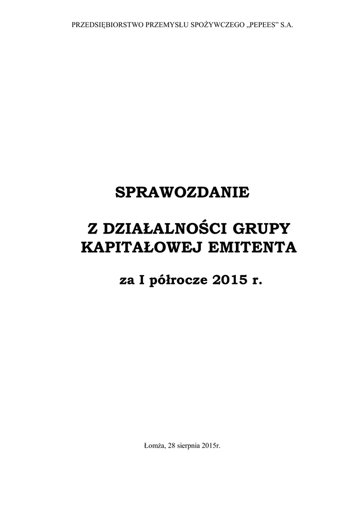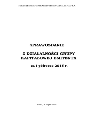 PRZEDSIĘBIORSTWO PRZEMYSŁU SPOŻYWCZEGO „PEPEES” S.A. SPRAWOZDANIE Z DZIAŁALNOŚCI GRUPY KAPITAŁOWEJ EMITENTA za I półrocze 2015 r. Łomża, 28 sierpnia 2015r. Grupa Kapitałowa „PEPEES” S.A. Sprawozdanie Zarządu z działalności Grupy Kapitałowej I półrocze 2015 SPIS TREŚCI I. STRUKTURA GRUPY KAPITAŁOWEJ PEPEES ................................................................................5 1. Przedsiębiorstwo Przemysłu Spożywczego „PEPEES” Spółka Akcyjna w Łomży – jednostka dominująca.....................5 2. Zakłady Przemysłu Ziemniaczanego „LUBLIN” Spółka z ograniczoną odpowiedzialnością w Lublinie – jednostka zależna..................................................................................................................................................................................7 3. OZEnergy Spółka z ograniczoną odpowiedzialnością w Łomży – jednostka zależna......................................................8 4. Przedsiębiorstwo Przemysłu Ziemniaczanego BRONISŁAW Spółka z ograniczoną odpowiedzialnością w Bronisławie – jednostka zależna...................................................................................................................................................................8 5. Zmiany w organizacji Grupy Kapitałowej PEPEES ......................................................................................................9 II. CZYNNIKI I ZDARZENIA WPŁYWAJĄCE NA DZIAŁALNOŚĆ GRUPY KAPITAŁOWEJ ........9 1. Charakterystyka rynku działalności..............................................................................................................................9 2. Informacje o podstawowych produktach, towarach i usługach, będących przedmiotem sprzedaży w Grupie .................10 3. Wielkość i struktura sprzedaży...................................................................................................................................10 4. Informacje o krajowych i zagranicznych rynkach zbytu ..............................................................................................11 5. Informacje o źródłach zaopatrzenia w materiały do produkcji, towary i usługi .............................................................12 6. Informacje o umowach znaczących dla działalności gospodarczej Grupy Kapitałowej .................................................12 7. Informacje o powiązaniach organizacyjnych lub kapitałowych Emitenta z innymi podmiotami oraz określenie jego głównych inwestycji krajowych i zagranicznych...................................................................................................................14 8. Opis transakcji z podmiotami powiązanymi................................................................................................................14 9. Informacje o zaciągniętych kredytach.........................................................................................................................15 10. Informacje o udzielonych pożyczkach, gwarancjach i poręczeniach ............................................................................15 11. Opis wykorzystania wpływów z emisji akcji...............................................................................................................16 12. Objaśnienie różnic pomiędzy wynikami finansowymi wykazanymi w raporcie, a wcześniej publikowanymi prognozami wyników za dany rok...........................................................................................................................................................16 13. Ocena zarządzania zasobami finansowymi .................................................................................................................16 14. Informacja o instrumentach finansowych w zakresie ryzyka oraz celach i metodach zarządzania ryzykiem finansowym 16 15. Informacja o zrealizowanych inwestycjach oraz zamierzenia inwestycyjne.................................................................17 2 Grupa Kapitałowa „PEPEES” S.A. Sprawozdanie Zarządu z działalności Grupy Kapitałowej I półrocze 2015 16. Informacja dotycząca zagadnień środowiska naturalnego............................................................................................17 17. Informacja o zatrudnieniu w Grupie ...........................................................................................................................17 18. Ważniejsze osiągnięcia w dziedzinie badań i rozwoju .................................................................................................18 19. Nietypowe zdarzenia mające istotny wpływ na wynik z działalności gospodarczej Grupy w I półroczu 2015 roku........18 20. Korekty błędów poprzednich okresów i zmiany zasad rachunkowości.........................................................................18 21. Zmiany w podstawowych zasadach zarządzania Grupą...............................................................................................18 22. Informacje o posiadanych akcjach Spółki „PEPEES” S.A. i udziałach w jednostkach Grupy Kapitałowej, przez osoby zarządzające i nadzorujące...................................................................................................................................................18 23. Notowania spółki w I półroczu 2015 ..........................................................................................................................19 24. Informacje o znanych Emitentowi umowach, w wyniku, których mogą w przyszłości nastąpić zmiany w proporcjach posiadanych akcji przez dotychczasowych akcjonariuszy......................................................................................................19 25. Wskazanie posiadaczy wszelkich papierów wartościowych, które dają specjalne uprawnienia kontrolne w stosunku do Emitenta wraz z opisem tych up