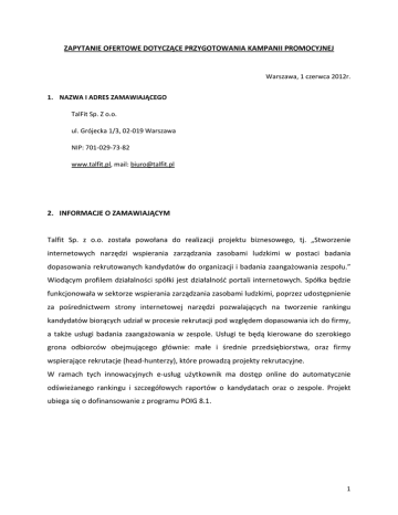 ZAPYTANIE OFERTOWE DOTYCZĄCE PRZYGOTOWANIA KAMPANII PROMOCYJNEJ Warszawa, 1 czerwca 2012r. 1. NAZWA I ADRES ZAMAWIAJĄCEGO TalFit Sp. Z o.o. ul. Grójecka 1/3, 02-019 Warszawa NIP: 701-029-73-82 www.talfit.pl, mail: [email protected] 2. INFORMACJE O ZAMAWIAJĄCYM Talfit Sp. z o.o. została powołana do realizacji projektu biznesowego, tj. „Stworzenie internetowych narzędzi wspierania zarządzania zasobami ludzkimi w postaci badania dopasowania rekrutowanych kandydatów do organizacji i badania zaangażowania zespołu.” Wiodącym profilem działalności spółki jest działalność portali internetowych. Spółka będzie funkcjonowała w sektorze wspierania zarządzania zasobami ludzkimi, poprzez udostępnienie za pośrednictwem strony internetowej narzędzi pozwalających na tworzenie rankingu kandydatów biorących udział w procesie rekrutacji pod względem dopasowania ich do firmy, a także usługi badania zaangażowania w zespole. Usługi te będą kierowane do szerokiego grona odbiorców obejmującego głównie: małe i średnie przedsiębiorstwa, oraz firmy wspierające rekrutacje (head-hunterzy), które prowadzą projekty rekrutacyjne. W ramach tych innowacyjnych e-usług użytkownik ma dostęp online do automatycznie odświeżanego rankingu i szczegółowych raportów o kandydatach oraz o zespole. Projekt ubiega się o dofinansowanie z programu POIG 8.1. 1 3. OPIS PRZEDMIOTU ZAMÓWIENIA TalFit sp. z o.o. w związku z realizacją projektu „Stworzenie internetowych narzędzi wspierania zarządzania zasobami ludzkimi w postaci badania dopasowania rekrutowanych kandydatów do organizacji i badania zaangażowania zespołu”, który ubiega się o współfinansowanie ze środków Unii Europejskiej w ramach Działania 8.1 Programu Operacyjnego Innowacyjna Gospodarka, zwraca się z zapytaniem ofertowym dotyczącym przygotowania kampanii promocyjnej wersji Beta e-usługi oferowanej przez spółkę TalFit. Przedmiotem zamówienia jest przygotowanie kampanii promocyjnej informującej w mediach społecznościowych dla profesjonalistów o nowej e-usłudze TalfitHire - badaniu dopasowania rekrutowanych kandydatów do organizacji. Grupą celową są osoby związane z branżą Human resources. Celem kampanii jest rejestracja nowych klientów w serwisie. W ramach zamówienia zawierać powinny się: • • • • • • • • Przygotowanie planu kampanii w tym określenie jej planowanych rezultatów, Przygotowanie mediaplanu Ciągłą analizę efektów oraz wprowadzanie zmian optymalizacyjnych kampanii reklamowej, Stworzenie landing page, Bannery reklamowe, Mailingi do klientów z branży HR, Copywriting tekstów do kampanii Zawarcie informacji o współfinansowaniu projektu przez UE Oferent może zaproponować dodatkowe elemeny kampanii reklamowej. Szczegółowa specyfikacja i wymagania zostaną przekazane firmie, która zostanie wybrana do wykonania projektu w formie szczegółowego briefu. 3A. TERMIN REALIZACJI Termin realizacji kampanii: 15-30 czerwca 2012 4. KRYTERIA WYBORU Wybór Wykonawcy kampanii e-usługi narzędzia TalFit sp. z o.o. nastąpi w oparciu o następujące kryteria: 2 L.P. Kryterium Maksymalna ilość punktów 1 Cena 50 2 Termin realizacji 30 3 Doświadczenie w przygotowywaniu kampanii internetowych 20 RAZEM 100 5. INFORMACJE OGÓLNE 5.1 Warunki udziału w postępowaniu ofertowym oraz sposób dokonywania oceny tych warunków O udzielenie zamówienia mogą się ubiegać Wykonawcy, którzy: 1) posiadają uprawnienia do wykonywania określonej działalności lub czynności, jeśli przepisy prawa nakładają obowiązek posiadania takich uprawnień, 2) posiadają niezbędną wiedzę, doświadczenia oraz potencjał techniczny, a także dysponują pracownikami zdolnymi do wykonania Zamówienia, 3) znajdują się w sytuacji ekonomicznej i finansowej zapewniającej wykonanie Zamówienia, 4) nie zostali postawieni w stan likwidacji lub upadłości. W postępowaniu nie mogą brać udziału podmioty wskazane w art.24 ustawy Prawo zamówień publicznych (Dz.U. 2004 nr 19 poz.177). 5.2 Oferty należy nadsyłać drogą elektroniczną na adres [email protected] lub faxem 22 349 27 30 lub do dnia 6 czerwca 2012 roku włącznie. Oferta powinna zawierać: • Prezentację z portfolio firmy, • całkowitą cenę za wykonania projektu i ceny poszczególnych elementów kampanii, • zgodę na publikację wyników konkursu w Internecie oraz w dokumentach informacyjnych. 5.3 Przedstawiona oferta powinna być przygotowana na papierze firmowym, posiadać datę sporządzenia oraz powinna być podpisana przez oferenta. 5.4 Rozstrzygnięcie konkursu nastąpi do dnia 8 czerwca 2012 roku. Wszyscy oferenci zostaną poinformowani o wyniku konkursu drogą mailową. Zastrzegamy, iż rozpatrywane będą wyłącznie kompletne oferty. 3 5.5. Zamawiający wybierze ofertę, która uzyska najwyższą liczbę punktów w oparciu o ustalone kryteria. W przypadku uzyskania takiej samej liczby punktów przez dwóch oferentów, o miejscu na liście rankingowej zadecyduje termin złożenia oferty. Z poważaniem Adam Żegota Prezes Zarządu 4