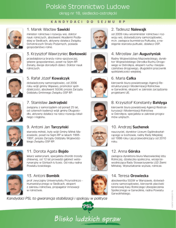 Polskie Stronnictwo Ludowe okręg nr 18, siedlecko-ostrołęcki D O S E J M U R P 1. Marek Wacław Sawicki 2. Tadeusz Nalewajk minister rolnictwa i rozwoju wsi, doktor nauk rolniczych, absolwent Akademii Podlaskiej w Siedlcach, aktywny działacz Związku Ochotniczych Straży Pożarnych, posiada gospodarstwo rolne. od 2009 roku wiceminister rolnictwa i rozwoju wsi, doświadczony samorządowiec, m.in. zastępca burmistrza Pułtuska, a następnie starosta pułtuski, działacz OSP. 3. Krzysztof Wawrzyniec Borkowski 4. Mirosław Jan Augustyniak przedsiębiorca branży rolno-spożywczej, własne gospodarstwo, poseł na Sejm RP. Żonaty, dwoje dorosłych dzieci. Doktor nauk rolniczych. Radny Województwa Mazowieckiego, dyrektor Wojewódzkiego Ośrodka Ruchu Drogowego w Ostrołęce, ekspert ruchu i bezpieczeństwa drogowego, długoletni pracownik spółdzielczości wiejskiej. 5. Rafał Józef Kowalczyk 6. Maria Całka doświadczony samorządowiec, od 2006 roku wójt gminy Wąsewo, promotor spółdzielczości, absolwent SGGW, prezes Zarządu Oddziału Gminnego Związku OSP RP. kierownik biura powiatowego Agencji Restrukturyzacji i Modernizacji Rolnictwa w Garwolinie, ekspert w zakresie zarządzania projektami UE. 7. Stanisław Jastrzębski 8. Krzysztof Konstanty Bałdyga związany z samorządem od ponad 25 lat, od czterech kadencji wójt gminy Długosiodło, aktywny działacz na rzecz rozwoju lokalnego i regionu. kierownik biura powiatowej Agencji Restrukturyzacji i Modernizacji Rolnictwa w Ostrołęce, specjalista w zakresie programów unijnych. 9. Antoni Jan Tarczyński 10. Andrzej Suchenek starosta miński, były wójt Gminy Mińsk Mazowiecki, poseł na Sejm RP w latach 19931997, prezes Zarządu Oddziału Wojewódzkiego Związku OSP RP. nauczyciel, dyrektor Liceum Ogólnokształcącego w Łochowie, radny Rady Miejskiej od 1998 roku i jej przewodniczący od 2010 roku. 11. Dorota Agata Bojdo 12. Anna Górska lekarz weterynarii, specjalista chorób trzody chlewnej, od 12 lat prowadzi gabinet weterynaryjny w Górkach k/Łosic. Od roku radna Powiatu Łosickiego. zastępca dyrektora biura Mazowieckiej Izby Rolniczej, działaczka społeczna, wiceprzewodnicząca Rady Stowarzyszenia LGD Ziemi Mińskiej. Wykształcenie wyższe, rolnicze. 13. Antoni Bombik 14. Teresa Orowiecka prof. zwyczajny Uniwersytetu Przyrodniczo Humanistycznego w Siedlcach, ekspert z zakresu rolnictwa, propagator innowacji w rolnictwie. absolwentka SGGW w Warszawie, doświadczony samorządowiec, kierownik placówki terenowej Kasy Rolniczego Ubezpieczenia Społecznego w Garwolinie, radna Powiatu Garwolińskiego. KOMITET WYBORCZY PSL K A N D Y D A C I Polskie Stronnictwo Ludowe okręg nr 18, siedlecko-ostrołęcki K A N D Y D A C I D O S E J M U R P 15. Marek Aleksander Błaszczak 16. Hanna Wocial doświadczony pracownik administracji samorządowej i rządowej, specjalista w zakresie zarządzania przedsiębiorstwem, prowadzi gospodarstwo rolne. od dwóch kadencji wójt gminy Jakubów, od 26 lat związana z administracją samorządową, zaangażowana w sprawy lokalnej społeczności, działaczka OSP Jakubów. 17. Iwona Księżopolska 18. Dorota Czyż doświadczony samorządowiec, przez dwie kadencje wójt gminy Mokobody, obecnie sekretarz gminy w Urzędzie Gminy Dobre, prezes Zarządu Gminnego Związku OSP RP. nauczycielka, dr nauk humanistycznych w zakresie językoznawstwa, ekspert ds. awansu zawodowego nauczycieli, działa na rzecz poprawności języka polskiego. 19. Magdalena Kurak 20. Agnieszka Barbara Dusińska terapeutka integracji sensorycznej, prowadzi Centrum Wsparcia i Terapii w Ostrowi Mazowieckiej, miłośniczka i pasjonatka pracy z dziećmi. specjalistka ds. rolnictwa, zawodowo związana z przetwórstwem mleczarskim w Wyszkowie, promotorka nowoczesnej produkcji i organizacji rolnej. 21. Anna Agnieszka Wieczorek 22. Mariusz Kozera specjalista ds. polityki zatrudnienia, doświadczona pracownica administracji samorządowej, dyrektor Powiatowego Urzędu Pracy w Węgrowie. doświadczony samorządowiec, były radny Gminy Mińsk Mazowiecki, od siedmiu lat wykładowca w Collegium Mazovia w Siedlcach, zaangażowany w pracę z młodzieżą. 23. Jolanta Krystyna Wakulińska 24. Ryszard Smolarek pracownik administracji samorządowej Gminy Korczew. Wykształcenie średnie techniczne. Mężatka, matka dwóch córek. Zainteresowania: dobra książka. prezes zakładów mięsno-drobiarskich z grupy Polskamp i World Meat Industry. Wcześniej wiceminister rolnictwa i członek Parlamentu Rady Europy w Strasburgu. Prowadzi gospodarstwo rolne. K A N D Y D AT D O S E N AT U R P o k r ę g n r 4 6 Bartłomiej Jarosław Bodio KOMITET WYBORCZY PSL poseł na Sejm, wiceprzewodniczący Komisji Obrony Narodowej, przewodniczący Podkomisji ds. Transportu Lotniczego i Gospodarki Morskiej, ekonomista, menedżer, ekspert w dziedzinie transportu, prezes Zarządu Stowarzyszenia i Klastra Inteligentnych Systemów Transportowych.