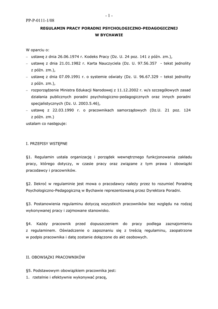 -1PP-P-0111-1/08 REGULAMIN PRACY PORADNI PSYCHOLOGICZNO-PEDAGOGICZNEJ W BYCHAWIE W oparciu o: − ustawę z dnia 26.06.1974 r. Kodeks Pracy (Dz. U. 24 poz. 141 z późn. zm.), − ustawę z dnia 21.01.1982 r. Karta Nauczyciela (Dz. U. 97.56.357 - tekst jednolity z późn. zm.), − ustawę z dnia 07.09.1991 r. o systemie oświaty (Dz. U. 96.67.329 – tekst jednolity z późn. zm.), − rozporządzenie Ministra Edukacji Narodowej z 11.12.2002 r. w/s szczegółowych zasad działania publicznych poradni psychologiczno-pedagogicznych oraz innych poradni specjalistycznych (Dz. U. 2003.5.46), − ustawę z 22.03.1990 r. o pracownikach samorządowych (Dz.U. 21 poz. 124 z późn. zm.) ustalam co następuje: I. PRZEPISY WSTĘPNE §1. Regulamin ustala organizację i porządek wewnętrznego funkcjonowania zakładu pracy, którego dotyczy, w czasie pracy oraz związane z tym prawa i obowiązki pracodawcy i pracowników. §2. Ilekroć w regulaminie jest mowa o pracodawcy naleŜy przez to rozumieć Poradnię Psychologiczno-Pedagogiczną w Bychawie reprezentowaną przez Dyrektora Poradni. §3. Postanowienia regulaminu dotyczą wszystkich pracowników bez względu na rodzaj wykonywanej pracy i zajmowane stanowisko. §4. KaŜdy pracownik przed dopuszczeniem do pracy podlega zaznajomieniu z regulaminem. Oświadczenie o zapoznaniu się z treścią regulaminu, zaopatrzone w podpis pracownika i datę zostanie dołączone do akt osobowych. II. OBOWIĄZKI PRACOWNIKÓW §5. Podstawowym obowiązkiem pracownika jest: 1. rzetelnie i efektywnie wykonywać pracę, -22. stosować się do poleceń przełoŜonych, które dotyczą pracy, jeŜeli nie są one sprzeczne z przepisami prawa lub przepisami wynikającymi ze stosunku pracy (umowa o pracę), 3. przestrzegać ustalonego czasu pracy, 4. przestrzegać regulaminu pracy i ustalonego porządku, 5. przestrzegać przepisów i zasad bezpieczeństwa i higieny pracy oraz przepisów przeciwpoŜarowych, 6. podnosić kwalifikacje zawodowe oraz doskonalić umiejętności pracy, 7. dbać o dobro Poradni i jej mienie, 8. przestrzegać tajemnicy słuŜbowej określonej w odrębnych przepisach, 9. przestrzegać w Poradni zasad współŜycia społecznego, 10. dbać o czystość i porządek, 11. po zakończeniu godzin pracy powierzone dokumenty, materiały i pomoce odpowiednio zabezpieczyć, w sposób gwarantujący zachowanie tajemnicy słuŜbowej i ochronę danych osobowych osób, których akta i materiały dotyczą. §6. Na teren Poradni nie wolno wnosić alkoholu. §7. Wstęp i przebywanie pracownika na terenie Poradni w stanie po uŜyciu alkoholu jest zabronione. §8. Wprowadza się zakaz palenia tytoniu na terenie Poradni. III. CZAS PRACY §9. Czas pracy powinien być w pełni wykorzystany przez kaŜdego pracownika na wykonanie obowiązków słuŜbowych. §10. Praca w Poradni rozpoczyna się o godz. 8.00, a kończy o godz. 16.00. Obowiązuje 5-dniowy tydzień pracy. §11. Dyrektor Poradni moŜe (na podstawie odpowiednich zapisów Karty Nauczyciela) nauczycielom dokształcającym się, wykonującym inne waŜne społecznie zadania lub – jeŜeli to wynika z organizacji pracy w Poradni – ustalić czterodniowy tydzień pracy. -3§12. 1. Czas pracy pracowników pedagogicznych zatrudnionych w pełnym wymiarze zajęć nie moŜe przekraczać 40 godzin na tydzień. 2. W ramach czasu pracy pracownik pedagogiczny obowiązany jest realizować: a) bezpośrednie zajęcia z dziećmi i młodzieŜą oraz na ich rzecz: z rodzicami, nauczycielami i innymi osobami w Poradni lub poza jej terenem (w rejonie działania Poradni) w wymiarze 20 godzin tygodniowo, b) inne czynności wynikające z zadań statutowych Poradni, c) zajęcia i czynności związane z przygotowaniem się do zajęć, samokształceniem i doskonaleniem zawodowym. 3. Godziny rozpoczęcia i kończenia pracy poszczególnych pracowników pedagogicznych bezpośrednio z dziećmi i młodzieŜą oraz na ich rzecz określone są w harmonogramie pracy ustalanym przez Radę Pedagogiczną. §13. Czas pracy pracowników administracyjno-ekonomicznych nie moŜe przekraczać 8 godzin na dobę i 40 godzin na tydzień w rozliczeniu miesięcznym. §14. Czas pracy pracowników zatrudnionych w niepełnym wymiarze czasu pracy ustala się indywidualnie wg umowy o pracę. §15. Obecność w pracy pracownicy potwierdzają podpisem na liście obecności. §16. KaŜdy pracownik powinien stawić się do pracy w takim czasie, by w godzinach rozpoczęcia pracy znajdował się na stanowisku pracy. §17. W przypadku konieczności wyjścia w czasie pracy pracownik obowiązany jest uzyskać zgodę Dyrektora Poradni, jednocześnie pracownik wpisuje swoje nazwisko do ksiąŜki ewidencyjnej nieobecności w czasie godzin pracy. §18. Przebywanie pracowników na terenie zakładu pracy, poza godzinami pracy, moŜe mieć miejsce tylko w uzasadnionych przypadkach, po uzyskaniu zgody przełoŜonego. §19. Soboty, niedziele oraz święta określone odrębnymi przepisami są dniami wolnymi od pracy. -4IV. OBOWIĄZKI PRACODAWCY §20. Pracodawca jest obowiązany w szczególności: 1. określić pracownikowi przydział czynności zgodny z treścią zawartej umowy o pracy, 2. zaznajomić pracownika podejmującego pracę z zakresem jego obowiązków, sposobem wykonywania pracy na wyznaczonym stanowisku pracy oraz jego podstawowymi uprawnieniami, 3. organizować czas pracy w sposób zapewniający pełne wykorzystanie czasu pracy, jak równieŜ osiąganie przez pracowników, przy wykorzystaniu ich uzdolnień i kwalifikacji naleŜytej jakości pracy, 4. zapewnić bezpieczne i higieniczne warunki pracy oraz prowadzić systematyczne szkolenie pracowników w zakresie bezpieczeństwa i higieny pracy, 5. terminowo i prawidłowo wypłacać wynagrodzenie, 6. ułatwić pracownikowi podnoszenie jego kwalifikacji zawodowych, 7. inspirować doskonalenie zawodowe pracowników pedagogicznych Poradni w korelacji z awansem zawodowym. V. URLOPY I ZWOLNIENIA Z PRACY §21. 1. Urlopu wypoczynkowego