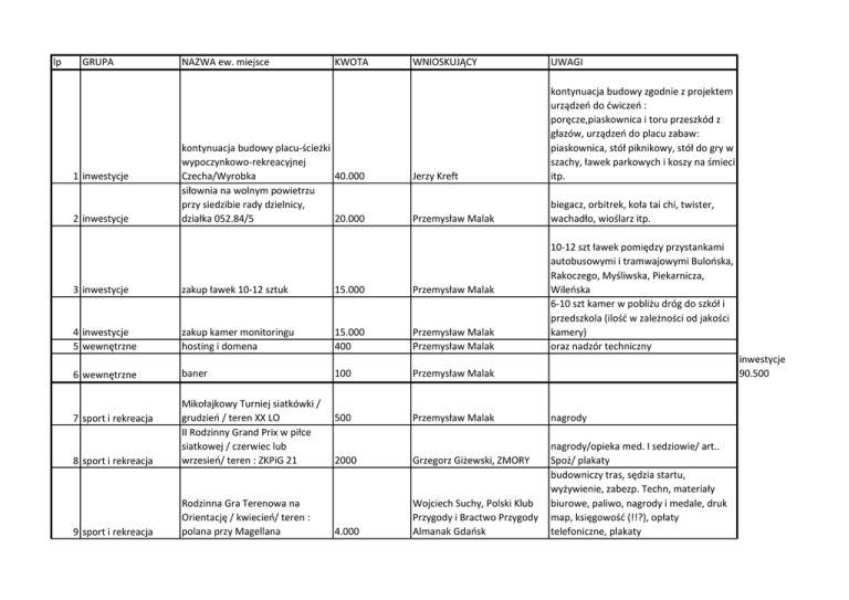 lp GRUPA 1 inwestycje 2 inwestycje NAZWA ew. miejsce KWOTA kontynuacja budowy placu-ścieżki wypoczynkowo-rekreacyjnej Czecha/Wyrobka 40.000 siłownia na wolnym powietrzu przy siedzibie rady dzielnicy, działka 052.84/5 20.000 WNIOSKUJĄCY UWAGI Jerzy Kreft kontynuacja budowy zgodnie z projektem urządzeń do ćwiczeń : poręcze,piaskownica i toru przeszkód z głazów, urządzeń do placu zabaw: piaskownica, stół piknikowy, stół do gry w szachy, ławek parkowych i koszy na śmieci itp. Przemysław Malak biegacz, orbitrek, koła tai chi, twister, wachadło, wioślarz itp. 3 inwestycje zakup ławek 10-12 sztuk 15.000 Przemysław Malak 4 inwestycje 5 wewnętrzne zakup kamer monitoringu hosting i domena 15.000 400 Przemysław Malak Przemysław Malak 6 wewnętrzne baner 100 Przemysław Malak 500 Przemysław Malak 8 sport i rekreacja Mikołajkowy Turniej siatkówki / grudzień / teren XX LO II Rodzinny Grand Prix w piłce siatkowej / czerwiec lub wrzesień/ teren : ZKPiG 21 9 sport i rekreacja Rodzinna Gra Terenowa na Orientację / kwiecień/ teren : polana przy Magellana 7 sport i rekreacja 2000 Grzegorz Giżewski, ZMORY 4.000 Wojciech Suchy, Polski Klub Przygody i Bractwo Przygody Almanak Gdańsk 10-12 szt ławek pomiędzy przystankami autobusowymi i tramwajowymi Bulońska, Rakoczego, Myśliwska, Piekarnicza, Wileńska 6-10 szt kamer w pobliżu dróg do szkół i przedszkola (ilość w zależności od jakości kamery) oraz nadzór techniczny inwestycje 90.500 nagrody nagrody/opieka med. I sedziowie/ art.. Spoż/ plakaty budowniczy tras, sędzia startu, wyżywienie, zabezp. Techn, materiały biurowe, paliwo, nagrody i medale, druk map, księgowość (!!?), opłaty telefoniczne, plakaty 11 sport i rekreacja zajęcia fitnes w ZS 21 - bezpłatne dla wszystkich grup wiekowych 2.000 III Turniej koszykówki chłopców rocznik 2004 / czerwiec / teren: ZKPiG 20 2.000 12 sport i rekreacja Akademia Piłkarska Piecki Migowo 2013 - cykliczne zajęcia ok. 60 zawodników / od stycznia do grudnia / teren : hale i boiska woj. Pomorskiego 8.800 Rafał Andrzejewski STARY WNIOSEK !!! Wynajem sal i boisk 13 sport i rekreacja Mikołajkowy Halowy Turniej Piłki Nożnej o Puchar Rady Dzielnicy /październik-grudzień / teren : hale sportowe 2.000 Rafał Andrzejewski STARY WNIOSEK ! Nagrody, sędziowie, opieka medyczna Rafał Andrzejewski STARY WNIOSEK !!! Nagrody, sędziowie i opieka medyczna Ryszard Muszytowski Beata Peters nagrody/medale i puchary, art. Spoż, opieka medyczna ks. Marcin Blok wynajęcie zamku dmuchanego, trampoliny, zjeżdżalni + nagrody 10 sport i rekreacja 15 sport i rekreacja III Międzydzielnicowy Turniej Piłki Nożnej - Bo Piłka nas Łączy. Ok. 120 zawodników / październikgrudzień/ hale sportowe 2.000 II Mistrzostwa w Karate Okinawa Shorin Ryu (o zasięgu wojewódzkim) / listopad / teren ZSPiG 20 3.000 16 festyny/integracja Festyn Rodzinny (bez względu na wyznanie) przy parafii Miłosierdzia Bożego / czerwiec / teren przy parafii/ ok. 500 osób 2.000 14 sport i rekreacja Przemysław Malak 50 zajęć Jarosław Królikowski - KS Meduza organizacja, opieka medyczna, sędziowie, nagrody/puchary, art.. Spoż. sport 25.800 18 festyny/integracja Andrzejki dla mieszkańców dzielnicy ok. 150-200 osób, listopad / miejsce : Strzelnica lub GPNT 4.500 Wyjazd integracyjny, grzybobranie 2 wyjazdy wrzesień, październik / Bory Tucholskie 2.300 19 festyny/integracja Spotkanie integracyjne seniorów z okazji "Światowych Dni Osób Starszych" / październik/ teren w XX LO / 120-140 osób 1.960 Alicja Chorzelska-Pytlak 20 festyny/integracja Festyn rodzinny teren ZKPiG nr 21 z klasami sportowymi 6.000 Sławomir Grabowski ZAŁĄCZNIK, poczęstunek, nagrody, oprawa muzyczna i program art.. nagrody, opieka medycz i sędziowie, dyplomy i medale, art. Spoż, art. Papierowe i plakaty pomoc społeczna/ochrona 21 środowiska wieczerza wigilijna i śniadania w I i II dzień Bożego Narodzenia dla najuboższej ludności w jadłodajni Zesp. Charytatywnego przy Parafii Bożego Ciała 5.000 Jolanta Klupińska art. Spoż pomoc społeczna/ochrona 22 środowiska śniadanie wielkanocne dla najuboższych w niedzielę i poniedziałek wielkanocny w jadłodajni Zesp. Charytatywnego przy Parafii Bożego Ciała 3.000 Joanna Bulej art.. spoż 23 festyny/integracja Festyn wiosenny i Festyn Jesienny / czerwiec i wrzesień/ teren Przedszkola ul Burgaska/ 60 osób 2.000 Grażyna Musielak , Przedszkole nr 84 nagrody, art. Spoż, dekoracje 17 festyny/integracja Beata Peters zespół/DJ, nagrody, sala + catering, plakaty i dekoracje Przemysław Malak autokar, poczęstunek 24 festyny/integracja pomoc społeczna/ochrona 25 środowiska Spotkanie po sąsiedzku Fundacji "Sprawni Inaczej" / sierpień/ teren ul. Nałkowskiej 6 1.500 pomoc społeczna/ochrona 27 środowiska paczki świąteczne na Boże Narodzenie / grudzień/ 2 ośrodki Caritas / 60-80 osób 3.400 paczki świąteczne na Boże Narodzenie parafia Bożego Ciała / grudzień / teren Dom Parafialny / ok. 60 osób 3.000 gorące śniadania dla najuboższych w jadłodajni Zesp. Charytatywnego przy parafii Bożego Ciała (II-V, IX-XII) / 50 os dziennie 5.000 28 kultura i nauka Spotkania ze sztuką, warsztaty plastyczne, koncerty, wernisaże, wykłady prozdrowotne, porady prawne, poszukiwanie pracy, spotk. z przedst. sztuki i nauki, izba pamięci, wieczerza wigilijna /III-XII / Dom Sąsiedzki 10.000 pomoc społeczna/ochrona 29 środowiska pomoc społeczna/ochrona 30 środowiska sterylizacja, kastracja kotów z terenu dzielnicy i z tymczasowego domu leczenia kotów 5.000 Tydzień Ekologiczny dzielnicy / maj, czerwiec /teren Gimnazjum 28 i okoliczne lasy 2.000 pomoc społeczna/ochrona 26 środowiska Magda Sobczak-Nagy Środowiskowy Dom Samopomocy Sprawni Inaczej zespół i usługi, nagrody Przemysław Malak art..spożywcze Halina Gostomska art.. Spoż Kazimierz Wysokiński art. spoż Florian Wojciechowski wynagrodzenia, nagrody, art. Spoż, biurowe, administracja i księgowość